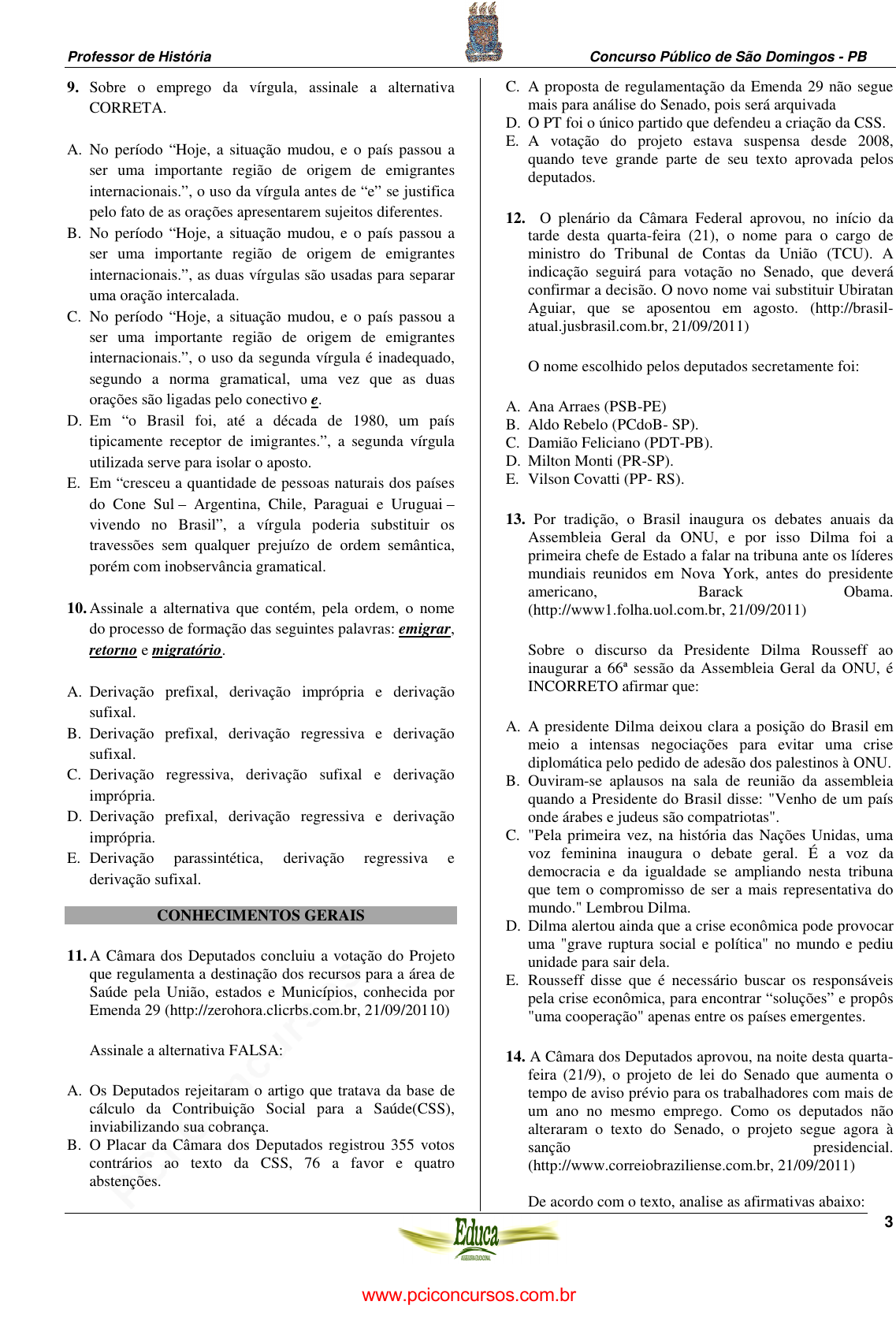 pcimarkpci MjgwNDowMTRjOjViYWU6ODBiMjo0ZjVhOmY1MTY6YzgzNDozOTJh:U3VuLCAyNiBKYW4gMjAyNSAxODoxNjo0MiAtMDMwMA== www.pciconcursos.com.br Professor de História Concurso Público de São Domingos - PB 3 9. Sobre o emprego da vírgula, assinale a alternativa CORRETA. A. No período “Hoje, a situação mudou, e o país passou a ser uma importante região de origem de emigrantes internacionais.”, o uso da vírgula antes de “e” se justifica pelo fato de as orações apresentarem sujeitos diferentes. B. No período “Hoje, a situação mudou, e o país passou a ser uma importante região de origem de emigrantes internacionais.”, as duas vírgulas são usadas para separar uma oração intercalada. C. No período “Hoje, a situação mudou, e o país passou a ser uma importante região de origem de emigrantes internacionais.”, o uso da segunda vírgula é inadequado, segundo a norma gramatical, uma vez que as duas orações são ligadas pelo conectivo e. D. Em “o Brasil foi, até a década de 1980, um país tipicamente receptor de imigrantes.”, a segunda vírgula utilizada serve para isolar o aposto. E. Em “cresceu a quantidade de pessoas naturais dos países do Cone Sul – Argentina, Chile, Paraguai e Uruguai – vivendo no Brasil”, a vírgula poderia substituir os travessões sem qualquer prejuízo de ordem semântica, porém com inobservância gramatical. 10. Assinale a alternativa que contém, pela ordem, o nome do processo de formação das seguintes palavras: emigrar, retorno e migratório. A. Derivação prefixal, derivação imprópria e derivação sufixal. B. Derivação prefixal, derivação regressiva e derivação sufixal. C. Derivação regressiva, derivação sufixal e derivação imprópria. D. Derivação prefixal, derivação regressiva e derivação imprópria. E. Derivação parassintética, derivação regressiva e derivação sufixal. CONHECIMENTOS GERAIS 11. A Câmara dos Deputados concluiu a votação do Projeto que regulamenta a destinação dos recursos para a área de Saúde pela União, estados e Municípios, conhecida por Emenda 29 (http://zerohora.clicrbs.com.br, 21/09/20110) Assinale a alternativa FALSA: A. Os Deputados rejeitaram o artigo que tratava da base de cálculo da Contribuição Social para a Saúde(CSS), inviabilizando sua cobrança. B. O Placar da Câmara dos Deputados registrou 355 votos contrários ao texto da CSS, 76 a favor e quatro abstenções. C. A proposta de regulamentação da Emenda 29 não segue mais para análise do Senado, pois será arquivada D. O PT foi o único partido que defendeu a criação da CSS. E. A votação do projeto estava suspensa desde 2008, quando teve grande parte de seu texto aprovada pelos deputados. 12. O plenário da Câmara Federal aprovou, no início da tarde desta quarta-feira (21), o nome para o cargo de ministro do Tribunal de Contas da União (TCU). A indicação seguirá para votação no Senado, que deverá confirmar a decisão. O novo nome vai substituir Ubiratan Aguiar, que se aposentou em agosto. (http://brasil- atual.jusbrasil.com.br, 21/09/2011) O nome escolhido pelos deputados secretamente foi: A. Ana Arraes (PSB-PE) B. Aldo Rebelo (PCdoB- SP). C. Damião Feliciano (PDT-PB). D. Milton Monti (PR-SP). E. Vilson Covatti (PP- RS). 13. Por tradição, o Brasil inaugura os debates anuais da Assembleia Geral da ONU, e por isso Dilma foi a primeira chefe de Estado a falar na tribuna ante os líderes mundiais reunidos em Nova York, antes do presidente americano, Barack Obama. (http://www1.folha.uol.com.br, 21/09/2011) Sobre o discurso da Presidente Dilma Rousseff ao inaugurar a 66ª sessão da Assembleia Geral da ONU, é INCORRETO afirmar que: A. A presidente Dilma deixou clara a posição do Brasil em meio a intensas negociações para evitar uma crise diplomática pelo pedido de adesão dos palestinos à ONU. B. Ouviram-se aplausos na sala de reunião da assembleia quando a Presidente do Brasil disse: "Venho de um país onde árabes e judeus são compatriotas". C. "Pela primeira vez, na história das Nações Unidas, uma voz feminina inaugura o debate geral. É a voz da democracia e da igualdade se ampliando nesta tribuna que tem o compromisso de ser a mais representativa do mundo." Lembrou Dilma. D. Dilma alertou ainda que a crise econômica pode provocar uma "grave ruptura social e política" no mundo e pediu unidade para sair dela. E. Rousseff disse que é necessário buscar os responsáveis pela crise econômica, para encontrar “soluções” e propôs "uma cooperação" apenas entre os países emergentes. 14. A Câmara dos Deputados aprovou, na noite desta quarta- feira (21/9), o projeto de lei do Senado que aumenta o tempo de aviso prévio para os trabalhadores com mais de um ano no mesmo emprego. Como os deputados não alteraram o texto do Senado, o projeto segue agora à sanção presidencial. (http://www.correiobraziliense.com.br, 21/09/2011) De acordo com o texto, analise as afirmativas abaixo: www.pciconcursos.com.br pcimarkpci MjgwNDowMTRjOjViYWU6ODBiMjo0ZjVhOmY1MTY6YzgzNDozOTJh:U3VuLCAyNiBKYW4gMjAyNSAxODoxNjo0MiAtMDMwMA== www.pciconcursos.com.br Professor de História Concurso Público de São Domingos - PB 4 I. Pelo texto aprovado, o aviso prévio para quem ficar até um ano no trabalho será de 30 dias. II. Para os que permanecerem no trabalho por mais de um ano, será computado ao aviso mais três dias por ano trabalhado. III. O projeto limita o tempo máximo do aviso prévio em 90 dias. Está(ão) CORRETA(s) a(s) afirmativa(s): A. Apenas I. B. Apenas I e II. C. Apenas III. D. Apenas II e III. E. Todas as afirmativas. 15. A Caixa Econômica Federal divulgou nesta terça-feira, 20, uma nota informando sobre a suspensão da veiculação de uma de suas peças publicitárias sobre os 150 anos da instituição, que teve como um dos personagens o escritor Machado de Assis. (http://economia.estadao.com.br, 21/09/2011) A propaganda em comemoração aos 150 anos do banco foi suspensa