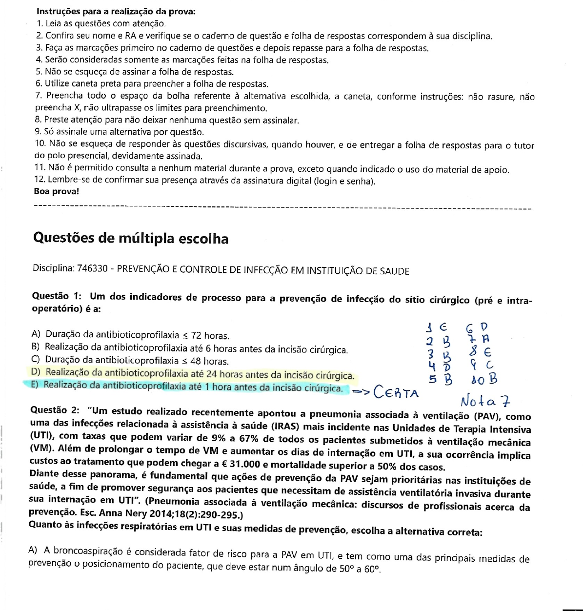 Instruções para a realização da prova: 1. Leia as questões com atenção. 2. Confira seu nome e RA e verifique se o caderno de questão e folha de respostas correspondem à sua disciplina. 3. Faça as marcações primeiro no caderno de questões e depois repasse para a folha de respostas. 4. Serão consideradas somente as marcações feitas na folha de respostas. 5. Não se esqueça de assinar a folha de respostas. 6. Utilize caneta preta para preencher a folha de respostas. 7. Preencha todo o espaço da bolha referente à alternativa escolhida, a caneta, conforme instruções: não rasure, não preencha X, não ultrapasse os limites para preenchimento. 8. Preste atenção para não deixar nenhuma questão sem assinalar. 9. Só assinale uma alternativa por questão. 10. Não se esqueça de responder às questões discursivas, quando houver, e de entregar a folha de respostas para o tutor do polo presencial, devidamente assinada. 11. Não é permitido consulta a nenhum material durante a prova, exceto quando indicado o uso do material de apoio. 12. Lembre-se de confirmar sua presença através da assinatura digital (login e senha). Boa prova! Questões de múltipla escolha Disciplina: 746330 PREVENÇÃO E CONTROLE DE INFECÇÃO EM INSTITUIÇÃO DE SAUDE Questão 1: Um dos indicadores de processo para a prevenção de infecção do sítio cirúrgico (pré e intra- operatório) é a: 1 E D A) Duração da antibioticoprofilaxiaB) Na intubação a manutenção da pressão do cuff da sonda de intubação é importante e deve ser mantida à pressão entre 20-30 ->Correta C) A aspiração orotraqueal é fator importante na prevenção de PAV, e na UTI, deve ser realizada exclusivamente pelo profissional fisioterapeuta, com ausculta pulmonar prévia e instilação de soro fisiológico 0,9% pela cânula. D) A higiene oral dos pacientes nas UTIs tem sido valorizada e apresenta alta adesão dos profissionais como fator de prevenção das PAVs, sendo recomendado o gluconato de clorohexidina em diversas concentrações para esse procedimento. ERRADA! E) A realização de traqueostomia pode ser um fator de prevenção precoce das IRAS e da PAV em UTI, enfatizando que o momento ideal de realizar a traquestomia é de uma semana de intubação orotraqueal. Questão 3: A infecção do trato urinário (ITU) relacionada à assistência à saúde (ITU-RAS), no adulto, é definida como: 1) qualquer infecção ITU relacionada a procedimento urológico; e 2) ITU não relacionada a procedimento urológico diagnosticada após a admissão em serviço de saúde, para a qual não são observadas quaisquer evidências clínicas e a qual não está em seu período de incubação no momento da admissão. Analise as afirmativas a seguir, atribuindo verdadeiro (V) ou falso (F), e depois assinale a alternativa que apresenta a sequência correta. (v) A ITU relacionada a procedimento urológico, mais frequentemente, é o cateterismo vesical. A urina coletada em paciente já cateterizado deve ser aspirada assepticamente do local próprio no circuito coletor e a cultura, processada de forma quantitativa. Não há indicação de troca do cateter para obter urina para cultura. (F) A cultura de ponta de cateter urinário é um teste laboratorial aceitável para o diagnóstico de ITU. ITU-RAS sintomática é definida pela presença de ao menos um dos seguintes critérios: paciente está ou esteve com um cateter vesical (CV) em até 7 dias antes da urinocultura, apresenta urinocultura positiva com 105 UFC/mL de até duas espécies microbianas, com ou sem presença de sintomas como: febre urgência, frequência, disúria, dor suprapúbica ou lombar. A) F,V,F,F B) V,V,F,F Certa C) D) V,F,F,V E) V,V,V,V Questão 4: Para a prevenção da infecção da corrente sanguínea associada ao acesso venoso, são recomendados "pacotes de medidas" que, quando implantados em conjunto, resultam em melhorias da assistência mais substanciais. Leia as afirmativas a seguir e atribua verdadeiro (V) ou falso (F) a cada uma delas. Em seguida, assinale a alternativa que apresenta a sequência correta. São componentes do pacote do cateter venoso central (CVC): Higiene das mãos. Antissepsia com polivinilpirrolidona lodo (PVP-I). Precauções máximas de barreira na passagem do cateter. (r) Escolha do sítio de inserção adequado, com obrigatoriedade para a veia carótida nos casos de cateteres não tunelizados. Reavaliação diária da necessidade de manutenção do cateter, com pronta remoção daqueles desnecessários. A) V,V,V,V,V B) F,F,V,F,V C) D) V,F,V,F,V Certa E) V,V,F,V,V Questão 5: Um olhar acerca da história da Enfermagem demonstra uma contínua preocupação com a qualidade dos cuidados em saúde, sobretudo no que diz respeito às questões de higiene e conforto. A partir de Florence Nightingale, a área de Enfermagem estruturou os principais preceitos que possibilitaram a consolidação da atual compreensão de segurança do paciente. Cabe ressaltar que, recentemente, houve a integração dos conceitos de gestão de riscos no que se compreende por segurança do paciente. Diante da relevância histórica do tema, o Ministério da Saúde, por meio da Portaria n. 529, de 1° de abril de 2013,instituiu o Programa Nacional de Segurança do Paciente (PNSP), com o objetivo de qualificar o cuidado em todos os estabelecimentos de saúde no território nacional. Nesse contexto, infere-se que a segurança do paciente é: A) evento ou circunstância que poderia ter resultado, ou resultou, em dano desnecessário ao paciente. B) A redução, a um mínimo aceitável, do risco de dano desnecessário, associado ao cuidado com a saúde. ->Certa C) incidente ocorrido que resultou em dano físico, social ou psicológico do paciente. D) A ação curativa do dano físico, social ou psicológico causado ao paciente e à sua família. E) resultado do dano físico, social ou psicológico causado ao paciente e à sua família. Questão 6: Baseando-se no modo d