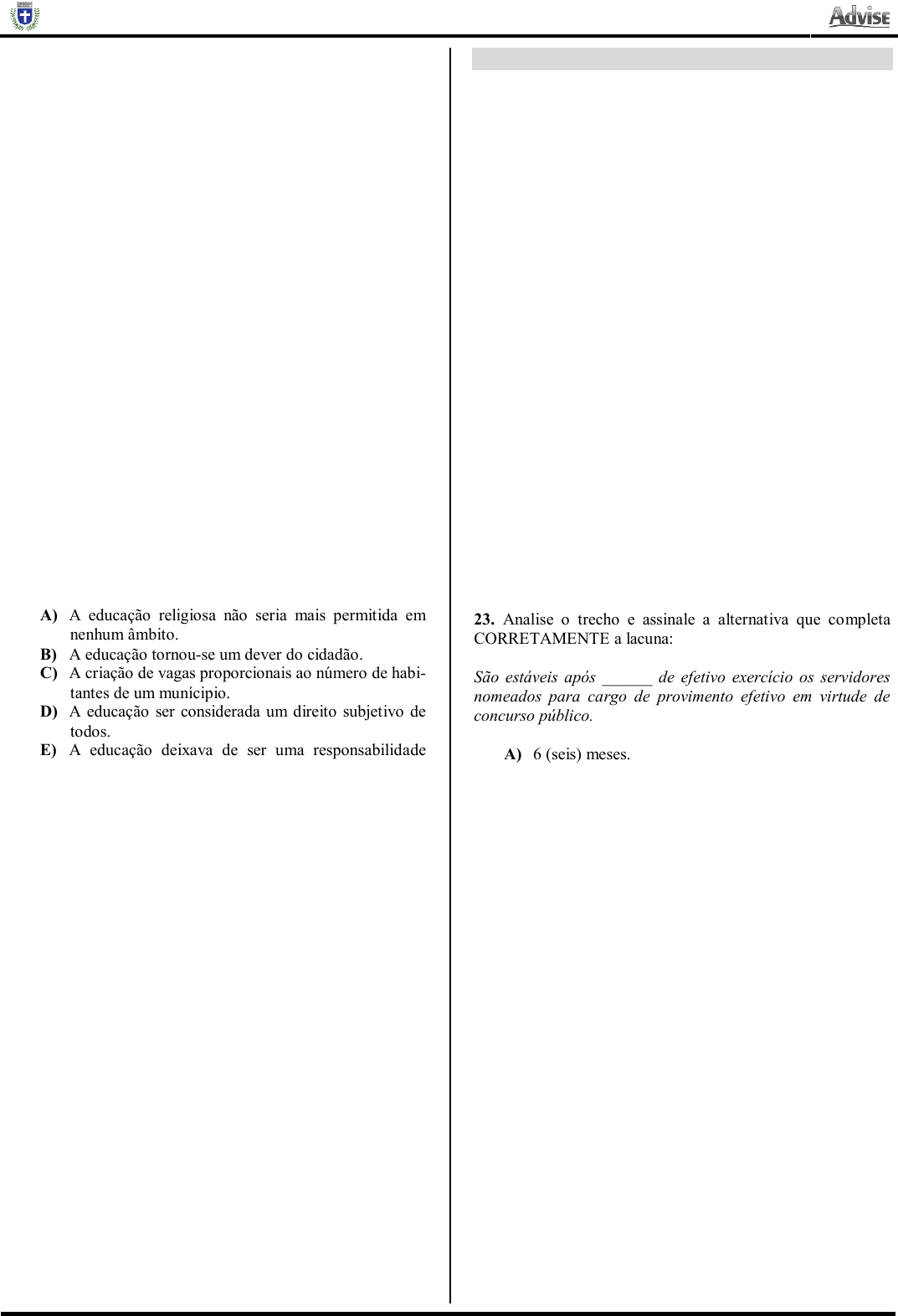 PREFEITURA MUNICIPAL DE BREJÃO (PE) CARGO: PROFESSOR ANOS FINAIS (6º AO 9º ANO – HISTÓRIA) 3 17. Com a implementação da ditadura militar em nosso país (1964-1985) o modelo de alfabetização até então adotado, inspirado nos métodos de Paulo Freire, acabou sendo substi- tuído por um modelo assistencialista denominado de: A) Movimento Brasileiro de Alfabetização (Mobral). B) Alfabetização Solidária. C) Movimento Nacional de Alfabetização (Monal). D) Movimento Solidário de Alfabetização (Mosal). E) Movimento de Alfabetização Nacional (MAN). 18. Dentre as medidas educacionais implementadas ao longo da ditadura militar ficou conhecida aquela que, em 1969, instituía uma disciplina que deveria lidar com temas como cidadania, patriotismo, família. Essa disciplina ficou conheci- da como: A) Educação Militar para Civis. B) Educação Cívica. C) Educação Moral e Cívica D) Educação Militar e Cívica. E) Educação Moral e Civil. 19. Com a constituição de 1988, ficou assentado um direito defendido desde a época das Escolas Novistas. Esse direito garantia que: A) A educação religiosa não seria mais permitida em nenhum âmbito. B) A educação tornou-se um dever do cidadão. C) A criação de vagas proporcionais ao número de habi- tantes de um munícipio. D) A educação ser considerada um direito subjetivo de todos. E) A educação deixava de ser uma responsabilidade pública, o setor privado passou a assumir uma parce- la de responsabilidade também. 20. Em relação a Resolução CD/FNDE nº 17/2013, é IN- CORRETO afirmar que: A) Permite que os recursos transferidos podem ser apli- cados em despesas de manutenção e desenvolvimen- to da Educação Infantil. B) Legisla sobre um apoio financeiro suplementar à manutenção e ao desenvolvimento da educação in- fantil. C) Possui como público alvo crianças de zero a 48 me- ses que já estejam informadas no Censo Escolar da Educação Básica e cujas famílias sejam beneficiárias do Programa Bolsa Família. D) Condições de acessibilidade para as pessoas com de- ficiência deverão ser garantidas. E) A segurança alimentar e nutricional das crianças é considerado como um elemento que não influi no tempo de permanência das crianças na Educação In- fantil. NOÇÕES DE ADMINISTRAÇÃO PÚBLICA 21. Segundo a Constituição Federal, a idade mínima para se eleger ao cargo de Presidente é: A) 18 (dezoito) anos B) 21 (vinte e um) anos C) 24 (vinte e quatro) anos. D) 35 (trinta e cinco) anos. E) 38 (trinta e oito) anos. 22. Segundo a Constituição Federal, compete à União: I- Manter relações com Estados estrangeiros e participar de organizações internacionais; II- Autorizar e fiscalizar a produção e o comércio de material bélico; III- Declarar a guerra e celebrar a paz. Dos itens acima: A) Apenas o item I está correto. B) Apenas os itens I e II estão corretos. C) Apenas os itens I e III estão corretos. D) Apenas os itens II e III estão corretos. E) Todos os itens estão corretos. 23. Analise o trecho e assinale a alternativa que completa CORRETAMENTE a lacuna: São estáveis após ______ de efetivo exercício os servidores nomeados para cargo de provimento efetivo em virtude de concurso público. A) 6 (seis) meses. B) 1 (um) ano. C) 2 (um) anos. D) 3 (três) anos. E) 5 (cinco) anos. 24. Analise os itens a seguir, segundo a Constituição Federal. São brasileiros natos: I- Os nascidos no estrangeiro, de pai brasileiro ou mãe brasi- leira, desde que qualquer deles esteja a serviço da República Federativa do Brasil; II- Os nascidos na República Federativa do Brasil, ainda que de pais estrangeiros, desde que estes não estejam a serviço de seu país; III- Os que, na forma da lei, adquiram a nacionalidade brasi- leira, exigidas aos originários de países de língua portuguesa apenas residência por um ano ininterrupto e idoneidade moral; IV- Os nascidos no estrangeiro de pai brasileiro ou de mãe brasileira, desde que sejam registrados em repartição brasi- leira competente ou venham a residir na República Federati- va do Brasil e optem, em qualquer tempo, depois de atingida a maioridade, pela nacionalidade brasileira. Dos itens acima: www.pciconcursos.com.br PREFEITURA MUNICIPAL DE BREJÃO (PE) CARGO: PROFESSOR ANOS FINAIS (6º AO 9º ANO – HISTÓRIA) 4 A) Apenas o item I está correto B) Apenas os itens I, II e III estão corretos. C) Apenas os itens I, II e IV estão corretos. D) Apenas o item II está correto. E) Todos estão corretos. 25. O alistamento eleitoral e o voto são: A) Escusável para todas as idades. B) Prescindível para os maiores de dezoito anos. C) Dispensável para os maiores de vinte e um anos. D) Obrigatórios para os maiores de dezoito anos. E) Obrigatórios para os maiores de dezesseis anos. 26. Analise o trecho disposto na Constituição Federal e assi- nale a alternativa que completa CORRETAMENTE a lacuna: A fiscalização do Município será exercida pelo Poder _________ Municipal, mediante controle externo, e pelos sistemas de controle interno do Poder __________ Munici- pal, na forma da lei. A) Executivo / Judiciário. B) Legislativo / Judiciário. C) Tributário / Executivo. D) Judiciário / Legislativo. E) Legislativo / Executivo. 27. Considere o fragmento a seguir: É definido pelo Código Penal (artigo 312) como a apropriação, por parte de um funcionário público, de um bem a que ele tenha acesso por causa do cargo que ocupa. Trata-se do: A) Regalo. B) Donativo. C) Latrocínio. D) Peculato. E) Rapino. 28. Ao servidor ocupante, exclusivamente, de cargo em co- missão declarado em lei de livre nomeação e exoneração bem como de outro cargo temporário ou de emprego público, aplica-se o: A) Regime social de previdência privada. B) Regime interno de previdência fechada. C) Regime privado de previdência externa. D) Regime fechado de previdência complementar. E) Regime geral de previdência social. 29. Responda (V) Verdadeiro ou (F) Falso. O serv