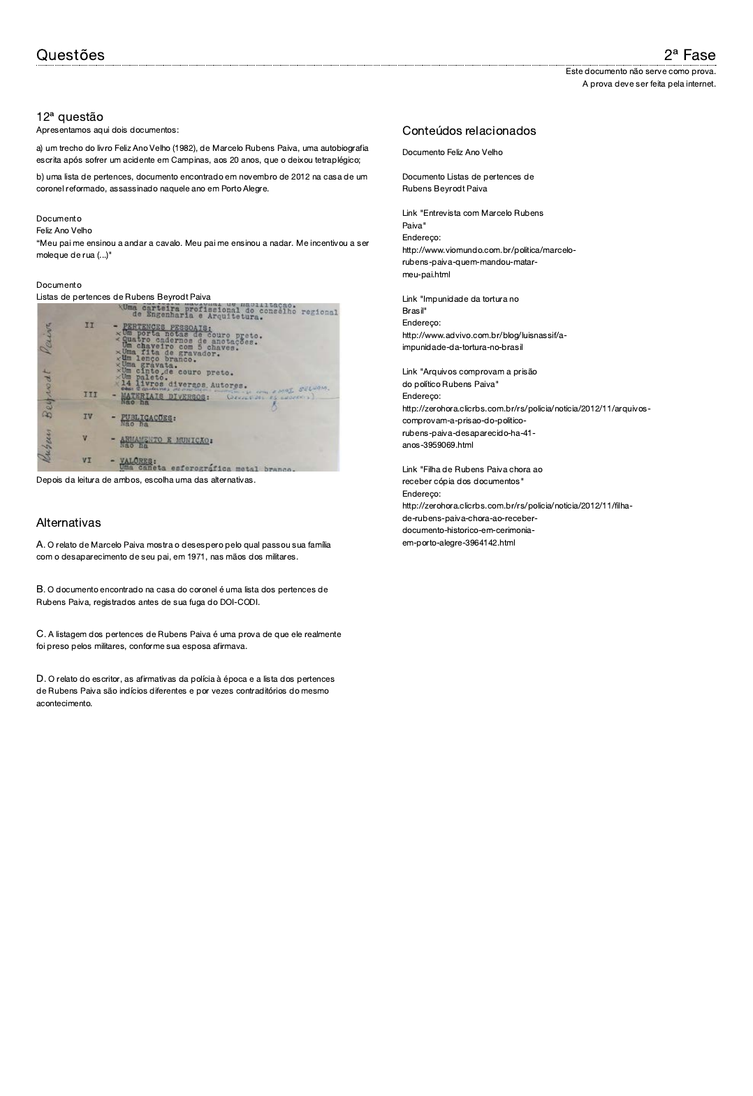 12ª questão A. O relato de Marcelo Paiva mostra o desespero pelo qual passou sua família com o desaparecimento de seu pai, em 1971, nas mãos dos militares. B. O documento encontrado na casa do coronel é uma lista dos pertences de Rubens Paiva, registrados antes de sua fuga do DOI-CODI. C. A listagem dos pertences de Rubens Paiva é uma prova de que ele realmente foi preso pelos militares, conforme sua esposa afirmava. D. O relato do escritor, as afirmativas da polícia à época e a lista dos pertences de Rubens Paiva são indícios diferentes e por vezes contraditórios do mesmo acontecimento. Apresentamos aqui dois documentos: a) um trecho do livro Feliz Ano Velho (1982), de Marcelo Rubens Paiva, uma autobiografia escrita após sofrer um acidente em Campinas, aos 20 anos, que o deixou tetraplégico; b) uma lista de pertences, documento encontrado em novembro de 2012 na casa de um coronel reformado, assassinado naquele ano em Porto Alegre. Documento Feliz Ano Velho “Meu pai me ensinou a andar a cavalo. Meu pai me ensinou a nadar. Me incentivou a ser moleque de rua (...)" Documento Listas de pertences de Rubens Beyrodt Paiva Depois da leitura de ambos, escolha uma das alternativas. Alternativas Conteúdos relacionados Documento Feliz Ano Velho Documento Listas de pertences de Rubens Beyrodt Paiva Link "Entrevista com Marcelo Rubens Paiva" Endereço: http://www.viomundo.com.br/politica/marcelo- rubens-paiva-quem-mandou-matar- meu-pai.html Link "Impunidade da tortura no Brasil" Endereço: http://www.advivo.com.br/blog/luisnassif/a- impunidade-da-tortura-no-brasil Link "Arquivos comprovam a prisão do político Rubens Paiva" Endereço: http://zerohora.clicrbs.com.br/rs/policia/noticia/2012/11/arquivos- comprovam-a-prisao-do-politico- rubens-paiva-desaparecido-ha-41- anos-3959069.html Link "Filha de Rubens Paiva chora ao receber cópia dos documentos" Endereço: http://zerohora.clicrbs.com.br/rs/policia/noticia/2012/11/filha- de-rubens-paiva-chora-ao-receber- documento-historico-em-cerimonia- em-porto-alegre-3964142.html Este documento não serve como prova. A prova deve ser feita pela internet. Questões 2ª Fase 13ª questão A. Há desigualdade de forças entre o poder público e as centenas de indivíduos pobres que viviam em locais populosos no centro da cidade. B. A imagem e os versos trazem como personagens principais dos acontecimentos o cortiço Cabeça de Porco e o prefeito Barata Ribeiro. C. A imagem e os versos omitem a violência envolvida no ato de despejar centenas de pessoas sem nenhum planejamento para realojá-las. D. O planejamento público conseguiu reverter o problema das moradias irregulares no centro da cidade. Em sua edição de fevereiro de 1893 a Revista Illustrada publicou em sua capa uma imagem e texto em referência à demolição do maior cortiço do Rio de Janeiro – localizado na Rua Barão de São Felix n° 154 -, no dia 26 de janeiro. Documento Revista Illustrada, fevereiro de 1893 Interpretando a imagem, os versos e recorrendo a seus conhecimentos sobre a destruição do cortiço Cabeça de Porco escolha uma das alternativas: Alternativas Conteúdos relacionados Documento Revista Illustrada, fevereiro de 1893 Link "Cortiços na ONHB: Questão 03 da 3ª ONHB " Endereço: https://skydrive.live.com/? cid=0983cec4e1d9466f&id=983CEC4E1D9466F%21107&authkey=!AHI6YOlDcXpmuxs Link "Visita aos cortiços do Rio Imperial" Endereço: http://www.unicamp.br/cecult/mapastematicos/corticos/introcort.html Link "Sidney Chalhoub. Cidade Febril: Cortiços e Epidemias na Corte Imperial. São Paulo: Companhia das Letras, 1996." Este documento não serve como prova. A prova deve ser feita pela internet. Questões 2ª Fase 14ª questão A. O ensino e a divulgação dos conhecimentos científicos no Brasil estiveram restritos por um controle da informação reservado às elites econômicas. B. Os conhecimentos científicos têm valor estratégico, e a restrição a seu acesso torna-se uma forma de poder. C. Durante o período colonial, os brasileiros ignoravam a ciência e limitavam-se a receber conteúdos religiosos. D. O crescimento da imprensa, com o surgimento de periódicos, ampliou os canais de divulgação dos conhecimentos científicos no Brasil. Documento Aspectos históricos da divulgação científica no Brasil No Brasil dos séculos XVI, XVII e XVIII (...) atividades científicas ou mesmo de difusão das idéias modernas eram praticamente inexistentes. O país tinha uma baixíssima densidade de população letrada, era mantido sob rígido controle e o ensino, quase unicamente elementar, esteve nas mãos únicas dos jesuítas até meados do século XVIII (...)" Escolha uma das alternativas: Alternativas Conteúdos relacionados Documento Aspectos históricos da divulgação científica no Brasil Este documento não serve como prova. A prova deve ser feita pela internet. Questões 2ª Fase 15ª questão A. Era um método inovador por propor um momento de transição entre a família e o ensino formal, além de trazer a ideia de um aprendizado pleno. B. Embora tenha alcançado sucesso e sido implantada em outros colégios, esta proposta não ocorreu em larga escala, pois se apresentava como uma ameaça para outras formas de educação já consolidadas. C. Era um projeto voltado ao ensino das crianças de 3 a 6 anos e que tinha como bases teóricas e pedagógicas os ensinamentos de educadores alemães e suíços. D. Retirava a rigidez e a disciplina correntes na prática de ensino do século XIX, tornado a escola infantil um espaço de brincadeiras e não de aprendizagem. Documento A primeira escola “[...] em 1875, um jardim de infância causou uma verdadeira reviravolta na educação brasileira, como reconheceu um artigo no jornal Cruzeiro quatro anos depois. O texto mencionava ‘um chalé expressamente construído e mobiliado para o Jardim de Crianças’ (...)" Sobre o Jardim de Crianças de Menezes Vieira é possível afirmar que: Alternativas Conteúdos relaci