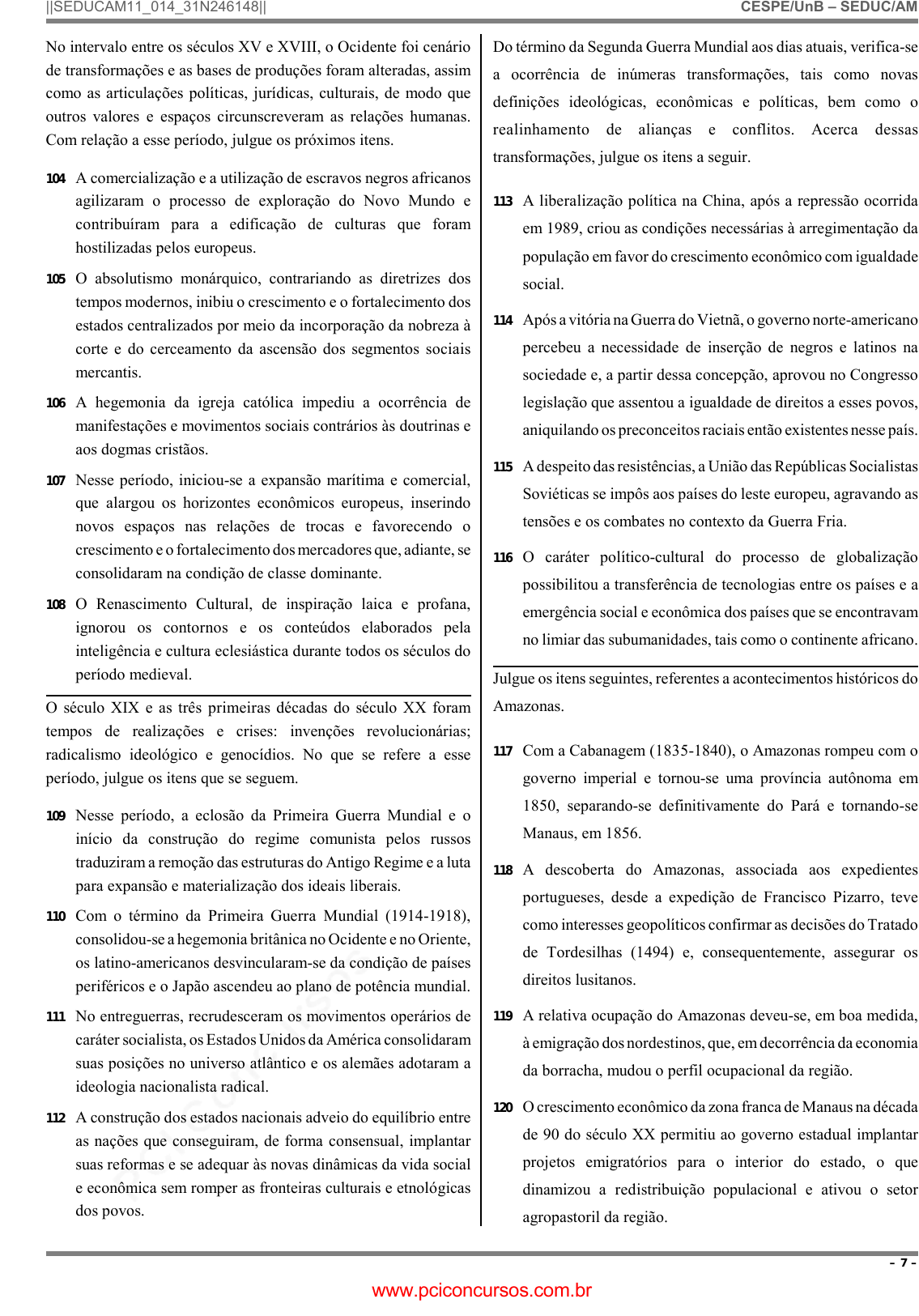 pcimarkpci MjgwNDowMTRjOjViYWU6ODBiMjo0ZjVhOmY1MTY6YzgzNDozOTJh:U3VuLCAyNiBKYW4gMjAyNSAxODo1MDozOSAtMDMwMA== www.pciconcursos.com.br ||SEDUCAM11_014_31N246148|| CESPE/UnB – SEDUC/AM – 7 – No intervalo entre os séculos XV e XVIII, o Ocidente foi cenário de transformações e as bases de produções foram alteradas, assim como as articulações políticas, jurídicas, culturais, de modo que outros valores e espaços circunscreveram as relações humanas. Com relação a esse período, julgue os próximos itens. 104 A comercialização e a utilização de escravos negros africanos agilizaram o processo de exploração do Novo Mundo e contribuíram para a edificação de culturas que foram hostilizadas pelos europeus. 105 O absolutismo monárquico, contrariando as diretrizes dos tempos modernos, inibiu o crescimento e o fortalecimento dos estados centralizados por meio da incorporação da nobreza à corte e do cerceamento da ascensão dos segmentos sociais mercantis. 106 A hegemonia da igreja católica impediu a ocorrência de manifestações e movimentos sociais contrários às doutrinas e aos dogmas cristãos. 107 Nesse período, iniciou-se a expansão marítima e comercial, que alargou os horizontes econômicos europeus, inserindo novos espaços nas relações de trocas e favorecendo o crescimento e o fortalecimento dos mercadores que, adiante, se consolidaram na condição de classe dominante. 108 O Renascimento Cultural, de inspiração laica e profana, ignorou os contornos e os conteúdos elaborados pela inteligência e cultura eclesiástica durante todos os séculos do período medieval. O século XIX e as três primeiras décadas do século XX foram tempos de realizações e crises: invenções revolucionárias; radicalismo ideológico e genocídios. No que se refere a esse período, julgue os itens que se seguem. 109 Nesse período, a eclosão da Primeira Guerra Mundial e o início da construção do regime comunista pelos russos traduziram a remoção das estruturas do Antigo Regime e a luta para expansão e materialização dos ideais liberais. 110 Com o término da Primeira Guerra Mundial (1914-1918), consolidou-se a hegemonia britânica no Ocidente e no Oriente, os latino-americanos desvincularam-se da condição de países periféricos e o Japão ascendeu ao plano de potência mundial. 111 No entreguerras, recrudesceram os movimentos operários de caráter socialista, os Estados Unidos da América consolidaram suas posições no universo atlântico e os alemães adotaram a ideologia nacionalista radical. 112 A construção dos estados nacionais adveio do equilíbrio entre as nações que conseguiram, de forma consensual, implantar suas reformas e se adequar às novas dinâmicas da vida social e econômica sem romper as fronteiras culturais e etnológicas dos povos. Do término da Segunda Guerra Mundial aos dias atuais, verifica-se a ocorrência de inúmeras transformações, tais como novas definições ideológicas, econômicas e políticas, bem como o realinhamento de alianças e conflitos. Acerca dessas transformações, julgue os itens a seguir. 113 A liberalização política na China, após a repressão ocorrida em 1989, criou as condições necessárias à arregimentação da população em favor do crescimento econômico com igualdade social. 114 Após a vitória na Guerra do Vietnã, o governo norte-americano percebeu a necessidade de inserção de negros e latinos na sociedade e, a partir dessa concepção, aprovou no Congresso legislação que assentou a igualdade de direitos a esses povos, aniquilando os preconceitos raciais então existentes nesse país. 115 A despeito das resistências, a União das Repúblicas Socialistas Soviéticas se impôs aos países do leste europeu, agravando as tensões e os combates no contexto da Guerra Fria. 116 O caráter político-cultural do processo de globalização possibilitou a transferência de tecnologias entre os países e a emergência social e econômica dos países que se encontravam no limiar das subumanidades, tais como o continente africano. Julgue os itens seguintes, referentes a acontecimentos históricos do Amazonas. 117 Com a Cabanagem (1835-1840), o Amazonas rompeu com o governo imperial e tornou-se uma província autônoma em 1850, separando-se definitivamente do Pará e tornando-se Manaus, em 1856. 118 A descoberta do Amazonas, associada aos expedientes portugueses, desde a expedição de Francisco Pizarro, teve como interesses geopolíticos confirmar as decisões do Tratado de Tordesilhas (1494) e, consequentemente, assegurar os direitos lusitanos. 119 A relativa ocupação do Amazonas deveu-se, em boa medida, à emigração dos nordestinos, que, em decorrência da economia da borracha, mudou o perfil ocupacional da região. 120 O crescimento econômico da zona franca de Manaus na década de 90 do século XX permitiu ao governo estadual implantar projetos emigratórios para o interior do estado, o que dinamizou a redistribuição populacional e ativou o setor agropastoril da região. www.pciconcursos.com.br pcimarkpci MjgwNDowMTRjOjViYWU6ODBiMjo0ZjVhOmY1MTY6YzgzNDozOTJh:U3VuLCAyNiBKYW4gMjAyNSAxOTowMzo1MSAtMDMwMA== www.pciconcursos.com.br ||SEDUCAM11_CBCCNS_001_01N445340|| CESPE/UnB – SEDUC/AM – 5 – CONHECIMENTOS COMPLEMENTARES Considerando as contribuições da sociologia, da filosofia e da psicologia para a educação, julgue os itens a seguir. 51 Carl Rogers propôs processos de ensino com base no estabelecimento de uma sequência rígida de etapas a ser seguida pelo professor no exercício de seu papel de facilitador da aprendizagem. 52 Louis Althusser, herdeiro intelectual de Karl Marx, elaborou crítica radical aos sistemas de ensino, denunciando o seu caráter de classe e de aparelho ideológico do Estado. 53 Uma das contribuições de Célestin Freinet para a educação diz respeito ao uso de grande quantidade de material didático, tais como cubos, sólidos, cartões, em atividades voltad