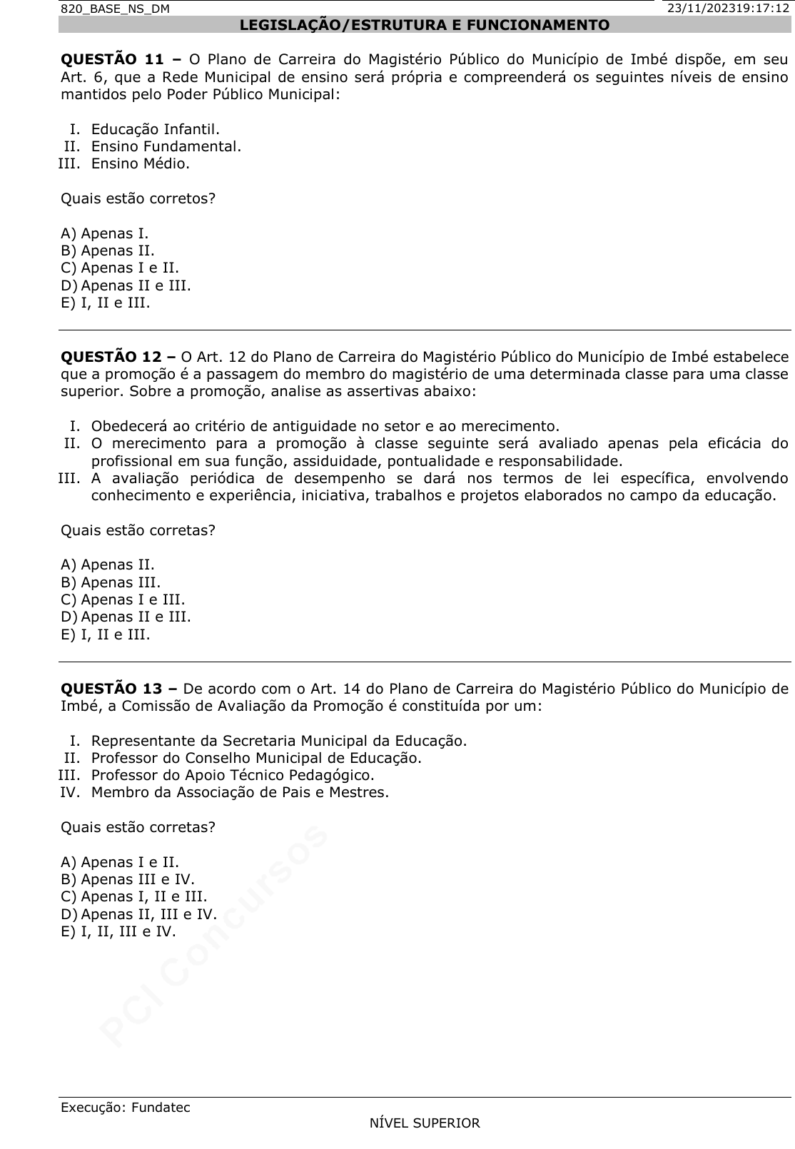 pcimarkpci MjgwNDowMTRjOjViYWU6ODBiMjo0ZjVhOmY1MTY6YzgzNDozOTJh:U3VuLCAyNiBKYW4gMjAyNSAyMDo1NDoxMSAtMDMwMA== www.pciconcursos.com.br 820_BASE_NS_DM Execução: Fundatec NÍVEL SUPERIOR 23/11/202319:17:12 LEGISLAÇÃO/ESTRUTURA E FUNCIONAMENTO QUESTÃO 11 – O Plano de Carreira do Magistério Público do Município de Imbé dispõe, em seu Art. 6, que a Rede Municipal de ensino será própria e compreenderá os seguintes níveis de ensino mantidos pelo Poder Público Municipal: I. Educação Infantil. II. Ensino Fundamental. III. Ensino Médio. Quais estão corretos? A) Apenas I. B) Apenas II. C) Apenas I e II. D) Apenas II e III. E) I, II e III. QUESTÃO 12 – O Art. 12 do Plano de Carreira do Magistério Público do Município de Imbé estabelece que a promoção é a passagem do membro do magistério de uma determinada classe para uma classe superior. Sobre a promoção, analise as assertivas abaixo: I. Obedecerá ao critério de antiguidade no setor e ao merecimento. II. O merecimento para a promoção à classe seguinte será avaliado apenas pela eficácia do profissional em sua função, assiduidade, pontualidade e responsabilidade. III. A avaliação periódica de desempenho se dará nos termos de lei específica, envolvendo conhecimento e experiência, iniciativa, trabalhos e projetos elaborados no campo da educação. Quais estão corretas? A) Apenas II. B) Apenas III. C) Apenas I e III. D) Apenas II e III. E) I, II e III. QUESTÃO 13 – De acordo com o Art. 14 do Plano de Carreira do Magistério Público do Município de Imbé, a Comissão de Avaliação da Promoção é constituída por um: I. Representante da Secretaria Municipal da Educação. II. Professor do Conselho Municipal de Educação. III. Professor do Apoio Técnico Pedagógico. IV. Membro da Associação de Pais e Mestres. Quais estão corretas? A) Apenas I e II. B) Apenas III e IV. C) Apenas I, II e III. D) Apenas II, III e IV. E) I, II, III e IV. pcimarkpci MjgwNDowMTRjOjViYWU6ODBiMjo0ZjVhOmY1MTY6YzgzNDozOTJh:U3VuLCAyNiBKYW4gMjAyNSAyMDo1NDoxMSAtMDMwMA== www.pciconcursos.com.br 820_BASE_NS_DM Execução: Fundatec NÍVEL SUPERIOR 23/11/202319:17:12 QUESTÃO 14 – Segundo o Art. 109 da Lei Orgânica Municipal de Imbé, o dever do município com a educação será efetivado mediante a garantia de, EXCETO: A) Ensino fundamental obrigatório e gratuito assegurado, inclusive para todos os que a ele não tiveram acesso na idade própria. B) Atendimento educacional aos portadores de deficiências e aos superdotados, exclusivamente através de convênios com entidades especializadas no atendimento a esse público específico. C) Oferta de ensino noturno regular, adequado às condições do educando. D) Atendimento em creches e pré-escola às crianças de zero a seis anos de idade. E) Atendimento pedagógico comprometido com o desenvolvimento de raciocínio e do senso crítico, com o conhecimento, valorização e humanização do meio em que vive, o que implicará na formação de uma consciência humanística, filosófica e turística. QUESTÃO 15 – O Art. 4 do Plano de Carreira do Magistério do Município de Imbé estabelece como princípios básicos da carreira do magistério: I. Dedicação ao magistério. II. Qualidades pecuniárias. III. Atualização constante. Quais estão corretas? A) Apenas I. B) Apenas I e II. C) Apenas I e III. D) Apenas II e III. E) I, II e III. QUESTÃO 16 – De acordo com o Art. 65 do Regime Jurídico dos Servidores do Munícipio de Imbé, será concedida licença ao servidor: I. Por motivo de doença em pessoa da família. II. Para tratamento de doença profissional ou em decorrência de acidente de trabalho. III. Por motivo do afastamento do cônjuge servidor militar. Quais estão corretas? A) Apenas I. B) Apenas I e II. C) Apenas I e III. D) Apenas II e III. E) I, II e III. QUESTÃO 17 – Entre os princípios que integram as Diretrizes Curriculares Nacionais para a Educação das Relações Étnico-Raciais e para o Ensino de História e Cultura Afro-Brasileira e Africana, está o do fortalecimento de identidades e de direitos. Esse princípio deve conduzir ao(à), EXCETO: A) Desencadeamento de processo de afirmação de identidades, de historicidade negada ou distorcida. B) Esclarecimento a respeito de equívocos quanto a uma identidade humana universal. C) Combate à privação e violação de direitos. D) Estímulo a imagens negativas forjadas por diferentes meios de comunicação contra os negros e os povos indígenas. E) Ampliação do acesso a informações sobre a diversidade da nação brasileira e sobre a recriação das identidades, provocada por relações étnico-raciais. QUESTÃO 18 – NÃO corresponde a uma modalidade da Educação Básica a Educação: A) Infantil. B) À Distância. C) Profissional e Tecnológica. D) De Jovens e Adultos. E) Escolar Quilombola.