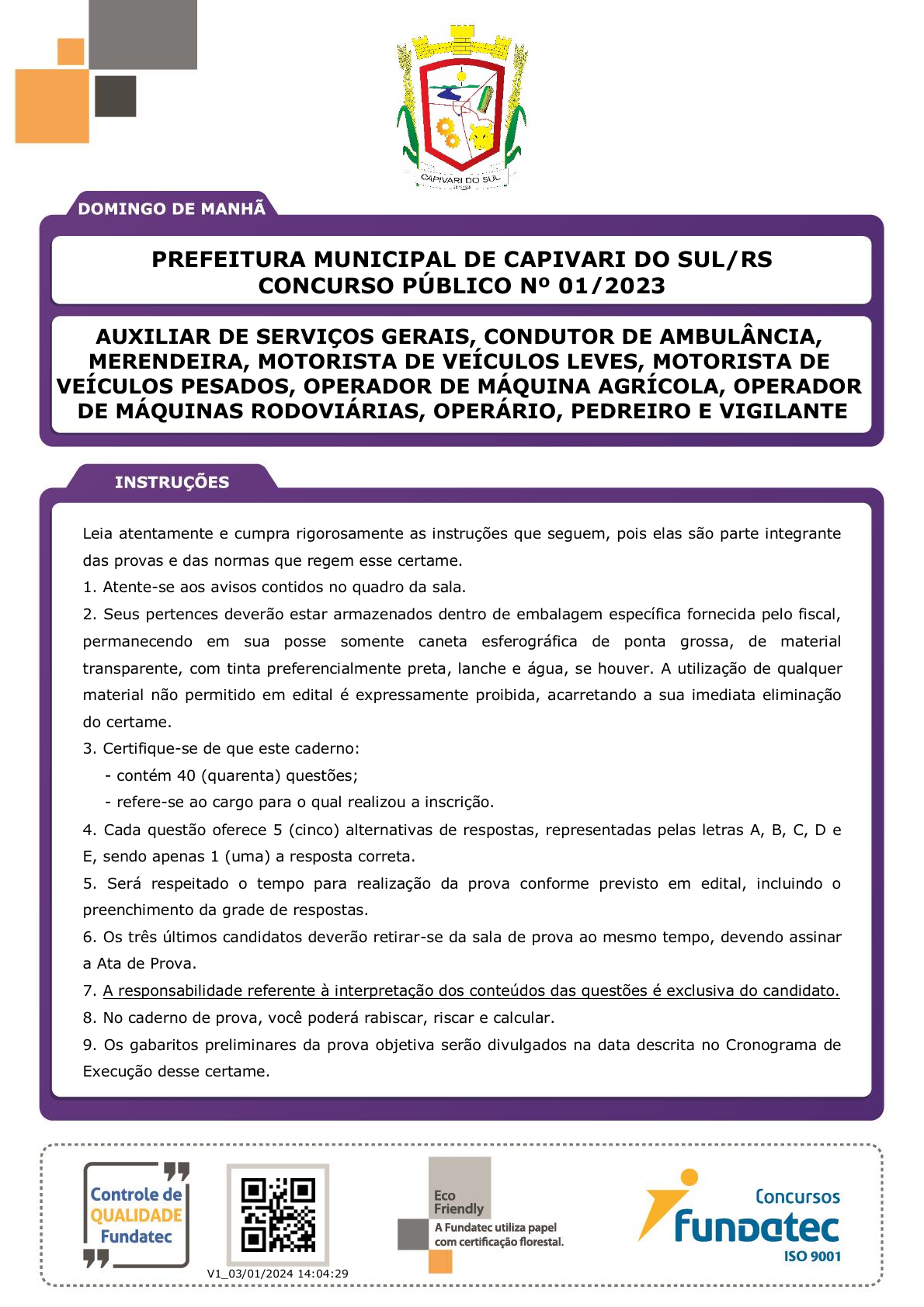 pcimarkpci MDAwMDowMDAwOjAwMDA6MDAwMDowMDAwOmZmZmY6OTU0ZTpiYTc5:U3VuLCAwMiBGZWIgMjAyNSAwMzoyNDozNCAtMDMwMA== www.pciconcursos.com.br PREFEITURA MUNICIPAL DE CAPIVARI DO SUL/RS CONCURSO PÚBLICO Nº 01/2023 LOGO CLIENTE Leia atentamente e cumpra rigorosamente as instruções que seguem, pois elas são parte integrante das provas e das normas que regem esse certame. 1. Atente-se aos avisos contidos no quadro da sala. 2. Seus pertences deverão estar armazenados dentro de embalagem específica fornecida pelo fiscal, permanecendo em sua posse somente caneta esferográfica de ponta grossa, de material transparente, com tinta preferencialmente preta, lanche e água, se houver. A utilização de qualquer material não permitido em edital é expressamente proibida, acarretando a sua imediata eliminação do certame. 3. Certifique-se de que este caderno: - contém 40 (quarenta) questões; - refere-se ao cargo para o qual realizou a inscrição. 4. Cada questão oferece 5 (cinco) alternativas de respostas, representadas pelas letras A, B, C, D e E, sendo apenas 1 (uma) a resposta correta. 5. Será respeitado o tempo para realização da prova conforme previsto em edital, incluindo o preenchimento da grade de respostas. 6. Os três últimos candidatos deverão retirar-se da sala de prova ao mesmo tempo, devendo assinar a Ata de Prova. 7. A responsabilidade referente à interpretação dos conteúdos das questões é exclusiva do candidato. 8. No caderno de prova, você poderá rabiscar, riscar e calcular. 9. Os gabaritos preliminares da prova objetiva serão divulgados na data descrita no Cronograma de Execução desse certame. QR code V1_03/01/2024 14:04:29 AUXILIAR DE SERVIÇOS GERAIS, CONDUTOR DE AMBULÂNCIA, MERENDEIRA, MOTORISTA DE VEÍCULOS LEVES, MOTORISTA DE VEÍCULOS PESADOS, OPERADOR DE MÁQUINA AGRÍCOLA, OPERADOR DE MÁQUINAS RODOVIÁRIAS, OPERÁRIO, PEDREIRO E VIGILANTE pcimarkpci MDAwMDowMDAwOjAwMDA6MDAwMDowMDAwOmZmZmY6OTU0ZTpiYTc5:U3VuLCAwMiBGZWIgMjAyNSAwMzoyNDozNCAtMDMwMA== www.pciconcursos.com.br 835_BASE_NFC_DM Execução: Fundatec NÍVEL FUNDAMENTAL COMPLETO 26/1/202409:46:21 LÍNGUA PORTUGUESA Porto Alegre tem noite de pavor com temporal violento e destrutivo Por MetSul.com 01 02 03 04 05 06 07 08 09 10 11 12 13 14 15 16 17 18 19 20 21 “Nunca tinha visto nada igual”. Essa foi a reação de muitas pessoas em Porto Alegre diante do temporal violento que se abateu sobre a capital gaúcha por volta das 22h do dia 16 de janeiro. Foi uma das tempestades mais fortes que atingiu a cidade, com chuva excessiva em curto período, granizo e um intenso vendaval. O Aeroporto Salgado Filho registrou ventos de 89 km/h, mesma velocidade observada no Jardim Botânico. Canoas, na base aérea, teve ventos de 107 km/h. Dentro da cidade, por conta das construções, o vento acelera e sopra mais forte, principalmente em andares altos de prédios. A chuva, que veio acompanhada de muitos raios e granizo em diversos bairros, foi extrema. Somente em uma hora, durante o temporal, a chuva, que foi torrencial, acumulou de 60 mm a 70 mm em diferentes pontos da cidade, ou seja, em apenas 60 minutos choveu a metade da média histórica de precipitação de janeiro inteiro na cidade, que é de 120,7 mm. O temporal foi um dos maiores da história recente da capital, semelhante aos episódios de tempo severo de outubro de 2015 e janeiro de 2016, anos de forte El Niño. No temporal de agora, o vento atingiu, com grande força, áreas que escaparam do pior em 2016, como as zonas Norte e Sul da cidade. Mas, por que um temporal tão violento ocorreu em Porto Alegre Por três dias, as previsões meteorológicas alertavam para um cenário complexo e pouco comum no verão, que poderia trazer condições perigosas. Uma área de baixa pressão, em níveis médios e altos da atmosfera (“baixa fria”), avançou durante a terça-feira, vinda do Chile, para o Oeste e o Centro da Argentina, rumando para o Uruguai e vindo, depois, para o sul do Brasil, gerando chuva intensa e excessiva, com temporais fortes de vento e granizo. (Disponível em: https://metsul.com/2024-01-17-temporal-porto-alegre-vendaval/ – texto adaptado especialmente para esta prova). QUESTÃO 01 – A ideia principal do texto é: A) Fazer somente um comparativo entre o temporal deste ano com o ocorrido em 2016. B) Informar sobre os fortes ventos nos aeroportos do Brasil. C) Explicar o fenômeno do El Niño, ocorrido na Argentina. D) Informar sobre o temporal que ocorreu na capital gaúcha. E) Apresentar as condições climáticas de todo o país. QUESTÃO 02 – Sobre o texto, assinale a alternativa INCORRETA. A) As condições que levaram ao temporal na capital gaúcha vieram de outras localidades. B) O texto não informa, por exemplo, o que ocorreu em outros regiões do Brasil. C) O temporal não foi dos mais fortes em Porto Alegre. D) As previsões meteorológicas alertaram para o perigo do temporal. E) A reação das pessoas foi de não terem visto nada como o que ocorreu em 16 de janeiro. QUESTÃO 03 – A figura da linha 16 pode ser substituída corretamente por qual sinal de pontuação? A) Ponto e vírgula. B) Vírgula. C) Travessão. D) Ponto de interrogação. E) Ponto de exclamação. pcimarkpci MDAwMDowMDAwOjAwMDA6MDAwMDowMDAwOmZmZmY6OTU0ZTpiYTc5:U3VuLCAwMiBGZWIgMjAyNSAwMzoyNDozNCAtMDMwMA== www.pciconcursos.com.br 835_BASE_NFC_DM Execução: Fundatec NÍVEL FUNDAMENTAL COMPLETO 26/1/202409:46:21 QUESTÃO 04 – A palavra “extrema” (linha 09) pode ser substituída, sem alteração de sentido no texto, por: A) Delicada. B) Suave. C) Intensa. D) Sossegada. E) Pacífica. QUESTÃO 05 – Os numerais “60” e “70”, presentes na linha 10 do texto, são considerados numerais: A) Cardinais. B) Ordinais. C) Fracionários. D) Multiplicativos. E) Coletivos. QUESTÃO 06 – No trecho “A chuva, que veio acompanhada de muitos raios e granizo em diversos bairros, foi extrema”, retirado do texto, se colocarmos a palavra sublinhada no plural, 