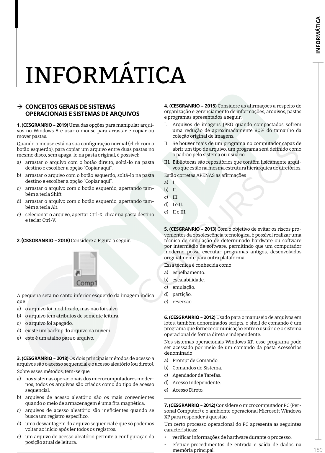 Jo ao M at eu s M en ez es d os S an to s - 03 5.1 00 .12 5- 50 IN FO RM Á TI CA 189 INFORMÁTICA Æ CONCEITOS GERAIS DE SISTEMAS OPERACIONAIS E SISTEMAS DE ARQUIVOS 1. (CESGRANRIO – 2019) Uma das opções para manipular arqui- vos no Windows 8 é usar o mouse para arrastar e copiar ou mover pastas. Quando o mouse está na sua configuração normal (click com o botão esquerdo), para copiar um arquivo entre duas pastas no mesmo disco, sem apagá-lo na pasta original, é possível: a) arrastar o arquivo com o botão direito, soltá-lo na pasta destino e escolher a opção “Copiar aqui”. b) arrastar o arquivo com o botão esquerdo, soltá-lo na pasta destino e escolher a opção “Copiar aqui”. c) arrastar o arquivo com o botão esquerdo, apertando tam- bém a tecla Shift. d) arrastar o arquivo com o botão esquerdo, apertando tam- bém a tecla Alt. e) selecionar o arquivo, apertar Ctrl-X, clicar na pasta destino e teclar Ctrl-V. 2. (CESGRANRIO – 2018) Considere a Figura a seguir. A pequena seta no canto inferior esquerdo da imagem indica que a) o arquivo foi modificado, mas não foi salvo. b) o arquivo tem atributos de somente leitura. c) o arquivo foi apagado. d) existe um backup do arquivo na nuvem. e) este é um atalho para o arquivo. 3. (CESGRANRIO – 2018) Os dois principais métodos de acesso a arquivos são o acesso sequencial e o acesso aleatório (ou direto). Sobre esses métodos, tem-se que a) nos sistemas operacionais dos microcomputadores moder- nos, todos os arquivos são criados como do tipo de acesso sequencial. b) arquivos de acesso aleatório são os mais convenientes quando o meio de armazenagem é uma fita magnética. c) arquivos de acesso aleatório são ineficientes quando se busca um registro específico. d) uma desvantagem do arquivo sequencial é que só podemos voltar ao início após ler todos os registros. e) um arquivo de acesso aleatório permite a configuração da posição atual de leitura. 4. (CESGRANRIO – 2015) Considere as afirmações a respeito de organização e gerenciamento de informações, arquivos, pastas e programas apresentados a seguir. I. Arquivos de imagens JPEG quando compactados sofrem uma redução de aproximadamente 80% do tamanho da coleção original de imagens. II. Se houver mais de um programa no computador capaz de abrir um tipo de arquivo, um programa será definido como o padrão pelo sistema ou usuário. III. Bibliotecas são repositórios que contêm fisicamente arqui- vos que estão na mesma estrutura hierárquica de diretórios. Estão corretas APENAS as afirmações a) I b) II. c) III. d) I e II. e) II e III. 5. (CESGRANRIO – 2013) Com o objetivo de evitar os riscos pro- venientes da obsolescência tecnológica, é possível realizar uma técnica de simulação de determinado hardware ou software por intermédio de software, permitindo que um computador moderno possa executar programas antigos, desenvolvidos originalmente para outra plataforma. Essa técnica é conhecida como a) espelhamento. b) escalabilidade. c) emulação. d) partição. e) reversão. 6. (CESGRANRIO – 2012) Usado para o manuseio de arquivos em lotes, também denominados scripts, o shell de comando é um programa que fornece comunicação entre o usuário e o sistema operacional de forma direta e independente. Nos sistemas operacionais Windows XP, esse programa pode ser acessado por meio de um comando da pasta Acessórios denominado a) Prompt de Comando. b) Comandos de Sistema. c) Agendador de Tarefas. d) Acesso Independente. e) Acesso Direto. 7. (CESGRANRIO – 2012) Considere o microcomputador PC (Per- sonal Computer) e o ambiente operacional Microsoft Windows XP para responder à questão. Um certo processo operacional do PC apresenta as seguintes características: y verificar informações de hardware durante o processo; y efetuar procedimentos de entrada e saída de dados na memória principal; O conteúdo deste livro eletrônico é licenciado para Joao Mateus Menezes dos Santos - 035.100.125-50, vedada, por quaisquer meios e a qualquer título, a sua reprodução, cópia, divulgação ou distribuição, sujeitando-se aos infratores à responsabilização civil e criminal. Jo ao M at eu s M en ez es d os S an to s - 03 5.1 00 .12 5- 50 190 y ser dependente de informações predefinidas em memória ROM(BIOS); y ter tempo de execução compatível com a capacidade do hardware do computador; y pôr em execução o sistema operacional do computador. Esse processo é denominado a) boot. b) download. c) manutenção. d) monitoramento. e) multiplexing. 8. (CESGRANRIO – 2011) O sistema operacional é a primeira coisa que o computador carrega. Sem um sistema desse tipo, o computador se torna inútil. Estão entre os mais conhecidos sistemas operacionais a) Linux, Windows, Microsoft Office. b) Linux, Windows, Unix. c) Br-Office, Linux, Windows. d) Br-Office, Unix, Microsoft Office. e) Windows, Microsoft Office, Br-Office. 9. (CESGRANRIO – 2012) Para garantir a proteção individual de arquivos e diretórios, um sistema de arquivos deve implemen- tar mecanismos de proteção, entre os quais se inclui a proteção com base em a) portas de acesso. b) grupos de usuário. c) nomes codificados. d) fontes pequenas. e) blocos randômicos. 10. (CESGRANRIO – 2010) Nos sistemas operacionais como o Windows, as informações estão contidas em arquivos de vários formatos, que são armazenados no disco fixo ou em outros tipos de mídias removíveis do computador, organizados em a) telas. b) pastas. c) janelas. d) imagens. e) programas. 11. (CESGRANRIO – 2010) Uma das inovações dos sistemas ope- racionais da atualidade é o conceito de multitarefa, que facilita as operações básicas e a manipulação e organização de arqui- vos dos usuários de computadores pessoais. Com relação ao exposto acima, analise as afirmativas a seguir. I. Uma pasta ou diretório pode conter outras pastas ou diretó- rios, que são chamados de subpastas ou subdiret