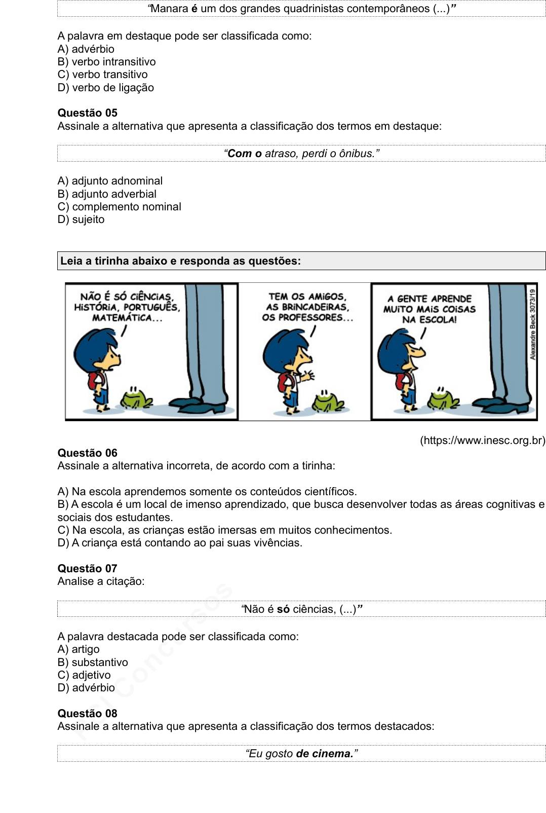 pcimarkpci MjgwNDowMTRjOjViYWU6ODBiMjo2OGUxOjM1MzU6ZDBlODo1ZDZk:U2F0LCAwMSBGZWIgMjAyNSAyMzowNzozNCAtMDMwMA== www.pciconcursos.com.br “Manara é um dos grandes quadrinistas contemporâneos (...)” A palavra em destaque pode ser classificada como: A) advérbio B) verbo intransitivo C) verbo transitivo D) verbo de ligação Questão 05 Assinale a alternativa que apresenta a classificação dos termos em destaque: “Com o atraso, perdi o ônibus.” A) adjunto adnominal B) adjunto adverbial C) complemento nominal D) sujeito Leia a tirinha abaixo e responda as questões: (https://www.inesc.org.br) Questão 06 Assinale a alternativa incorreta, de acordo com a tirinha: A) Na escola aprendemos somente os conteúdos científicos. B) A escola é um local de imenso aprendizado, que busca desenvolver todas as áreas cognitivas e sociais dos estudantes. C) Na escola, as crianças estão imersas em muitos conhecimentos. D) A criança está contando ao pai suas vivências. Questão 07 Analise a citação: “Não é só ciências, (...)” A palavra destacada pode ser classificada como: A) artigo B) substantivo C) adjetivo D) advérbio Questão 08 Assinale a alternativa que apresenta a classificação dos termos destacados: “Eu gosto de cinema.” pcimarkpci MjgwNDowMTRjOjViYWU6ODBiMjo2OGUxOjM1MzU6ZDBlODo1ZDZk:U2F0LCAwMSBGZWIgMjAyNSAyMzowNzozNCAtMDMwMA== www.pciconcursos.com.br A) verbo intransitivo B) adjunto adverbial C) objeto indireto D) objeto direto Questão 09 Analise: “Eduarda está triste.” A palavra destacada pode ser classificada como: A) predicativo do sujeito B) predicativo do objeto C) agente da passiva D) sujeito composto Questão 10 Analise: “Você sabe que horas são, amiga?” Na oração acima é possível identificar a presença de um: A) aposto B) vocativo C) sujeito indeterminado D) advérbio de intensidade Matemática Questão 11 Em uma concessionária, um determinado veículo seminovo está custando R$ 72.900,00 . Durante a semana, a loja está com uma promoção, oferecendo um desconto de 7,5% sobre todos os veículos. Porém, caso o comprador realize o pagamento à vista, sobre o valor final ainda será concedido mais um desconto de 5%. Assim, ao comprar o referido veículo à vista, com a promoção, o comprador pagará quanto, considerando o arredondamento dos valores decimais? A) R$ 54.675,00 B) R$ 63.787,00 C) R$ 64.061,00 D) R$ 67.432,00 Questão 12 A soma das raízes da equação 3x² + 12x + 9 = 0 é: A) -7 B) -6 C) -5 D) -1 Questão 13 A equação que representa a frase “O triplo de um número menos o seu dobro é igual a trinta e cinco” é: A) x³ - x² = 35 B) x/3 - x/2 = 35 C) 3x - 2x = 35 D) 3x - x/2 = 35