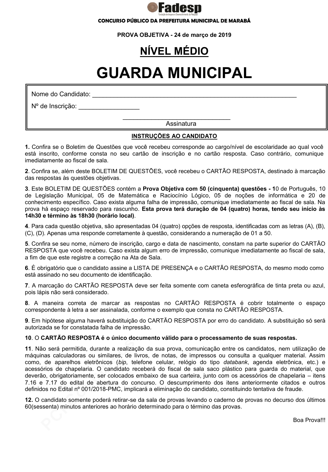 prova há espaço reservado para rascunho. Esta prova terá duração de 04 (quatro) horas, tendo seu início às