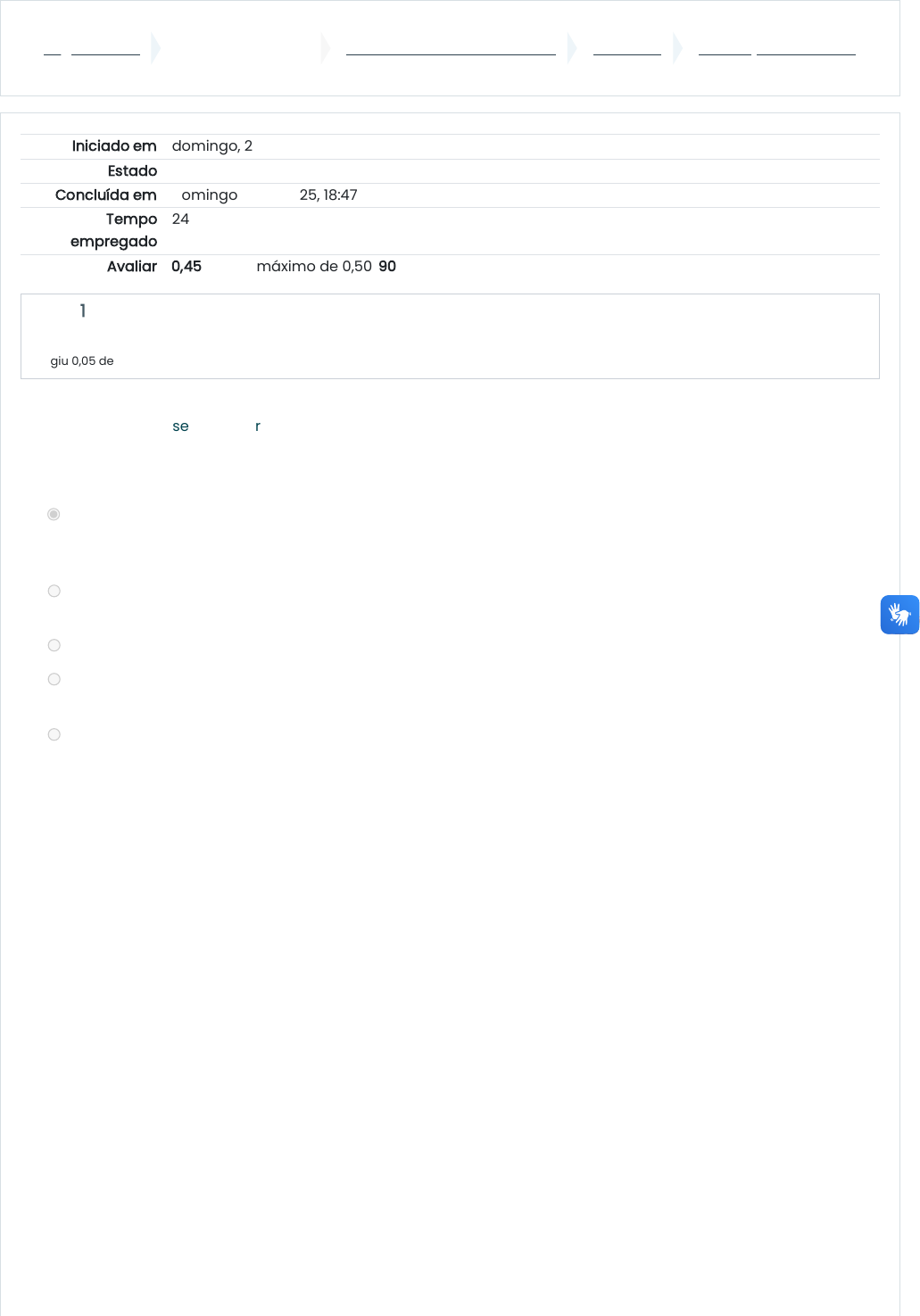 Página inicial Minhas disciplinas 2025/1 - Cultura e Sociedade UNIDADE I AVALIAÇÃO-UNIDADE I Iniciado em domingo, 2 fev 2025, 18:22 Estado Finalizada Concluída em domingo, 2 fev 2025, 18:47 Tempo empregado 24 minutos 54 segundos Avaliar 0,45 de um máximo de 0,50(90%) Questão 1 Correto Atingiu 0,05 de 0,05 A necessidade de se socializar é algo inerente à humanidade uma vez que não só garante a perpetuação da espécie como também de sua história. Conforme vimos no capítulo intitulado “O ser Humano como ser social”, o que garante ao ser humano esse sociabilizar-se? a. O conviver socialmente propicia o compartilhamento de vivências e experiências ocorridas no passado e/ou no presente. Isso se torna possível a partir do uso da linguagem como um veículo de comunicação e interação entre os indivíduos. b. O conviver socialmente propicia o compartilhamento de vivências e experiências ocorridas somente no presente. Isso se torna possível a partir do uso da linguagem para a interação entre os indivíduos. c. O uso das tecnologias digitais. d. O conviver socialmente propicia o compartilhamento de vivências e experiências ocorridas. Isso se torna possível graças às tecnologias digitais. e. O uso de meios de transporte. A resposta correta é: O conviver socialmente propicia o compartilhamento de vivências e experiências ocorridas no passado e/ou no presente. Isso se torna possível a partir do uso da linguagem como um veículo de comunicação e interação entre os indivíduos. https://ambienteonline.uninga.br/ https://ambienteonline.uninga.br/course/view.php?id=31251 https://ambienteonline.uninga.br/course/view.php?id=31251§ion=2 https://ambienteonline.uninga.br/mod/quiz/view.php?id=865704 Questão 2 Correto Atingiu 0,05 de 0,05 Questão 3 Correto Atingiu 0,05 de 0,05 Com base nos estudos do capítulo intitulado “O ser Humano como ser social”, é correto o que se afirma em: a. A partir da razão, o ser humano desenvolve a capacidade de ter e de demonstrar sentimentos, necessidades e aspirações, essas atribuições, contudo, não são de exclusividade da espécie humana e podem ser encontradas em outros animais. b. O fato de o ser humano ser racional e pensante possibilita se projetar no futuro, criando realidades e transcendendo os limites que lhe são impostos. Desse modo, a razão apenas permite que o homem viva desvinculado da sociedade à qual pertence. c. A habilidade reflexiva do ser humano não vai além de uma percepção crítico-reflexiva dos acontecimentos e dos seres vivos, uma vez que o ser humano já vem dotado de autoconhecimento. d. O ser humano é um ser social e político. Além dos impulsos vitais que levam os homens a se juntar ou a se opor uns aos outros, eles são estimulados a compartilhar sua existência com os demais e a impor as suas vontades sobre os mais fracos. e. Um dos aspectos que compõem o ser humano é a razão. Essa racionalidade permite que o ser humano seja capaz de julgar, emitir pensamentos críticos, refletir e modificar a natureza ao seu redor, além de questionar o sentido de sua existência, por que e para que vive. A resposta correta é: Um dos aspectos que compõem o ser humano é a razão. Essa racionalidade permite que o ser humano seja capaz de julgar, emitir pensamentos críticos, refletir e modificar a natureza ao seu redor, além de questionar o sentido de sua existência, por que e para que vive. O animal é guiado por seus instintos, no entanto, não é capaz de controlá-los. O homem, embora movido em parte pelos seus instintos, pode dominá-los através de suas decisões. Essa possibilidade está ligada a qual característica do ser humano? a. Ser racional. b. Ser livre. c. Ser político. d. Ser material. e. Ser social. A resposta correta é: Ser racional. Questão 4 Incorreto Atingiu 0,00 de 0,05 Questão 5 Correto Atingiu 0,05 de 0,05 Questão 6 Correto Atingiu 0,05 de 0,05 O que significa dizer que o ser humano é considerado um ser da práxis? a. Que o ser humano está envolvido em ações conscientes, de forma obrigatória e racional. b. Que o ser humano está envolvido em ações inconscientes, de forma livre. c. Que o ser humano está envolvido em ações conscientes, de forma livre e irracional. d. Que o ser humano está envolvido em ações arbitrárias. e. Que o ser humano está envolvido em ações conscientes, de forma livre e racional. A resposta correta é: Que o ser humano está envolvido em ações conscientes, de forma livre e racional. O desenvolvimento humano não cessa e vai variar conforme os diferentes povos e épocas. Com o aparecimento do homem acabado, surge um novo elemento: a sociedade. O que há de comum entre os hominídeos e a sociedade, segundo Engels e Marx? a. As técnicas. b. A cultura. c. Os laços familiares. d. A religião. e. O trabalho. A resposta correta é: O trabalho. Para Aristóteles (366 a.C.), a natureza do indivíduo humano só é realizável através da comunidade social e política. O indivíduo isolado torna-se insociável e apolítico, comportando-se como um deus ou como um besta. Com base no que estudamos no capítulo intitulado “O ser Humano como ser social”, o que o filósofo sugere a partir dessa reflexão? a. O ser humano é um ser degradado. b. O ser humano é um ser gregário. c. O ser humano deve viver isolado. d. O ser humano é uma unidade indivisível. e. O ser humano é naturalmente político. A resposta correta é: O ser humano é naturalmente político. Questão 7 Correto Atingiu 0,05 de 0,05 Questão 8 Correto Atingiu 0,05 de 0,05 De acordo com Souza (1995), o ser humano age com consciência, intencionalidade e planejamento uma vez que é definido geneticamente com tais capacidades. Para a autora, o que difere o ser humano dos demais entes vivos? a. É possuir vida própria, consciente, autodeterminada e autodeterminante. b. É apenas criar bens culturais e fazer o uso da linguagem. c. É possuir alma ou espírito. d. Ser autodet