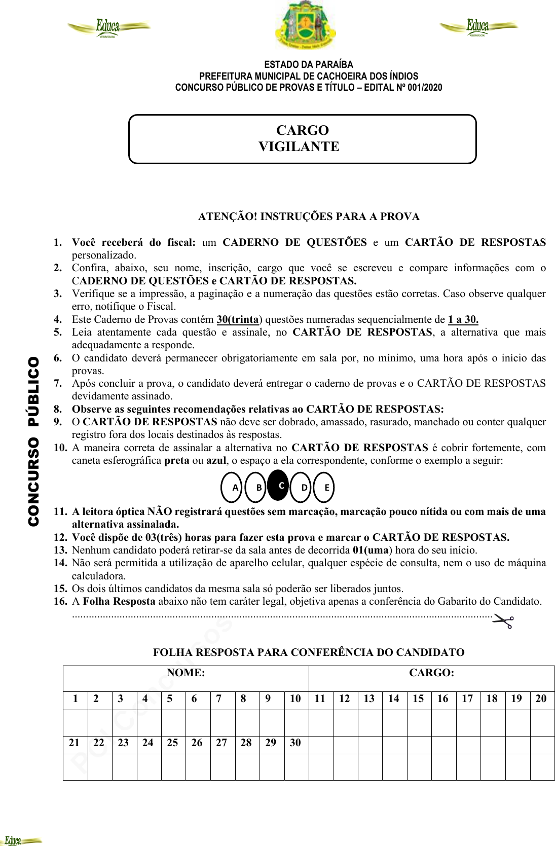 pcimarkpci MDAwMDowMDAwOjAwMDA6MDAwMDowMDAwOmZmZmY6YjViZjozZTlj:U3VuLCAwMiBGZWIgMjAyNSAwMzozNDoxNyAtMDMwMA== www.pciconcursos.com.br ESTADO DA PARAÍBA PREFEITURA MUNICIPAL DE CACHOEIRA DOS ÍNDIOS CONCURSO PÚBLICO DE PROVAS E TÍTULO – EDITAL Nº 001/2020 ATENÇÃO! INSTRUÇÕES PARA A PROVA 1. Você receberá do fiscal: um CADERNO DE QUESTÕES e um CARTÃO DE RESPOSTAS personalizado. 2. Confira, abaixo, seu nome, inscrição, cargo que você se escreveu e compare informações com o CADERNO DE QUESTÕES e CARTÃO DE RESPOSTAS. 3. Verifique se a impressão, a paginação e a numeração das questões estão corretas. Caso observe qualquer erro, notifique o Fiscal. 4. Este Caderno de Provas contém 30(trinta) questões numeradas sequencialmente de 1 a 30. 5. Leia atentamente cada questão e assinale, no CARTÃO DE RESPOSTAS, a alternativa que mais adequadamente a responde. 6. O candidato deverá permanecer obrigatoriamente em sala por, no mínimo, uma hora após o início das provas. 7. Após concluir a prova, o candidato deverá entregar o caderno de provas e o CARTÃO DE RESPOSTAS devidamente assinado. 8. Observe as seguintes recomendações relativas ao CARTÃO DE RESPOSTAS: 9. O CARTÃO DE RESPOSTAS não deve ser dobrado, amassado, rasurado, manchado ou conter qualquer registro fora dos locais destinados às respostas. 10. A maneira correta de assinalar a alternativa no CARTÃO DE RESPOSTAS é cobrir fortemente, com caneta esferográfica preta ou azul, o espaço a ela correspondente, conforme o exemplo a seguir: 11. A leitora óptica NÃO registrará questões sem marcação, marcação pouco nítida ou com mais de uma alternativa assinalada. 12. Você dispõe de 03(três) horas para fazer esta prova e marcar o CARTÃO DE RESPOSTAS. 13. Nenhum candidato poderá retirar-se da sala antes de decorrida 01(uma) hora do seu início. 14. Não será permitida a utilização de aparelho celular, qualquer espécie de consulta, nem o uso de máquina calculadora. 15. Os dois últimos candidatos da mesma sala só poderão ser liberados juntos. 16. A Folha Resposta abaixo não tem caráter legal, objetiva apenas a conferência do Gabarito do Candidato. ......................................................................................................................................................... FOLHA RESPOSTA PARA CONFERÊNCIA DO CANDIDATO NOME: CARGO: 1 2 3 4 5 6 7 8 9 10 11 12 13 14 15 16 17 18 19 20 21 22 23 24 25 26 27 28 29 30 CARGO VIGILANTE C O N C U R S O P Ú B L IC O A B C D E pcimarkpci MDAwMDowMDAwOjAwMDA6MDAwMDowMDAwOmZmZmY6YjViZjozZTlj:U3VuLCAwMiBGZWIgMjAyNSAwMzozNDoxNyAtMDMwMA== www.pciconcursos.com.br ESTADO DA PARAÍBA PREFEITURA MUNICIPAL DE CACHOEIRA DOS ÍNDIOS CONCURSO PÚBLICO DE PROVAS E TÍTULO – EDITAL Nº 001/2020 pcimarkpci MDAwMDowMDAwOjAwMDA6MDAwMDowMDAwOmZmZmY6YjViZjozZTlj:U3VuLCAwMiBGZWIgMjAyNSAwMzozNDoxNyAtMDMwMA== www.pciconcursos.com.br ESTADO DA PARAÍBA PREFEITURA MUNICIPAL DE CACHOEIRA DOS ÍNDIOS CONCURSO PÚBLICO DE PROVAS E TÍTULO – EDITAL Nº 001/2020 LÍNGUA PORTUGUESA Texto I Leia o texto I para responder às questões de 1 a 8. Casos de Covid-19 devem seguir altos no verão, diz Fiocruz O número de mortes por Covid-19 pode permanecer alto nos próximos meses, caso o cenário atual permaneça, de acordo com a edição especial do Boletim Observatório Covid-19 da Fundação Oswaldo Cruz (Fiocruz), divulgada nessa sexta (16). O estudo mostra que apesar da leve tendência de queda desde setembro, o país ainda está em patamar elevado de casos e óbitos. O Boletim mostra que a curva da evolução de casos e óbitos por Covid-19 no Brasil apresentou, desde o início da pandemia, um padrão diferente de outros países. Enquanto em países europeus, por exemplo, o número de casos subiu rapidamente e, após atingir um pico, caiu vertiginosamente – agora, a região passa por uma segunda onda de contaminação – no Brasil, a subida foi mais lenta e a descida também está sendo, de acordo com o vice-diretor do Instituto de Comunicação e Informação em Saúde (Icict), da Fiocruz, Christovam Barcellos. “O que não significa que estamos livres da pandemia, ela tende a diminuir em direção ao verão, mas ainda com número muito alto”, diz Barcellos. “A Europa está começando a viver o inverno. Nós vamos começar a viver o verão, com números caindo, o que significa talvez que a transmissão da Covid-19 terá um pouco tendência sazonal: vai ser mais intensa no inverno, como todas as gripes, e menos intensa no verão”. De acordo com os últimos dados do Ministério da Saúde, o Brasil registrava, até ontem (15), mais de 5,1 milhões de casos confirmados e 152 mil mortes por Covid-19. “A permanência da pandemia nos próximos meses pode acrescentar algumas dezenas de milhares de novos óbitos no país”, diz o Boletim da Fiocruz. Fonte: https://portalcorreio.com.br. Acesso em 17/10/2020 1. Assinale a alternativa que responde sobre a temática central do texto: A. Apresentação dos números de morte por Covid-19 no Brasil durante a pandemia. B. O aumento do pico dos casos de covid-19 nos países europeus, durante a segunda onda de contaminação. C. O aumento da curva da evolução de casos e óbitos por Covid-19 no Brasil, na próxima estação. D. Análise dos últimos dados da pandemia divulgados pelo Ministério da Saúde brasileiro até o momento atual. E. A tendência de queda do patamar elevado de casos e óbitos por covid-19 no Brasil. 2. Sobre a finalidade do texto, analise os itens a seguir. I. Convencer o leitor de que ainda não estamos livres da pandemia. II. Ensinar ao leitor como se prevenir contra a Covid-19. III. Questionar o fato da pandemia, no Brasil, ter a subida e a descida de casos e mortes de forma mais lenta. IV. Apresentar opiniões pessoais sobre a evolução dos casos e mortes por Covid-19 na Europa e no Brasil. Estão INCORRETOS: A. I e III B. I, II e III. C. III e IV. D. II e IV. E. I, II, III e IV