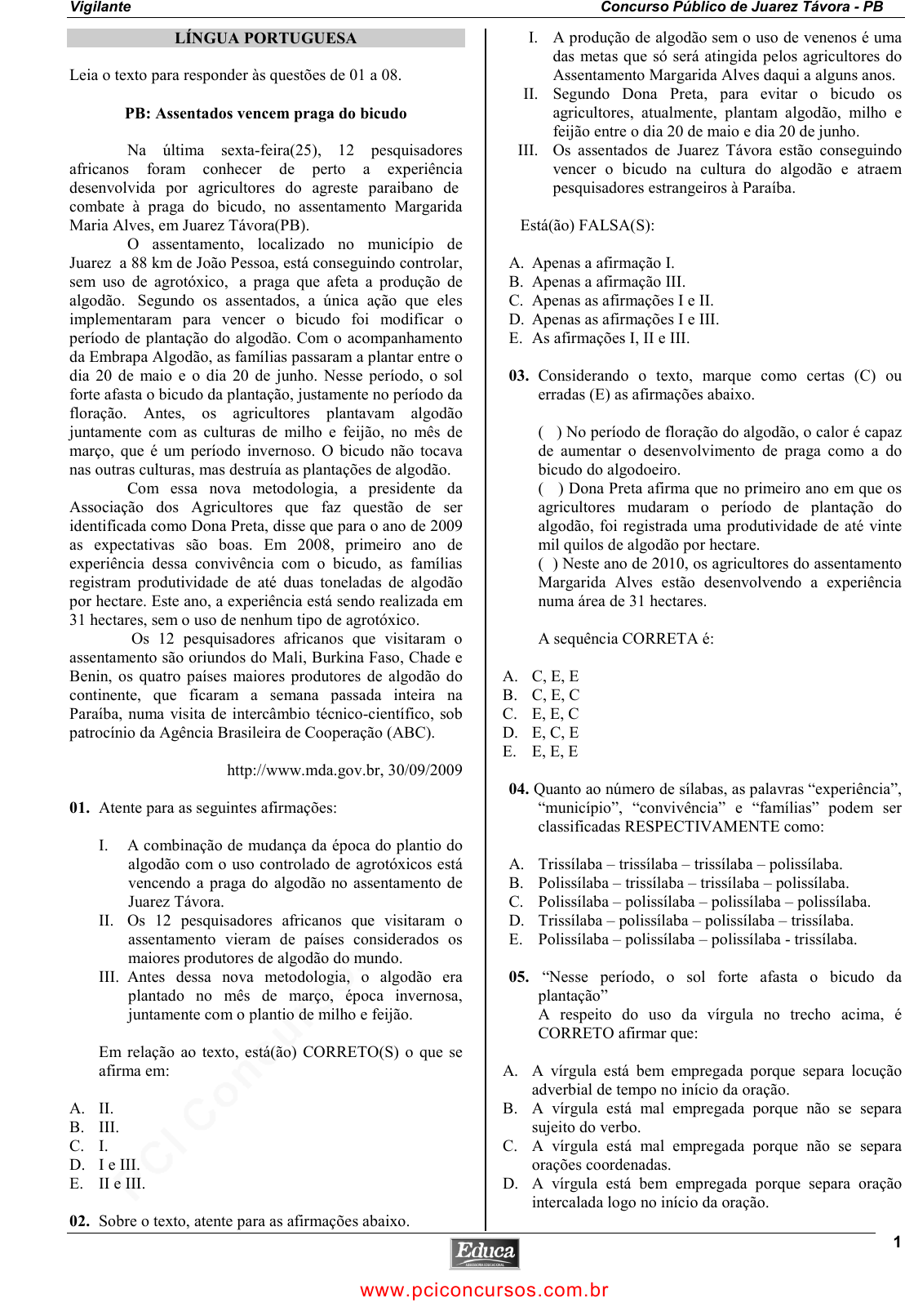 pcimarkpci MDAwMDowMDAwOjAwMDA6MDAwMDowMDAwOmZmZmY6OTU0ZTpiYTc5:U3VuLCAwMiBGZWIgMjAyNSAwNDowNTozMiAtMDMwMA== www.pciconcursos.com.br Vigilante Concurso Público de Juarez Távora - PB 1 LÍNGUA PORTUGUESA Leia o texto para responder às questões de 01 a 08. PB: Assentados vencem praga do bicudo Na última sexta-feira(25), 12 pesquisadores africanos foram conhecer de perto a experiência desenvolvida por agricultores do agreste paraibano de combate à praga do bicudo, no assentamento Margarida Maria Alves, em Juarez Távora(PB). O assentamento, localizado no município de Juarez a 88 km de João Pessoa, está conseguindo controlar, sem uso de agrotóxico, a praga que afeta a produção de algodão. Segundo os assentados, a única ação que eles implementaram para vencer o bicudo foi modificar o período de plantação do algodão. Com o acompanhamento da Embrapa Algodão, as famílias passaram a plantar entre o dia 20 de maio e o dia 20 de junho. Nesse período, o sol forte afasta o bicudo da plantação, justamente no período da floração. Antes, os agricultores plantavam algodão juntamente com as culturas de milho e feijão, no mês de março, que é um período invernoso. O bicudo não tocava nas outras culturas, mas destruía as plantações de algodão. Com essa nova metodologia, a presidente da Associação dos Agricultores que faz questão de ser identificada como Dona Preta, disse que para o ano de 2009 as expectativas são boas. Em 2008, primeiro ano de experiência dessa convivência com o bicudo, as famílias registram produtividade de até duas toneladas de algodão por hectare. Este ano, a experiência está sendo realizada em 31 hectares, sem o uso de nenhum tipo de agrotóxico. Os 12 pesquisadores africanos que visitaram o assentamento são oriundos do Mali, Burkina Faso, Chade e Benin, os quatro países maiores produtores de algodão do continente, que ficaram a semana passada inteira na Paraíba, numa visita de intercâmbio técnico-científico, sob patrocínio da Agência Brasileira de Cooperação (ABC). http://www.mda.gov.br, 30/09/2009 01. Atente para as seguintes afirmações: I. A combinação de mudança da época do plantio do algodão com o uso controlado de agrotóxicos está vencendo a praga do algodão no assentamento de Juarez Távora. II. Os 12 pesquisadores africanos que visitaram o assentamento vieram de países considerados os maiores produtores de algodão do mundo. III. Antes dessa nova metodologia, o algodão era plantado no mês de março, época invernosa, juntamente com o plantio de milho e feijão. Em relação ao texto, está(ão) CORRETO(S) o que se afirma em: A. II. B. III. C. I. D. I e III. E. II e III. 02. Sobre o texto, atente para as afirmações abaixo. I. A produção de algodão sem o uso de venenos é uma das metas que só será atingida pelos agricultores do Assentamento Margarida Alves daqui a alguns anos. II. Segundo Dona Preta, para evitar o bicudo os agricultores, atualmente, plantam algodão, milho e feijão entre o dia 20 de maio e dia 20 de junho. III. Os assentados de Juarez Távora estão conseguindo vencer o bicudo na cultura do algodão e atraem pesquisadores estrangeiros à Paraíba. Está(ão) FALSA(S): A. Apenas a afirmação I. B. Apenas a afirmação III. C. Apenas as afirmações I e II. D. Apenas as afirmações I e III. E. As afirmações I, II e III. 03. Considerando o texto, marque como certas (C) ou erradas (E) as afirmações abaixo. ( ) No período de floração do algodão, o calor é capaz de aumentar o desenvolvimento de praga como a do bicudo do algodoeiro. ( ) Dona Preta afirma que no primeiro ano em que os agricultores mudaram o período de plantação do algodão, foi registrada uma produtividade de até vinte mil quilos de algodão por hectare. ( ) Neste ano de 2010, os agricultores do assentamento Margarida Alves estão desenvolvendo a experiência numa área de 31 hectares. A sequência CORRETA é: A. C, E, E B. C, E, C C. E, E, C D. E, C, E E. E, E, E 04. Quanto ao número de sílabas, as palavras “experiência”, “município”, “convivência” e “famílias” podem ser classificadas RESPECTIVAMENTE como: A. Trissílaba – trissílaba – trissílaba – polissílaba. B. Polissílaba – trissílaba – trissílaba – polissílaba. C. Polissílaba – polissílaba – polissílaba – polissílaba. D. Trissílaba – polissílaba – polissílaba – trissílaba. E. Polissílaba – polissílaba – polissílaba - trissílaba. 05. “Nesse período, o sol forte afasta o bicudo da plantação” A respeito do uso da vírgula no trecho acima, é CORRETO afirmar que: A. A vírgula está bem empregada porque separa locução adverbial de tempo no início da oração. B. A vírgula está mal empregada porque não se separa sujeito do verbo. C. A vírgula está mal empregada porque não se separa orações coordenadas. D. A vírgula está bem empregada porque separa oração intercalada logo no início da oração. www.pciconcursos.com.br pcimarkpci MDAwMDowMDAwOjAwMDA6MDAwMDowMDAwOmZmZmY6OTU0ZTpiYTc5:U3VuLCAwMiBGZWIgMjAyNSAwNDowNTozMiAtMDMwMA== www.pciconcursos.com.br Vigilante Concurso Público de Juarez Távora - PB 2 E. A vírgula está bem empregada porque separa termos explicativos no início da oração. 06. No trecho: “Com essa nova metodologia, a presidente da Associação dos Agricultores que faz questão de ser identificada como Dona Preta, disse que para o ano de 2009 as expectativas são boas”. É CORRETO afirmar que as palavras grifadas são RESPECTIVAMENTE: A. Pronome possessivo, adjetivo e substantivo. B. Pronome demonstrativo, substantivo e adjetivo C. Pronome possessivo, adjetivo e adjetivo. D. Pronome demonstrativo, adjetivo e substantivo. E. Pronome possessivo, substantivo e adjetivo. 07. Os 12 pesquisadores africanos que visitaram o assentamento são oriundos do Mali, Burkina Faso, Chade e Benin. Assinale a opção que apresenta a palavra que substitui oriundos sem 