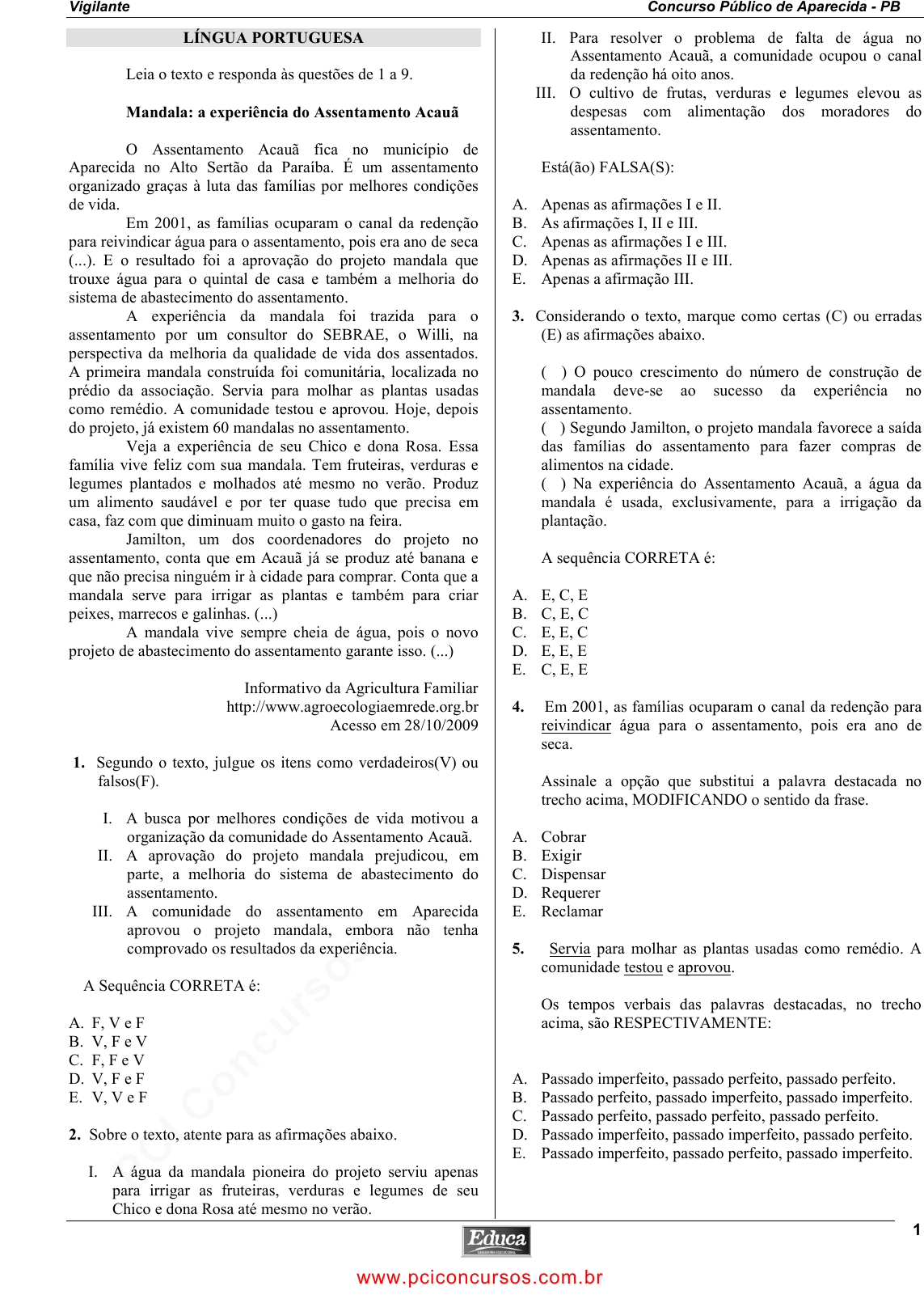 pcimarkpci MDAwMDowMDAwOjAwMDA6MDAwMDowMDAwOmZmZmY6OTU0ZTpiYTc5:U3VuLCAwMiBGZWIgMjAyNSAwNDowNDo0OCAtMDMwMA== www.pciconcursos.com.br Vigilante Concurso Público de Aparecida - PB 1 LÍNGUA PORTUGUESA Leia o texto e responda às questões de 1 a 9. Mandala: a experiência do Assentamento Acauã O Assentamento Acauã fica no município de Aparecida no Alto Sertão da Paraíba. É um assentamento organizado graças à luta das famílias por melhores condições de vida. Em 2001, as famílias ocuparam o canal da redenção para reivindicar água para o assentamento, pois era ano de seca (...). E o resultado foi a aprovação do projeto mandala que trouxe água para o quintal de casa e também a melhoria do sistema de abastecimento do assentamento. A experiência da mandala foi trazida para o assentamento por um consultor do SEBRAE, o Willi, na perspectiva da melhoria da qualidade de vida dos assentados. A primeira mandala construída foi comunitária, localizada no prédio da associação. Servia para molhar as plantas usadas como remédio. A comunidade testou e aprovou. Hoje, depois do projeto, já existem 60 mandalas no assentamento. Veja a experiência de seu Chico e dona Rosa. Essa família vive feliz com sua mandala. Tem fruteiras, verduras e legumes plantados e molhados até mesmo no verão. Produz um alimento saudável e por ter quase tudo que precisa em casa, faz com que diminuam muito o gasto na feira. Jamilton, um dos coordenadores do projeto no assentamento, conta que em Acauã já se produz até banana e que não precisa ninguém ir à cidade para comprar. Conta que a mandala serve para irrigar as plantas e também para criar peixes, marrecos e galinhas. (...) A mandala vive sempre cheia de água, pois o novo projeto de abastecimento do assentamento garante isso. (...) Informativo da Agricultura Familiar http://www.agroecologiaemrede.org.br Acesso em 28/10/2009 1. Segundo o texto, julgue os itens como verdadeiros(V) ou falsos(F). I. A busca por melhores condições de vida motivou a organização da comunidade do Assentamento Acauã. II. A aprovação do projeto mandala prejudicou, em parte, a melhoria do sistema de abastecimento do assentamento. III. A comunidade do assentamento em Aparecida aprovou o projeto mandala, embora não tenha comprovado os resultados da experiência. A Sequência CORRETA é: A. F, V e F B. V, F e V C. F, F e V D. V, F e F E. V, V e F 2. Sobre o texto, atente para as afirmações abaixo. I. A água da mandala pioneira do projeto serviu apenas para irrigar as fruteiras, verduras e legumes de seu Chico e dona Rosa até mesmo no verão. II. Para resolver o problema de falta de água no Assentamento Acauã, a comunidade ocupou o canal da redenção há oito anos. III. O cultivo de frutas, verduras e legumes elevou as despesas com alimentação dos moradores do assentamento. Está(ão) FALSA(S): A. Apenas as afirmações I e II. B. As afirmações I, II e III. C. Apenas as afirmações I e III. D. Apenas as afirmações II e III. E. Apenas a afirmação III. 3. Considerando o texto, marque como certas (C) ou erradas (E) as afirmações abaixo. ( ) O pouco crescimento do número de construção de mandala deve-se ao sucesso da experiência no assentamento. ( ) Segundo Jamilton, o projeto mandala favorece a saída das famílias do assentamento para fazer compras de alimentos na cidade. ( ) Na experiência do Assentamento Acauã, a água da mandala é usada, exclusivamente, para a irrigação da plantação. A sequência CORRETA é: A. E, C, E B. C, E, C C. E, E, C D. E, E, E E. C, E, E 4. Em 2001, as famílias ocuparam o canal da redenção para reivindicar água para o assentamento, pois era ano de seca. Assinale a opção que substitui a palavra destacada no trecho acima, MODIFICANDO o sentido da frase. A. Cobrar B. Exigir C. Dispensar D. Requerer E. Reclamar 5. Servia para molhar as plantas usadas como remédio. A comunidade testou e aprovou. Os tempos verbais das palavras destacadas, no trecho acima, são RESPECTIVAMENTE: A. Passado imperfeito, passado perfeito, passado perfeito. B. Passado perfeito, passado imperfeito, passado imperfeito. C. Passado perfeito, passado perfeito, passado perfeito. D. Passado imperfeito, passado imperfeito, passado perfeito. E. Passado imperfeito, passado perfeito, passado imperfeito. www.pciconcursos.com.br pcimarkpci MDAwMDowMDAwOjAwMDA6MDAwMDowMDAwOmZmZmY6OTU0ZTpiYTc5:U3VuLCAwMiBGZWIgMjAyNSAwNDowNDo0OCAtMDMwMA== www.pciconcursos.com.br Vigilante Concurso Público de Aparecida - PB 2 6. A comunidade testou e aprovou, significa que: A. A experiência do projeto mandala está em fase de teste para aprovação. B. A experiência do projeto mandala ainda vai ser testada para que receba a aprovação da comunidade. C. A experiência do projeto mandala foi testada e aprovada pela comunidade. D. A experiência do projeto mandala foi testada e aprovada pelo governo municipal. E. A experiência do projeto mandala não precisa ser testada e aprovada pela comunidade, pois é um projeto do governo federal. 7. A primeira mandala construída foi comunitária Assinale a opção que contém a classificação CORRETA das palavras destacadas no trecho acima, RESPECTIVAMENTE. A. Pronome, substantivo, substantivo. B. Artigo, numeral, substantivo. C. Pronome, substantivo, adjetivo. D. Artigo, numeral, adjetivo. E. Artigo, pronome, substantivo. 8. Quanto à posição da sílaba tônica, as palavras ninguém, saudável e sistema são RESPECTIVAMENTE: A. Paroxítona, paroxítona, oxítona. B. Paroxítona, proparoxítona, paroxítona. C. Oxítona, paroxítona, oxítona. D. Oxítona, paroxítona, paroxítona. E. Oxítona, proparoxítona, oxítona. 9. Quanto ao número de sílabas, as palavras depois, construída, Acauã são RESPECTIVAMENTE: A. Trissílaba, polissílaba, trissílaba. B. Dissílaba, trissílaba, polissílaba. C. Dissílaba, polissílaba, trissílaba. D. Dissílaba, polissílaba, polissílaba. E. Trissílaba, trissílaba, trissílaba.