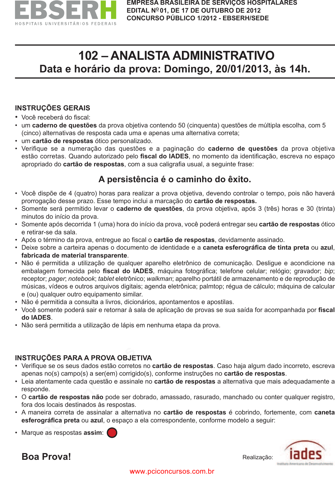 pcimarkpci MDAwMDowMDAwOjAwMDA6MDAwMDowMDAwOmZmZmY6YmFmOTpiNDVk:TW9uLCAwMyBGZWIgMjAyNSAxNDoxNDo1MSAtMDMwMA== www.pciconcursos.com.br EmPrESA BrASILEIrA dE SErvIÇoS HoSPITALArES EdITAL No 01, dE 17 dE oUTUBro dE 2012 CoNCUrSo PÚBLICo 1/2012 - EBSErH/SEdE 102 – ANALISTA AdmINISTrATIvo data e horário da prova: domingo, 20/01/2013, às 14h. INSTrUÇÕES GErAIS • Você receberá do fi scal: • um caderno de questões da prova objetiva contendo 50 (cinquenta) questões de múltipla escolha, com 5 (cinco) alternativas de resposta cada uma e apenas uma alternativa correta; • um cartão de respostas ótico personalizado. • Verifi que se a numeração das questões e a paginação do caderno de questões da prova objetiva estão corretas. Quando autorizado pelo fi scal do IADES, no momento da identifi cação, escreva no espaço apropriado do cartão de respostas, com a sua caligrafi a usual, a seguinte frase: A persistência é o caminho do êxito. • Você dispõe de 4 (quatro) horas para realizar a prova objetiva, devendo controlar o tempo, pois não haverá prorrogação desse prazo. Esse tempo inclui a marcação do cartão de respostas. • somente será permitido levar o caderno de questões, da prova objetiva, após 3 (três) horas e 30 (trinta) minutos do início da prova. • somente após decorrida 1 (uma) hora do início da prova, você poderá entregar seu cartão de respostas ótico e retirar-se da sala. • Após o término da prova, entregue ao fi scal o cartão de respostas, devidamente assinado. • deixe sobre a carteira apenas o documento de identidade e a caneta esferográfi ca de tinta preta ou azul, fabricada de material transparente. • não é permitida a utilização de qualquer aparelho eletrônico de comunicação. desligue e acondicione na embalagem fornecida pelo fi scal do IADES, máquina fotográfi ca; telefone celular; relógio; gravador; bip; receptor; pager; notebook; tablet eletrônico; walkman; aparelho portátil de armazenamento e de reprodução de músicas, vídeos e outros arquivos digitais; agenda eletrônica; palmtop; régua de cálculo; máquina de calcular e (ou) qualquer outro equipamento similar. • não é permitida a consulta a livros, dicionários, apontamentos e apostilas. • Você somente poderá sair e retornar à sala de aplicação de provas se sua saída for acompanhada por fi scal do IAdES. • não será permitida a utilização de lápis em nenhuma etapa da prova. INSTrUÇÕES PArA A ProvA oBJETIvA • Verifi que se os seus dados estão corretos no cartão de respostas. caso haja algum dado incorreto, escreva apenas no(s) campo(s) a ser(em) corrigido(s), conforme instruções no cartão de respostas. • leia atentamente cada questão e assinale no cartão de respostas a alternativa que mais adequadamente a responde. • O cartão de respostas não pode ser dobrado, amassado, rasurado, manchado ou conter qualquer registro, fora dos locais destinados às respostas. • A maneira correta de assinalar a alternativa no cartão de respostas é cobrindo, fortemente, com caneta esferográfi ca preta ou azul, o espaço a ela correspondente, conforme modelo a seguir: • Marque as respostas assim: Boa Prova! realização: www.pciconcursos.com.br www.pciconcursos.com.br pcimarkpci MDAwMDowMDAwOjAwMDA6MDAwMDowMDAwOmZmZmY6YmFmOTpiNDVk:TW9uLCAwMyBGZWIgMjAyNSAxNDoxNDo1MSAtMDMwMA== www.pciconcursos.com.brconcurso público 1/2012 - EbsErH/sEdE 102 - ANALISTA AdmINISTrATIvo pAG 2/14 Texto 1, para responder às questões de 1 a 4. CoNHECImENToS BÁSICoS - QUESTÕES 1 A 20 LÍNGUA PorTUGUESA – QUESTÕES 1 A 8 toda obra gera entulho. É o dono da obra quem deve assegurar a destinação correta do entulho, normalmente os aterros. Quando isso não acontece, cerâmica, gesso, cimento, concreto, vergalhão, madeira e outros materiais aparecem abandonados em terrenos baldios, encostas de morros ou em leitos de rios e lagos. No Brasil, são recolhidos oi cialmente 33 milhões de toneladas de entulho por ano. Material sui ciente para construir quase 500 mil casas populares de 50 metros quadrados cada uma. Mas quem estuda o setor de construção civil admite que a quantidade gerada seja muito maior que essa. há quem não veja no entulho problema, e sim uma solução. em Belo horizonte, por exemplo, o que é coletado nas ruas é levado para usinas de reciclagem. tudo que chega é despejado e espalhado no pátio. A água ajuda a baixar a poeira. Aí começa a coleta das impurezas. tudo que não pode entrar na reciclagem do entulho é impureza, e a cada dia são separadas 10 toneladas de impurezas, que vão para o aterro. o britador tritura todos os materiais em cinco diferentes tamanhos de grãos. Uma usina de reciclagem de entulho é uma linha de montagem de material de construção de diferentes tipos como, por exemplo, brita, que é muito comum para quem está fazendo obra, precisa de pedrinha. ela vai substituir a brita natural na elaboração de blocos, pavimentação, meio-i o. Esse material natural, que antes seria lixo, passa a ser insumo para as nossas obras. “Se eu fosse buscar no mercado para todas as obras municipais, seria uma despesa importante, não só o material, a brita e a areia, como o material que a gente usa base e sub- base de pavimentação, cobertura de valas”, fala o diretor de Planejamento da Sup. Limpeza Urbana/Bh, Lucas Garilho. A primeira usina foi inaugurada há 17 anos. hoje são três em atividade, transformando 460 toneladas de detritos, por dia, em matéria-prima para a construção civil. Apenas no ano passado, Belo horizonte reciclou mais de 112 mil toneladas de entulho. Com esse material, seria possível construir: 1.651 casas populares com 50 metros quadrados; 34 quilômetros de ruas com dez metros de largura; 67 escolas com mais de mil metros quadrados. Se fosse comprar esses materiais no mercado, Belo Horizonte teria de gastar aproximadamente R$ 7 milhões por ano. “Um bloco no mercado, ele está em torn