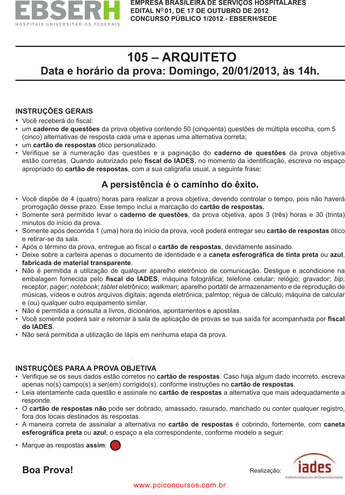 pcimarkpci MDAwMDowMDAwOjAwMDA6MDAwMDowMDAwOmZmZmY6YmFmOTpiNDVk:TW9uLCAwMyBGZWIgMjAyNSAxNDo1ODo1NiAtMDMwMA== www.pciconcursos.com.br eMPreSa BraSiLeira De SerViÇoS HoSPitaLareS eDitaL No 01, De 17 De outuBro De 2012 CoNCurSo PÚBLiCo 1/2012 - eBSerH/SeDe 105 – arquiteto Data e horário da prova: Domingo, 20/01/2013, às 14h. iNStruÇÕeS GeraiS • Você receberá do fi scal: • um caderno de questões da prova objetiva contendo 50 (cinquenta) questões de múltipla escolha, com 5 (cinco) alternativas de resposta cada uma e apenas uma alternativa correta; • um cartão de respostas ótico personalizado. • Verifi que se a numeração das questões e a paginação do caderno de questões da prova objetiva estão corretas. Quando autorizado pelo fi scal do IADES, no momento da identifi cação, escreva no espaço apropriado do cartão de respostas, com a sua caligrafi a usual, a seguinte frase: a persistência é o caminho do êxito. • Você dispõe de 4 (quatro) horas para realizar a prova objetiva, devendo controlar o tempo, pois não haverá prorrogação desse prazo. Esse tempo inclui a marcação do cartão de respostas. • somente será permitido levar o caderno de questões, da prova objetiva, após 3 (três) horas e 30 (trinta) minutos do início da prova. • somente após decorrida 1 (uma) hora do início da prova, você poderá entregar seu cartão de respostas ótico e retirar-se da sala. • Após o término da prova, entregue ao fi scal o cartão de respostas, devidamente assinado. • deixe sobre a carteira apenas o documento de identidade e a caneta esferográfi ca de tinta preta ou azul, fabricada de material transparente. • não é permitida a utilização de qualquer aparelho eletrônico de comunicação. desligue e acondicione na embalagem fornecida pelo fi scal do IADES, máquina fotográfi ca; telefone celular; relógio; gravador; bip; receptor; pager; notebook; tablet eletrônico; walkman; aparelho portátil de armazenamento e de reprodução de músicas, vídeos e outros arquivos digitais; agenda eletrônica; palmtop; régua de cálculo; máquina de calcular e (ou) qualquer outro equipamento similar. • não é permitida a consulta a livros, dicionários, apontamentos e apostilas. • Você somente poderá sair e retornar à sala de aplicação de provas se sua saída for acompanhada por fi scal do iaDeS. • não será permitida a utilização de lápis em nenhuma etapa da prova. iNStruÇÕeS Para a ProVa oBJetiVa • Verifi que se os seus dados estão corretos no cartão de respostas. caso haja algum dado incorreto, escreva apenas no(s) campo(s) a ser(em) corrigido(s), conforme instruções no cartão de respostas. • leia atentamente cada questão e assinale no cartão de respostas a alternativa que mais adequadamente a responde. • O cartão de respostas não pode ser dobrado, amassado, rasurado, manchado ou conter qualquer registro, fora dos locais destinados às respostas. • A maneira correta de assinalar a alternativa no cartão de respostas é cobrindo, fortemente, com caneta esferográfi ca preta ou azul, o espaço a ela correspondente, conforme modelo a seguir: • Marque as respostas assim: Boa Prova! realização: www.pciconcursos.com.br pcimarkpci MDAwMDowMDAwOjAwMDA6MDAwMDowMDAwOmZmZmY6YmFmOTpiNDVk:TW9uLCAwMyBGZWIgMjAyNSAxNDo1ODo1NiAtMDMwMA== www.pciconcursos.com.brconcurso público 1/2012 - EbsErH/sEdE 105 - arquiteto pAG 2/19 Texto 1, para responder às questões de 1 a 4. CoNHeCiMeNtoS BÁSiCoS - queStÕeS 1 a 20 LÍNGua PortuGueSa – queStÕeS 1 a 8 Toda obra gera entulho. É o dono da obra quem deve assegurar a destinação correta do entulho, normalmente os aterros. Quando isso não acontece, cerâmica, gesso, cimento, concreto, vergalhão, madeira e outros materiais aparecem abandonados em terrenos baldios, encostas de morros ou em leitos de rios e lagos. No Brasil, são recolhidos oi cialmente 33 milhões de toneladas de entulho por ano. Material sui ciente para construir quase 500 mil casas populares de 50 metros quadrados cada uma. Mas quem estuda o setor de construção civil admite que a quantidade gerada seja muito maior que essa. Há quem não veja no entulho problema, e sim uma solução. Em Belo Horizonte, por exemplo, o que é coletado nas ruas é levado para usinas de reciclagem. Tudo que chega é despejado e espalhado no pátio. A água ajuda a baixar a poeira. Aí começa a coleta das impurezas. Tudo que não pode entrar na reciclagem do entulho é impureza, e a cada dia são separadas 10 toneladas de impurezas, que vão para o aterro. O britador tritura todos os materiais em cinco diferentes tamanhos de grãos. Uma usina de reciclagem de entulho é uma linha de montagem de material de construção de diferentes tipos como, por exemplo, brita, que é muito comum para quem está fazendo obra, precisa de pedrinha. Ela vai substituir a brita natural na elaboração de blocos, pavimentação, meio-i o. Esse material natural, que antes seria lixo, passa a ser insumo para as nossas obras. “Se eu fosse buscar no mercado para todas as obras municipais, seria uma despesa importante, não só o material, a brita e a areia, como o material que a gente usa base e sub- base de pavimentação, cobertura de valas”, fala o diretor de Planejamento da Sup. Limpeza Urbana/BH, Lucas Garilho. A primeira usina foi inaugurada há 17 anos. Hoje são três em atividade, transformando 460 toneladas de detritos, por dia, em matéria-prima para a construção civil. Apenas no ano passado, Belo Horizonte reciclou mais de 112 mil toneladas de entulho. Com esse material, seria possível construir: 1.651 casas populares com 50 metros quadrados; 34 quilômetros de ruas com dez metros de largura; 67 escolas com mais de mil metros quadrados. Se fosse comprar esses materiais no mercado, Belo Horizonte teria de gastar aproximadamente R$ 7 milhões por ano. “Um bloco no mercado, ele está em torno de R$ 1,00, R$ 1,20. Para nós sai com uma reduç