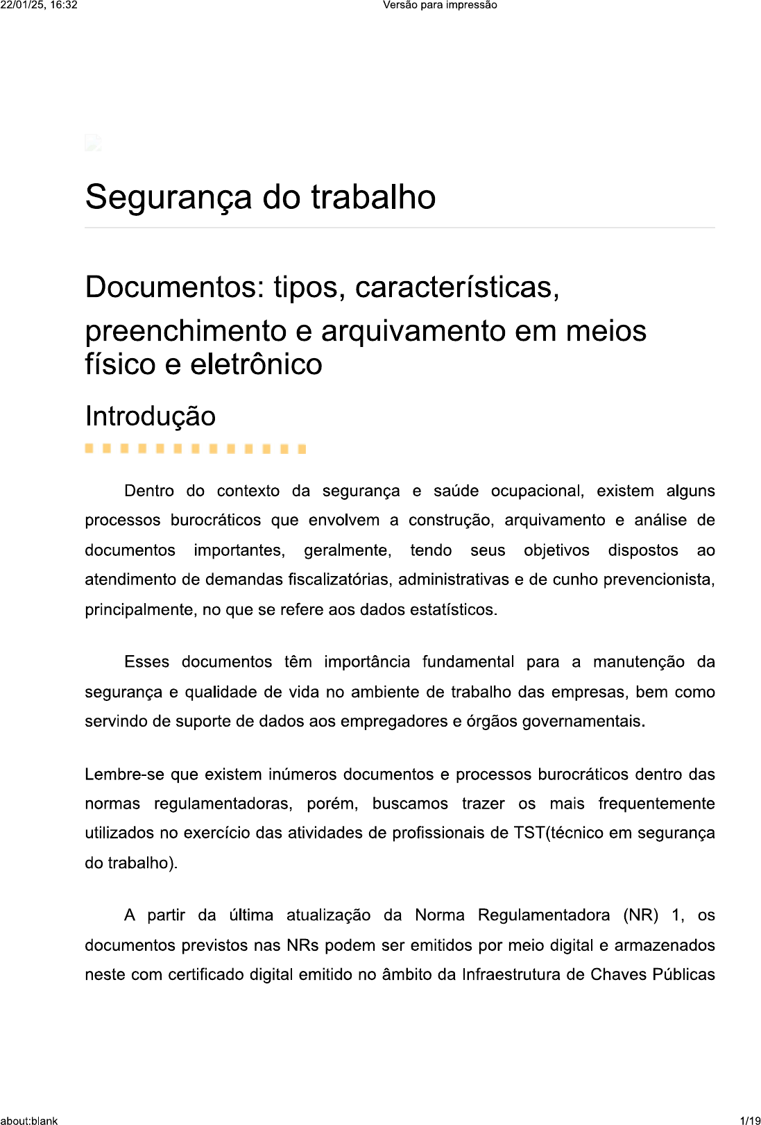 22/01/25, 16:32 Versão para impressão Segurança do trabalho Documentos: tipos, características, preenchimento e arquivamento em meios físico e eletrônico Introdução Dentro do contexto da segurança e saúde ocupacional, existem alguns processos burocráticos que envolvem a construção, arquivamento e análise de documentos importantes, geralmente, tendo seus objetivos dispostos ao atendimento de demandas fiscalizatórias, administrativas e de cunho prevencionista, principalmente, no que se refere aos dados estatísticos. Esses documentos têm importância fundamental para a manutenção da segurança e qualidade de vida no ambiente de trabalho das empresas, bem como servindo de suporte de dados aos empregadores e órgãos governamentais. Lembre-se que existem inúmeros documentos e processos burocráticos dentro das normas regulamentadoras, porém, buscamos trazer os mais frequentemente utilizados no exercício das atividades de profissionais de TST (técnico em segurança do trabalho). A partir da última atualização da Norma Regulamentadora (NR) 1, os documentos previstos nas NRs podem ser emitidos por meio digital e armazenados neste com certificado digital emitido no âmbito da Infraestrutura de Chaves Públicas about:blank 1/1922/01/25, 16:32 Versão para impressão Brasileira (ICP-Brasil), normatizada por lei específica. Isso significa que todos os documentos com previsibilidade dentro das NRs podem ser digitalizados conforme estabelecido na NR-1. Alguns documentos deverão ser digitalizados obrigatoriamente segundo prazos estabelecidos para digitalização dos documentos: Cinco anos para microempresas e microempreendedor individual Três anos para empresas de pequeno porte Dois anos para as demais empresas Optando pela guarda em papel, os documentos originais devem ser armazenados, e não as cópias, no espaço físico. Porém, tais documentos, após o encerramento dos prazos, já devem estar digitalizados. Os documentos com digitalização obrigatória são: os arquivos referentes ao Programa de Prevenção de Riscos Ambientais (PPRA), ao Programa de Controle Médico e de Saúde Ocupacional (PCMSO), ao Programa de Gestão de Riscos (PGR), ao Programa de Condições do Meio Ambiente de Trabalho na Indústria de Construção (PCMAT) e ao Programa de Proteção Respiratória (PPR); o Plano de Proteção Radiológica (PPR); o Plano de Prevenção e Combate a Incêndio (PPCI); o Plano de Prevenção de Riscos com Acidentes com Materiais Perfurocortantes (PPRAMP); a Análise Ergonômica do Trabalho (AET); o Laudo Técnico das Condições Ambientais do Trabalho (LTCAT); o perfil profissional previdenciário (PPP); o atestado de saúde ocupacional (ASO); e os certificados de treinamentos. Esses documentos, após o prazo estabelecido, deverão obrigatoriamente estar armazenados na forma digital, sendo necessário o armazenamento físico apenas dos documentos que já estavam armazenados na forma física. Isso significa que todos os documentos físicos, como LTCAT, PCMAT, AET, PPCI, PPP, ASO, PPR, PCMSO e PPRA, que já foram produzidos na empresa com assinatura manual e ainda estão com a guarda estabelecida como necessária pela about:blank 2/1922/01/25, 16:32 Versão para impressão legislação anterior serão digitalizados de acordo com os prazos vinculados de cinco anos, três anos ou dois anos, dependendo do tamanho. Porém, os documentos físicos deverão ficar armazenados, considerando que somente a partir de 2021 os documentos novos poderão ficar apenas na forma digitalizada dentro da empresa. Além de evitar o espaço ocupado por papéis, a digitalização é uma medida tecnológica fundamental e ambientalmente amigável, sendo uma das grandes melhorias apreciadas por todas as instituições participantes da comissão tripartite que aprovou a atualização da NR-1. fluxograma a seguir detalha as informações referentes à digitalização necessária: 20 anos 20 anos anterior 2021 após Digitalizar esses A partir dessa data, os documentos segundo os documentos já podem estar prazos e conforme a somente digitalizados. classificação da empresa: microempresa, microempreendedor individual. Manter na empresa os documentos na forma física conforme legislação. Figura 1 - Fluxograma de digitalizações necessárias O processo de digitalização deve ser realizado visando a manter a integridade, a autenticidade e, se necessário, a confidencialidade do documento digital, com o emprego de certificado digital emitido no âmbito da ICP-Brasil. A ICP-Brasil é uma cadeia hierárquica de confiança que viabiliza a emissão de certificados digitais para identificação virtual do cidadão. about:blank 3/1922/01/25, 16:32 Versão para impressão O modelo adotado pelo Brasil foi o de certificação com raiz única, sendo que o ITI (Instituto Nacional de Tecnologia da Informação), além de desempenhar o papel de Autoridade Certificadora Raiz (AC-Raiz), também tem o papel de credenciar e descredenciar os demais participantes da cadeia, supervisionar os processos e fazer a auditoria destes. O empregador deve garantir a preservação de todos os documentos nato digitais ou digitalizados adotando procedimentos e tecnologias que permitam verificar, a qualquer tempo, a validade jurídica dos arquivos em todo o território nacional, garantindo permanentemente a autenticidade, a integridade, a disponibilidade, a rastreabilidade, a irretratabilidade, a privacidade e a interoperabilidade dos documentos. Autenticidade É uma característica do que é genuíno, verdadeiro. Integridade Significa que é irrepreensível na conduta, honesto e íntegro. Disponibilidade É a qualidade de quem se acha aberto para receber auditorias externas, conselhos, novas ideias etc. Rastreabilidade about:blank 4/1922/01/25, 16:32 Versão para impressão Significa que é fácil de ser achado. Irretratabilidade Significa que não pode ser desfeito nem revogado. Privacidade Quando necessário, significa que nã