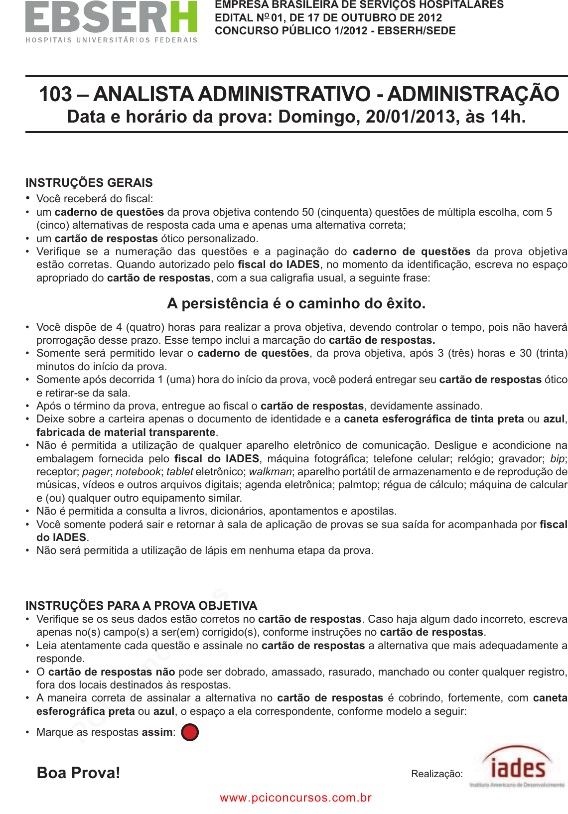 pcimarkpci MDAwMDowMDAwOjAwMDA6MDAwMDowMDAwOmZmZmY6YmFmOTpiNDVk:TW9uLCAwMyBGZWIgMjAyNSAxNDo1Njo1MyAtMDMwMA== www.pciconcursos.com.br EmPrESA BrASILEIrA dE SErvIÇoS HoSPITALArES EdITAL No 01, dE 17 dE oUTUBro dE 2012 CoNCUrSo PÚBLICo 1/2012 - EBSErH/SEdE 103 – ANALISTA AdmINISTrATIvo - AdmINISTrAÇÃo data e horário da prova: domingo, 20/01/2013, às 14h. INSTrUÇÕES GErAIS • Você receberá do fi scal: • um caderno de questões da prova objetiva contendo 50 (cinquenta) questões de múltipla escolha, com 5 (cinco) alternativas de resposta cada uma e apenas uma alternativa correta; • um cartão de respostas ótico personalizado. • Verifi que se a numeração das questões e a paginação do caderno de questões da prova objetiva estão corretas. Quando autorizado pelo fi scal do IADES, no momento da identifi cação, escreva no espaço apropriado do cartão de respostas, com a sua caligrafi a usual, a seguinte frase: A persistência é o caminho do êxito. • Você dispõe de 4 (quatro) horas para realizar a prova objetiva, devendo controlar o tempo, pois não haverá prorrogação desse prazo. Esse tempo inclui a marcação do cartão de respostas. • somente será permitido levar o caderno de questões, da prova objetiva, após 3 (três) horas e 30 (trinta) minutos do início da prova. • somente após decorrida 1 (uma) hora do início da prova, você poderá entregar seu cartão de respostas ótico e retirar-se da sala. • Após o término da prova, entregue ao fi scal o cartão de respostas, devidamente assinado. • deixe sobre a carteira apenas o documento de identidade e a caneta esferográfi ca de tinta preta ou azul, fabricada de material transparente. • não é permitida a utilização de qualquer aparelho eletrônico de comunicação. desligue e acondicione na embalagem fornecida pelo fi scal do IADES, máquina fotográfi ca; telefone celular; relógio; gravador; bip; receptor; pager; notebook; tablet eletrônico; walkman; aparelho portátil de armazenamento e de reprodução de músicas, vídeos e outros arquivos digitais; agenda eletrônica; palmtop; régua de cálculo; máquina de calcular e (ou) qualquer outro equipamento similar. • não é permitida a consulta a livros, dicionários, apontamentos e apostilas. • Você somente poderá sair e retornar à sala de aplicação de provas se sua saída for acompanhada por fi scal do IAdES. • não será permitida a utilização de lápis em nenhuma etapa da prova. INSTrUÇÕES PArA A ProvA oBJETIvA • Verifi que se os seus dados estão corretos no cartão de respostas. caso haja algum dado incorreto, escreva apenas no(s) campo(s) a ser(em) corrigido(s), conforme instruções no cartão de respostas. • leia atentamente cada questão e assinale no cartão de respostas a alternativa que mais adequadamente a responde. • O cartão de respostas não pode ser dobrado, amassado, rasurado, manchado ou conter qualquer registro, fora dos locais destinados às respostas. • A maneira correta de assinalar a alternativa no cartão de respostas é cobrindo, fortemente, com caneta esferográfi ca preta ou azul, o espaço a ela correspondente, conforme modelo a seguir: • Marque as respostas assim: Boa Prova! realização: www.pciconcursos.com.br pcimarkpci MDAwMDowMDAwOjAwMDA6MDAwMDowMDAwOmZmZmY6YmFmOTpiNDVk:TW9uLCAwMyBGZWIgMjAyNSAxNDo1Njo1MyAtMDMwMA== www.pciconcursos.com.brconcurso público 1/2012 - EbsErH/sEdE 103 - ANALISTA AdmINISTrATIvo - AdmINISTrAÇÃo pAG 2/14 Texto 1, para responder às questões de 1 a 4. CoNHECImENToS BÁSICoS - QUESTÕES 1 A 20 LÍNGUA PorTUGUESA – QUESTÕES 1 A 8 Toda obra gera entulho. É o dono da obra quem deve assegurar a destinação correta do entulho, normalmente os aterros. Quando isso não acontece, cerâmica, gesso, cimento, concreto, vergalhão, madeira e outros materiais aparecem abandonados em terrenos baldios, encostas de morros ou em leitos de rios e lagos. No Brasil, são recolhidos oi cialmente 33 milhões de toneladas de entulho por ano. Material sui ciente para construir quase 500 mil casas populares de 50 metros quadrados cada uma. Mas quem estuda o setor de construção civil admite que a quantidade gerada seja muito maior que essa. Há quem não veja no entulho problema, e sim uma solução. Em Belo Horizonte, por exemplo, o que é coletado nas ruas é levado para usinas de reciclagem. Tudo que chega é despejado e espalhado no pátio. A água ajuda a baixar a poeira. Aí começa a coleta das impurezas. Tudo que não pode entrar na reciclagem do entulho é impureza, e a cada dia são separadas 10 toneladas de impurezas, que vão para o aterro. O britador tritura todos os materiais em cinco diferentes tamanhos de grãos. Uma usina de reciclagem de entulho é uma linha de montagem de material de construção de diferentes tipos como, por exemplo, brita, que é muito comum para quem está fazendo obra, precisa de pedrinha. Ela vai substituir a brita natural na elaboração de blocos, pavimentação, meio-i o. Esse material natural, que antes seria lixo, passa a ser insumo para as nossas obras. “Se eu fosse buscar no mercado para todas as obras municipais, seria uma despesa importante, não só o material, a brita e a areia, como o material que a gente usa base e sub- base de pavimentação, cobertura de valas”, fala o diretor de Planejamento da Sup. Limpeza Urbana/BH, Lucas Garilho. A primeira usina foi inaugurada há 17 anos. Hoje são três em atividade, transformando 460 toneladas de detritos, por dia, em matéria-prima para a construção civil. Apenas no ano passado, Belo Horizonte reciclou mais de 112 mil toneladas de entulho. Com esse material, seria possível construir: 1.651 casas populares com 50 metros quadrados; 34 quilômetros de ruas com dez metros de largura; 67 escolas com mais de mil metros quadrados. Se fosse comprar esses materiais no mercado, Belo Horizonte teria de gastar aproximadamente R$ 7 milhões por ano. “Um bloco no mercado, ele e