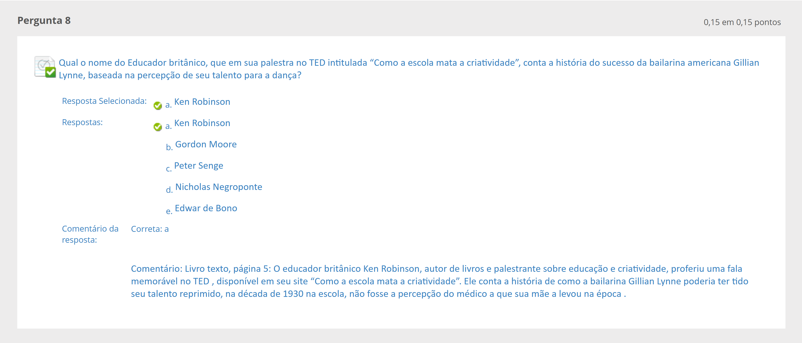 Pergunta 8 0,15 em 0,15 pontos Qual o nome do Educador britânico, que em sua palestra no TED intitulada "Como a escola mata a criatividade", conta a história do sucesso da bailarina americana Gillian Lynne, baseada na percepção de seu talento para a dança? Resposta Selecionada: a. Ken Robinson Respostas: a. Ken Robinson b. Gordon Moore Peter Senge d. Nicholas Negroponte e. Edwar de Bono Comentário da Correta: a Comentário: Livro texto, página 5: educador britânico Ken Robinson, autor de livros e palestrante sobre educação e criatividade, proferiu uma fala memorável no disponível em seu site "Como a escola mata a criatividade". Ele conta a história de como a bailarina Gillian Lynne poderia ter tido seu talento reprimido, na década de 1930 na escola, não fosse a percepção do médico a que sua mãe a levou na época