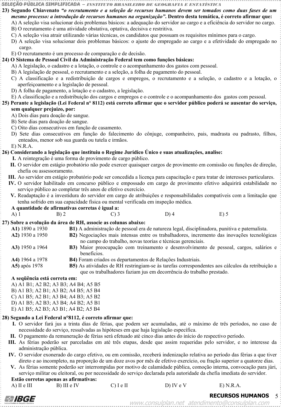 SSSEEELLLEEEÇÇÇÃÃÃOOO PPPÚÚÚBBBLLLIIICCCAAA SSSIIIMMMPPPLLLIIIFFFIIICCCAAADDDAAA − INSTITUTO BRASILEIRO DE GEOGRAFIA E ESTATÍSTICA RECURSOS HUMANOS www.consulplan.net atendimento@consulplan.com 5 23) Segundo Chiavenato “o recrutamento e a seleção de recursos humanos devem ser tomados como duas fases de um mesmo processo: a introdução de recursos humanos na organização”. Dentro desta temática, é correto afirmar que: A) A seleção visa solucionar dois problemas básicos: a adequação do servidor ao cargo e a eficiência do servidor no cargo. B) O recrutamento é uma atividade obstativa, optativa, decisiva e restritiva. C) A seleção visa atrair utilizando várias técnicas, os candidatos que possuam os requisitos mínimos para o cargo. D) A seleção visa solucionar dois problemas básicos: o ajuste do empregado ao cargo e a efetividade do empregado no cargo. E) O recrutamento é um processo de comparação e de decisão. 24) O Sistema de Pessoal Civil da Administração Federal tem como funções básicas: A) A legislação, o cadastro e a lotação, o controle e o acompanhamento dos gastos com pessoal. B) A legislação de pessoal, o recrutamento e a seleção, a folha de pagamento do pessoal. C) A classificação e a redistribuição de cargos e empregos, o recrutamento e a seleção, o cadastro e a lotação, o aperfeiçoamento e a legislação de pessoal. D) A folha de pagamento, a lotação e o cadastro, a legislação. E) A classificação e a redistribuição dos cargos e empregos e o controle e o acompanhamento dos gastos com pessoal. 25) Perante a legislação (Lei Federal n° 8112) está correto afirmar que o servidor público poderá se ausentar do serviço, sem qualquer prejuízo, por: A) Dois dias para doação de sangue. B) Sete dias para doação de sangue. C) Oito dias consecutivos em função de casamento. D) Sete dias consecutivos em função do falecimento do cônjuge, companheiro, pais, madrasta ou padrasto, filhos, enteados, menor sob sua guarda ou tutela e irmãos. E) N.R.A. 26) Considerando a legislação que instituiu o Regime Jurídico Único e suas atualizações, analise: I. A reintegração é uma forma de provimento de cargo público. II. O servidor em estágio probatório não pode exercer quaisquer cargos de provimento em comissão ou funções de direção, chefia ou assessoramento. III. Ao servidor em estágio probatório pode ser concedida a licença para capacitação e para tratar de interesses particulares. IV. O servidor habilitado em concurso público e empossado em cargo de provimento efetivo adquirirá estabilidade no serviço público ao completar três anos de efetivo exercício. V. Readaptação é a investidura do servidor em cargo de atribuições e responsabilidades compatíveis com a limitação que tenha sofrido em sua capacidade física ou mental verificada em inspeção médica. A quantidade de afirmativas corretas é igual a: A) 1 B) 2 C) 3 D) 4 E) 5 27) Sobre a evolução da área de RH, associe as colunas abaixo: A1) 1890 a 1930 B1) A administração de pessoal era de natureza legal, disciplinadora, punitiva e paternalista. A2) 1930 a 1950 B2) Negociações mais intensas entre os trabalhadores, incremento das inovações tecnológicas no campo do trabalho, novas teorias e técnicas gerenciais. A3) 1950 a 1964 B3) Maior preocupação com treinamento e desenvolvimento de pessoal, cargos, salários e benefícios. A4) 1964 a 1978 B4) Foram criados os departamentos de Relações Industriais. A5) após 1978 B5) As atividades de RH restringiam-se às tarefas correspondentes aos cálculos da retribuição a que os trabalhadores faziam jus em decorrência do trabalho prestado. A seqüência está correta em: A) A1 B1; A2 B2; A3 B3; A4 B4; A5 B5 B) A1 B3; A2 B1; A3 B2; A4 B5; A5 B4 C) A1 B5; A2 B1; A3 B4; A4 B3; A5 B2 D) A1 B5; A2 B3; A3 B4; A4 B2; A5 B1 E) A1 B5; A2 B3; A3 B1; A4 B2; A5 B4 28) Segundo a Lei Federal n°8112, é correto afirmar que: I. O servidor fará jus a trinta dias de férias, que podem ser acumuladas, até o máximo de três períodos, no caso de necessidade do serviço, ressalvadas as hipóteses em que haja legislação específica. II. O pagamento da remuneração de férias será efetuado até cinco dias antes do início do respectivo período. III. As férias poderão ser parceladas em até três etapas, desde que assim requeridas pelo servidor, e no interesse da administração pública. IV. O servidor exonerado do cargo efetivo, ou em comissão, receberá indenização relativa ao período das férias a que tiver direto e ao incompleto, na proporção de um doze avos por mês de efetivo exercício, ou fração superior a quatorze dias. V. As férias somente poderão ser interrompidas por motivo de calamidade pública, comoção interna, convocação para júri, serviço militar ou eleitoral, ou por necessidade do serviço declarada pela autoridade da chefia imediata do servidor. Estão corretas apenas as afirmativas: A) II e III B) III e IV C) I e II D) IV e V E) N.R.A. SSSEEELLLEEEÇÇÇÃÃÃOOO PPPÚÚÚBBBLLLIIICCCAAA SSSIIIMMMPPPLLLIIIFFFIIICCCAAADDDAAA − INSTITUTO BRASILEIRO DE GEOGRAFIA E ESTATÍSTICA RECURSOS HUMANOS www.consulplan.net atendimento@consulplan.com 6 29) Analise as afirmativas abaixo: I. O servidor investido em mandato eletivo federal, estadual ou distrital fica afastado do cargo, sendo-lhe facultado optar pela sua remuneração. II. O servidor investido em mandato de prefeito é afastado do cargo, sendo-lhe facultado optar pela sua remuneração. III. O servidor investido em mandato de vereador e com compatibilidade de horário recebe as vantagens do seu cargo, sem prejuízo da remuneração do cargo eletivo. IV. O servidor investido em mandato de vereador e com incompatibilidade de horário é afastado do cargo, não sendo-lhe facultado optar pela sua remuneração. V. O servidor investido em mandato eletivo ou classista pode ser removido ou redistribuído de ofíci