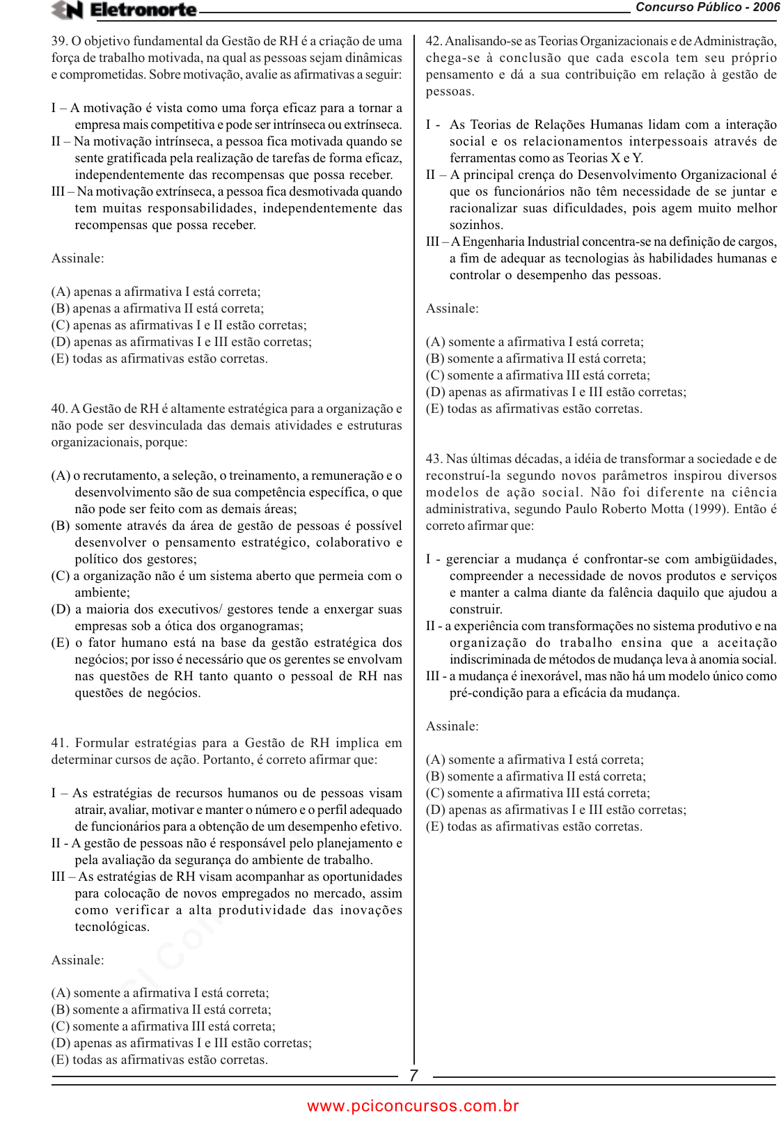 pcimarkpci MDAwMDowMDAwOjAwMDA6MDAwMDowMDAwOmZmZmY6YmZiOTphZTFk:U3VuLCAwMiBGZWIgMjAyNSAyMjo0OToxNyAtMDMwMA== www.pciconcursos.com.br 7 Concurso Público - 2006 39. O objetivo fundamental da Gestão de RH é a criação de uma força de trabalho motivada, na qual as pessoas sejam dinâmicas e comprometidas. Sobre motivação, avalie as afirmativas a seguir: I – A motivação é vista como uma força eficaz para a tornar a empresa mais competitiva e pode ser intrínseca ou extrínseca. II – Na motivação intrínseca, a pessoa fica motivada quando se sente gratificada pela realização de tarefas de forma eficaz, independentemente das recompensas que possa receber. III – Na motivação extrínseca, a pessoa fica desmotivada quando tem muitas responsabilidades, independentemente das recompensas que possa receber. Assinale: (A) apenas a afirmativa I está correta; (B) apenas a afirmativa II está correta; (C) apenas as afirmativas I e II estão corretas; (D) apenas as afirmativas I e III estão corretas; (E) todas as afirmativas estão corretas. 40. A Gestão de RH é altamente estratégica para a organização e não pode ser desvinculada das demais atividades e estruturas organizacionais, porque: (A) o recrutamento, a seleção, o treinamento, a remuneração e o desenvolvimento são de sua competência específica, o que não pode ser feito com as demais áreas; (B) somente através da área de gestão de pessoas é possível desenvolver o pensamento estratégico, colaborativo e político dos gestores; (C) a organização não é um sistema aberto que permeia com o ambiente; (D) a maioria dos executivos/ gestores tende a enxergar suas empresas sob a ótica dos organogramas; (E) o fator humano está na base da gestão estratégica dos negócios; por isso é necessário que os gerentes se envolvam nas questões de RH tanto quanto o pessoal de RH nas questões de negócios. 41. Formular estratégias para a Gestão de RH implica em determinar cursos de ação. Portanto, é correto afirmar que: I – As estratégias de recursos humanos ou de pessoas visam atrair, avaliar, motivar e manter o número e o perfil adequado de funcionários para a obtenção de um desempenho efetivo. II - A gestão de pessoas não é responsável pelo planejamento e pela avaliação da segurança do ambiente de trabalho. III – As estratégias de RH visam acompanhar as oportunidades para colocação de novos empregados no mercado, assim como verificar a alta produtividade das inovações tecnológicas. Assinale: (A) somente a afirmativa I está correta; (B) somente a afirmativa II está correta; (C) somente a afirmativa III está correta; (D) apenas as afirmativas I e III estão corretas; (E) todas as afirmativas estão corretas. 42. Analisando-se as Teorias Organizacionais e de Administração, chega-se à conclusão que cada escola tem seu próprio pensamento e dá a sua contribuição em relação à gestão de pessoas. I - As Teorias de Relações Humanas lidam com a interação social e os relacionamentos interpessoais através de ferramentas como as Teorias X e Y. II – A principal crença do Desenvolvimento Organizacional é que os funcionários não têm necessidade de se juntar e racionalizar suas dificuldades, pois agem muito melhor sozinhos. III – A Engenharia Industrial concentra-se na definição de cargos, a fim de adequar as tecnologias às habilidades humanas e controlar o desempenho das pessoas. Assinale: (A) somente a afirmativa I está correta; (B) somente a afirmativa II está correta; (C) somente a afirmativa III está correta; (D) apenas as afirmativas I e III estão corretas; (E) todas as afirmativas estão corretas. 43. Nas últimas décadas, a idéia de transformar a sociedade e de reconstruí-la segundo novos parâmetros inspirou diversos modelos de ação social. Não foi diferente na ciência administrativa, segundo Paulo Roberto Motta (1999). Então é correto afirmar que: I - gerenciar a mudança é confrontar-se com ambigüidades, compreender a necessidade de novos produtos e serviços e manter a calma diante da falência daquilo que ajudou a construir. II - a experiência com transformações no sistema produtivo e na organização do trabalho ensina que a aceitação indiscriminada de métodos de mudança leva à anomia social. III - a mudança é inexorável, mas não há um modelo único como pré-condição para a eficácia da mudança. Assinale: (A) somente a afirmativa I está correta; (B) somente a afirmativa II está correta; (C) somente a afirmativa III está correta; (D) apenas as afirmativas I e III estão corretas; (E) todas as afirmativas estão corretas. www.pciconcursos.com.br pcimarkpci MDAwMDowMDAwOjAwMDA6MDAwMDowMDAwOmZmZmY6YmZiOTphZTFk:U3VuLCAwMiBGZWIgMjAyNSAyMjo0OToxNyAtMDMwMA== www.pciconcursos.com.br 8 Concurso Público - 2006 44. Os altos executivos se sentem constantemente ameaçados e temem perder o controle de suas organizações. Isso ocorre porque: I - a maioria se vê em meio a uma transição desordenada nos estilos e teorias gerenciais, pela rapidez das mudanças atuais. II - precisam conquistar posição entre seus pares e subordinados e defendê-la em cada etapa do caminho, porque o mundo se tornou muito competitivo. III - as mudanças são provocadas por muitas variáveis, mas as mudanças não são mais uma constante no mundo atual, devido à globalização. Assinale: (A) somente a afirmativa I está correta; (B) somente a afirmativa II está correta; (C) somente a afirmativa III está correta; (D) apenas as afirmativas I e II estão corretas; (E) todas as afirmativas estão corretas. 45. Constantemente nas organizações, são designadas para a gerência de RH pessoas bem-intencionadas e experientes, mas sem formação específica ou background teórico na área. Isto ocorre porque muitos consideram que para administrar é necessário apenas bom senso. São falácias da Gestão de RH: I – as pessoas não se adaptam a uma ampla variedade 