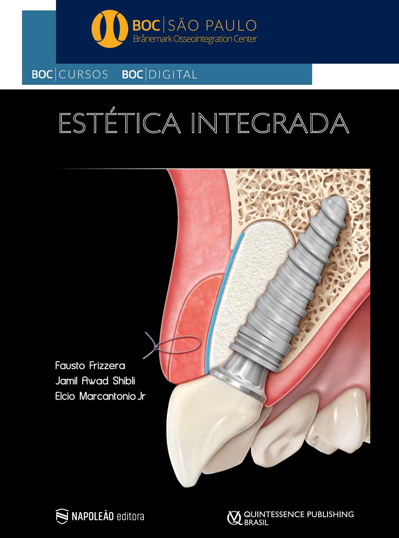 EM PERIODONTIA E IMPLANTODONTIA ESTÉTICA INTEGRADA Fausto Frizzera Jamil Awad Shibl i Elcio Marcantonio Jr EBOOK INSTALAÇÃO DE IMPLANTE EM ALVÉOLOS como obter o posicionamento ideal CAPÍTULO 6 Fausto Frizzera, Luiz Guilherme Freitas de Paula, Ana Carolina M. Marcantonio, Camila C. Marcantonio, Jamil A. Shibli, Elcio Marcantonio Jr 1. INTRODUÇÃO Há uma grande preocupação com o posicionamento do implante no alvéolo e à espessura tecidual na região an- terior, pois existe uma associação com a ocorrência de dificuldades protéticas e biológicas1. Um dos objetivos de realizar a técnica de implante imediato em alvéolos é diminuir o tempo de tratamento e o de procedimen- tos cirúrgicos, mas para seu sucesso é necessário que o implante seja instalado em uma posição tridimensional ideal2. Este posicionamento é considerado como a maior dificuldade da técnica já que, se o implante for instala- do em uma posição inadequada, o tratamento poderá se tornar mais complicado e demorado que o tratamento convencional. Como na maioria dos procedimentos ci- rúrgicos estéticos, é importante que a técnica escolhida seja realizada por profissionais experientes, com o devi- do treinamento teórico e psicomotor3. Tanto nas implantações imediatas (tipo I) como precoces (tipo II) teremos dificuldade ao instrumentar e posicionar o implante no alvéolo, pois não houve tempo suficiente para a ocorrência de neoformação óssea que preencha o alvéolo. Caso não seja possível cronificar uma infecção associada ao dente que precisa ser extraído ou o defeito ósseo presente no alvéolo seja demasiadamente extenso, podemos optar pela implantação precoce, onde extrai-se o dente e espera-se de 4 a 8 semanas para o alvéolo ser fechado com tecidos moles. Em seguida, a ci- rurgia é então realizada com a confecção de um retalho extenso para permitir a enxertia óssea e gengival conco- mitantemente à instalação do implante. A realização de procedimentos minimamente inva- sivos, sem a elevação de retalho, dificulta a visualização do remanescente ósseo alveolar, porém, é uma aborda- gem atual e deve, sempre que possível, ser aplicada em alvéolos frescos4. A opção por escolher a implantação imediata e não realizar um retalho é vantajosa, pois evi- ta a formação de cicatrizes e queloides, reduz a perda óssea vestibular, a morbidade cirúrgica e o número de suturas, mas requer um conhecimento absoluto da ana- tomia da região que será operada5-10. OBJETIVOS Ao final do capítulo o leitor deverá ser capaz de: – Identificar a anatomia óssea dos alvéolos previamente à implantação. – Selecionar o implante ideal para ser instalado imediatamente após a exodontia. – Evitar erros de posicionamento de implantes em alvéolos frescos. [ 250 – 002 ] ESTÉTICA INTEGRADA EM PERIODONTIA E IMPLANTODONTIA [ 003 ] 01. A-D – Diferentes tipos de classificação para a relação existente entre raiz e rebordo11. 2. EMBASAMENTO CIENTÍFICO 2.1. ANATOMIA DO OSSO ALVEOLAR NA REGIÃO ANTERIOR A possibilidade de instalar o implante de maneira ime- diata dependerá da anatomia do alvéolo e do remanes- cente ósseo, sendo que nos cortes sagitais tomográficos é possível verificar a posição da raiz e sua relação com o rebordo ósseo maxilar (Figuras 01A-D). Essa relação foi classificada em quatro classes distintas11: – Classe I: a raiz está posicionada em contato com a cortical óssea vestibular. Prevalência de 81,1%; – Classe II: a raiz está centralizada no rebordo, não mantendo contato com a cortical óssea vestibular ou palatina. Prevalência de 6,5%; – Classe III: a raiz está posicionada em contato com a cortical óssea palatina. Prevalência de 0,7%; – Classe IV: pelo menos dois terços da raiz em contato com a cortical óssea vestibular e palatina. Prevalência de 11,7%. A relação anatômica mais desfavorável para a ins- talação de implantes imediatos é a apontada na classe IV, o que pode muitas vezes inviabilizar o procedimen- to devido à dificuldade do posicionamento tridimen- sional adequado do implante. Ao indicar a instalação de implante imediato logo após a exodontia, é preciso verificar se existe a presença de osso lingual/palatino e de pelo menos 3 mm de tecido ósseo apicalmente ao fundo do alvéolo para propiciar um adequado trava- mento e estabilidade do implante12 (Figuras 02A-D). A dificuldade em instalar implantes imediatos em alvéolos de dentes anteriores se dá pela característica da área onde serão realizadas as perfurações. A pare- de óssea palatina deve ser instrumentada sequencial- mente para acomodar um implante 2 a 3 mm distante da parede óssea vestibular para criação de um espaço para acomodação dos biomateriais, já em alvéolos com ausência de osso vestibular essa distância deve ser de 3 a 4 mm entre a futura plataforma do implante e a porção interna da gengiva vestibular13,14. A perfuração da parede palatina, entretanto, é dificultada pela pro- fundidade e inclinação do alvéolo, e as brocas tendem a escapar em direção ao fundo do alvéolo, o que pode inclinar a perfuração em direção à parede vestibular e até danificá-la15,16,17. Durante a confecção do leito cirúr- gico é preciso utilizar um prolongador de brocas, firmar o contra-ângulo durante a instrumentação e instalação do implante com pressão voltada à parede óssea pala- tina. Diversas técnicas foram descritas para facilitar a instrumentação do alvéolo, porém, mesmo assim o pro- cedimento é extremamente sensível e o máximo de pre- cisão deve ser almejado. 01A 01B 01C 01D CLASSE I CLASSE II CLASSE III CLASSE IV INSTALAÇÃO DE IMPLANTE EM ALVÉOLOS [ 004 ] 2.2. PREPARO DO ALVÉOLO PARA RECEBER UM IMPLANTE Antes da utilização das brocas helicoidais, sugere-se o preparo da parede óssea palatina com uma broca esfé- rica com 2 mm de diâmetro, de maneira a regularizar o osso no sentido AC e VL15 (Figuras