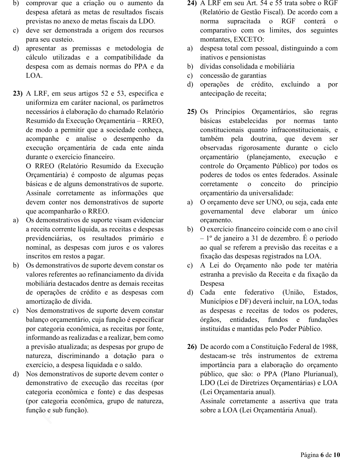 pcimarkpci MDAwMDowMDAwOjAwMDA6MDAwMDowMDAwOmZmZmY6YmZiOTphZTFk:TW9uLCAwMyBGZWIgMjAyNSAyMTowOTowNCAtMDMwMA== www.pciconcursos.com.brPágina 6 de 10 b) comprovar que a criação ou o aumento da despesa afetará as metas de resultados fiscais previstas no anexo de metas fiscais da LDO. c) deve ser demonstrada a origem dos recursos para seu custeio. d) apresentar as premissas e metodologia de cálculo utilizadas e a compatibilidade da despesa com as demais normas do PPA e da LOA. 23) A LRF, em seus artigos 52 e 53, especifica e uniformiza em caráter nacional, os parâmetros necessários à elaboração do chamado Relatório Resumido da Execução Orçamentária – RREO, de modo a permitir que a sociedade conheça, acompanhe e analise o desempenho da execução orçamentária de cada ente ainda durante o exercício financeiro. O RREO (Relatório Resumido da Execução Orçamentária) é composto de algumas peças básicas e de alguns demonstrativos de suporte. Assinale corretamente as informações que devem conter nos demonstrativos de suporte que acompanharão o RREO. a) Os demonstrativos de suporte visam evidenciar a receita corrente líquida, as receitas e despesas previdenciárias, os resultados primário e nominal, as despesas com juros e os valores inscritos em restos a pagar. b) Os demonstrativos de suporte devem constar os valores referentes ao refinanciamento da dívida mobiliária destacados dentre as demais receitas de operações de crédito e as despesas com amortização de dívida. c) Nos demonstrativos de suporte devem constar balanço orçamentário, cuja função é especificar por categoria econômica, as receitas por fonte, informando as realizadas e a realizar, bem como a previsão atualizada; as despesas por grupo de natureza, discriminando a dotação para o exercício, a despesa liquidada e o saldo. d) Nos demonstrativos de suporte devem conter o demonstrativo de execução das receitas (por categoria econômica e fonte) e das despesas (por categoria econômica, grupo de natureza, função e sub função). 24) A LRF em seu Art. 54 e 55 trata sobre o RGF (Relatório de Gestão Fiscal). De acordo com a norma supracitada o RGF conterá o comparativo com os limites, dos seguintes montantes, EXCETO: a) despesa total com pessoal, distinguindo a com inativos e pensionistas b) dívidas consolidada e mobiliária c) concessão de garantias d) operações de crédito, excluindo a por antecipação de receita; 25) Os Princípios Orçamentários, são regras básicas estabelecidas por normas tanto constitucionais quanto infraconstitucionais, e também pela doutrina, que devem ser observadas rigorosamente durante o ciclo orçamentário (planejamento, execução e controle do Orçamento Público) por todos os poderes de todos os entes federados. Assinale corretamente o conceito do princípio orçamentário da universalidade: a) O orçamento deve ser UNO, ou seja, cada ente governamental deve elaborar um único orçamento. b) O exercício financeiro coincide com o ano civil – 1º de janeiro a 31 de dezembro. É o período ao qual se referem a previsão das receitas e a fixação das despesas registrados na LOA. c) A Lei do Orçamento não pode ter matéria estranha a previsão da Receita e da fixação da Despesa d) Cada ente federativo (União, Estados, Municípios e DF) deverá incluir, na LOA, todas as despesas e receitas de todos os poderes, órgãos, entidades, fundos e fundações instituídas e mantidas pelo Poder Público. 26) De acordo com a Constituição Federal de 1988, destacam-se três instrumentos de extrema importância para a elaboração do orçamento público, que são: o PPA (Plano Plurianual), LDO (Lei de Diretrizes Orçamentárias) e LOA (Lei Orçamentaria anual). Assinale corretamente a assertiva que trata sobre a LOA (Lei Orçamentária Anual). pcimarkpci MDAwMDowMDAwOjAwMDA6MDAwMDowMDAwOmZmZmY6YmZiOTphZTFk:TW9uLCAwMyBGZWIgMjAyNSAyMTowOTowNCAtMDMwMA== www.pciconcursos.com.brPágina 7 de 10 a) A LOA estabelecerá, de forma regionalizada, as diretrizes, objetivos e metas da administração pública federal para as despesas de capital e outras delas decorrentes e para as relativas aos programas de duração continuada. b) A LOA compreenderá: o orçamento fiscal, o orçamento de investimento e o orçamento da seguridade social. c) A LOA compreenderá as metas e prioridades da administração pública federal, estabelecerá as diretrizes de política fiscal e respectivas metas, em consonância com trajetória sustentável da dívida pública, orientará a elaboração da lei orçamentária anual, disporá sobre as alterações na legislação tributária e estabelecerá a política de aplicação das agências financeiras oficiais de fomento. d) A LOA compreenderá: orçamento fiscal referente aos Poderes da União, seus fundos, órgãos e entidades da administração direta e indireta, exceto, fundações instituídas e mantidas pelo Poder Público. 27) As receitas orçamentárias podem ser classificadas de algumas formas, dentre elas temos: por fonte e destinação, por categoria econômica, por natureza da receita e por identificador de resultado primário. De acordo com o conceito dessas classificações de receitas orçamentárias, assinale corretamente a assertiva que refere – se a CLASSIFICAÇÃO ECONÔMICA das receitas orçamentárias. a) Essa classificação identifica/diferencia as receitas de caráter continuado, que são as correntes, das receitas eventuais, que são as de capital. b) Essa classificação atende a necessidade de classificar a receita conforme a destinação legal dos recursos arrecadados. c) Essa classificação demonstram o fato gerador que originou o ingresso dos recursos aos cofres públicos. d) A ideia dessa classificação é poder identificar quando uma receita é primária (P), ou seja, quando seu valor é computado na apuração do resultado (superavit ou déficit) primário ou financeira (F), quando não é considerada 