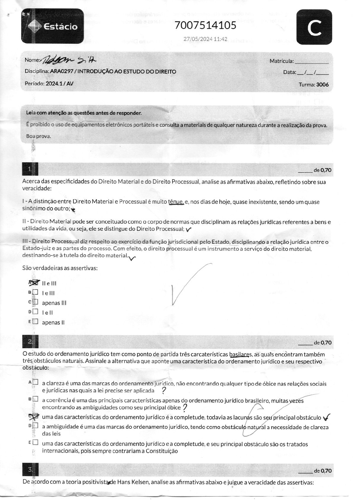 Estácio 7007514105 C 27/05/2024 11:42 Matrícula: Disciplina: AO ESTUDO DO DIREITO Data: / / Período: 2024.1/AV Turma: 3006 Leia com atenção as questões antes de responder. É proibido uso de equipamentos eletrônicos portáteis e consulta a materiais de qualquer natureza durante a realização da prova. Boa prova. 1 de 0,70 Acerca das especificidades do Direito Material e do Direito Processual, analise as afirmativas abaixo, refletindo sobre sua veracidade: I A distinção entre Direito Material e Processual é muito tênue. e, nos dias de hoje, quase inexistente, sendo um quase do II Direito Material pode ser conceituado como o corpo de normas que disciplinam as relações jurídicas referentes a bens e utilidades da vida, ou seja, ele se distingue do Direito Processual; III Direito Processual diz respeito ao exercício da função jurisdicional pelo Estado, disciplinando a relação jurídica entre o Estado-juiz e as partes do processo. Com efeito, o direito processual é um instrumento a serviço do direito material, destinando-se à tutela do direito material. São verdadeiras as assertivas: B apenas III D lell E apenas 2 de 0,70 estudo do ordenamento jurídico tem como ponto de partida três carcaterísticas basilares, as quals encontram também três obstáculos naturais. Assinale a alternativa que aponte uma característica do ordenamento jurídico e seu respectivo obstáculo: A a clareza é uma das marcas do ordenamento jurídico, não encontrando qualquer tipo de óbice nas relações sociais e jurídicas nas quais a lei precise ser aplicada ? B a coerência é uma das principais características apenas do ordenamento jurídico brasileiro, muitas vezes encontrando as ambiguidades como seu principal óbice ? uma das características do ordenamento jurídico é a completude, todavia as lacunas são seu principal obstáculo D a ambiguidade é uma das marcas do ordenamento jurídico, tendo como natural a necessidade de clareza das leis E uma das características do ordenamento jurídico e a completude, e seu principal obstáculo são os tratados internacionais, pois sempre contrariam a Constituição de 0,70 De acordo com a teoria Hans Kelsen, analise as afirmativas abaixo e julgue a veracidade das assertivas:- Na pirâmide de Kelsen, pode-se observar claramente o princípio hierárquico dentro do ordenamento jurídico, visto qué a Constituição está no topo da pirâmide, sendo assim, leis complementares e decretos devem sempre obedecer aos ditames constitucionais; II - Leis ordinárias, resoluções, portarias etc. fazem parte do que se chama no Direito de normas III Os Tratados Internacionais de Direitos Humanos estariam na mesma esfera da Constituição, sendo também considerados normas constitucionais. Estão corretas as assertivas: A B Apenas III le II E I III 4. de 0,70 No Brasil podemos dizer que, em sentido amplo, são fontes formais (escritas e não escritas) do Direito, exceto: a realidade social e o conjunto de fatos sociais A jurisprudência e os precedentes judiciais As resoluções D As leis ordinárias E A Constituição da República Federativa do Brasil 5. de 0,70 Modernamente, a ideia de sujeito de direito se desdobra em quais seguintes conceitos? Personalidade jurídica e capacidade jurídica B Personalidade jurídica e capacidade humana Cidadão e consumidor D Pessoa humana e individualidade E Indivíduo e coletividade 6. de 0,70 Todo evento, natural ou humano, que materializa uma hipótese normativa, a fim de produzir efeitos no mundo do direito, pode ser conceituado como: fato jurídico B poder jurídico sanção jurídica D obrigação jurídica E dever jurídico 7. de 0,70 A eficácia é um dos predicados comuns às normas jurídicas. Assinale a alternativa que apresenta o conceito desse predicado. A Eficácia é uma qualidade da norma que se refere à sua força vinculante, isto é, impossibilidade de os sujeitos a seu império. B Eficácia é uma qualidade da norma que diz respeito ao tempo da sua existência no ordenamento jurídico, que começa do momento em que ela entra em vigor até o momento em que é revogada. C n.r.a. ???D Eficácia é uma qualidade da norma que designa seu pertencimento ao ordenamento jurídico. Eficácia é uma qualidade da norma que se refere à possibilidade de produção de efeitos. 8 de 0,70 A palavra direito tem sua origem no latim directus, que significa aquele que segue regras predeterminadas ou um dado preceito. A raiz intuitiva do conceito deriva de direção, ligação, obrigatoriedade de um comportamento. Sobre os sinônimos da palavra direito, podemos afirmar, exceto: É o poder do qual decorre a faculdade de exigir a prestação ou abstenção de atos, ou o cumprimento da obrigação, a que outrem esteja sujeito. B Legislação ou lei, ou seja, o conjunto de normas legais em vigor do país. Direito como ciência cujo objeto de estudo é o fenômeno jurídico. D Conforme a justiça ou devido por justiça, expressão do injusto E Direito é uma ordem de conduta humana. 9. de 0,70 Segundo o Art. 1.723 do Código Civil, "É reconhecida como entidade familiar a união estável entre o homem e a mulher, configurada na convivência pública, contínua e duradoura e estabelecida com o objetivo de constituição de família" Contudo, no ano de 2011, os ministros do Supremo Tribunal Federal (STF), ao julgarem a Ação Direta de Inconstitucionalidade 4.277 e a Arguição de Descumprimento de Preceito Fundamental 132, reconheceram a união estável para casais do mesmo sexo. A situação acima descrita pode ser compreendida, à luz da Teoria Tridimendionaldo Direito de Miguel Reale, nos seguintes termos: fato social é que determina a correta compreensão do que é a experiência jurídica e, por isso, os costumes devem ter precedência sobre a letra fria da lei. B toda norma jurídica é interpretada pelo poder discricionário de magistrados, no momento em que estes transformam a vontade abstrata da lei em norma para o