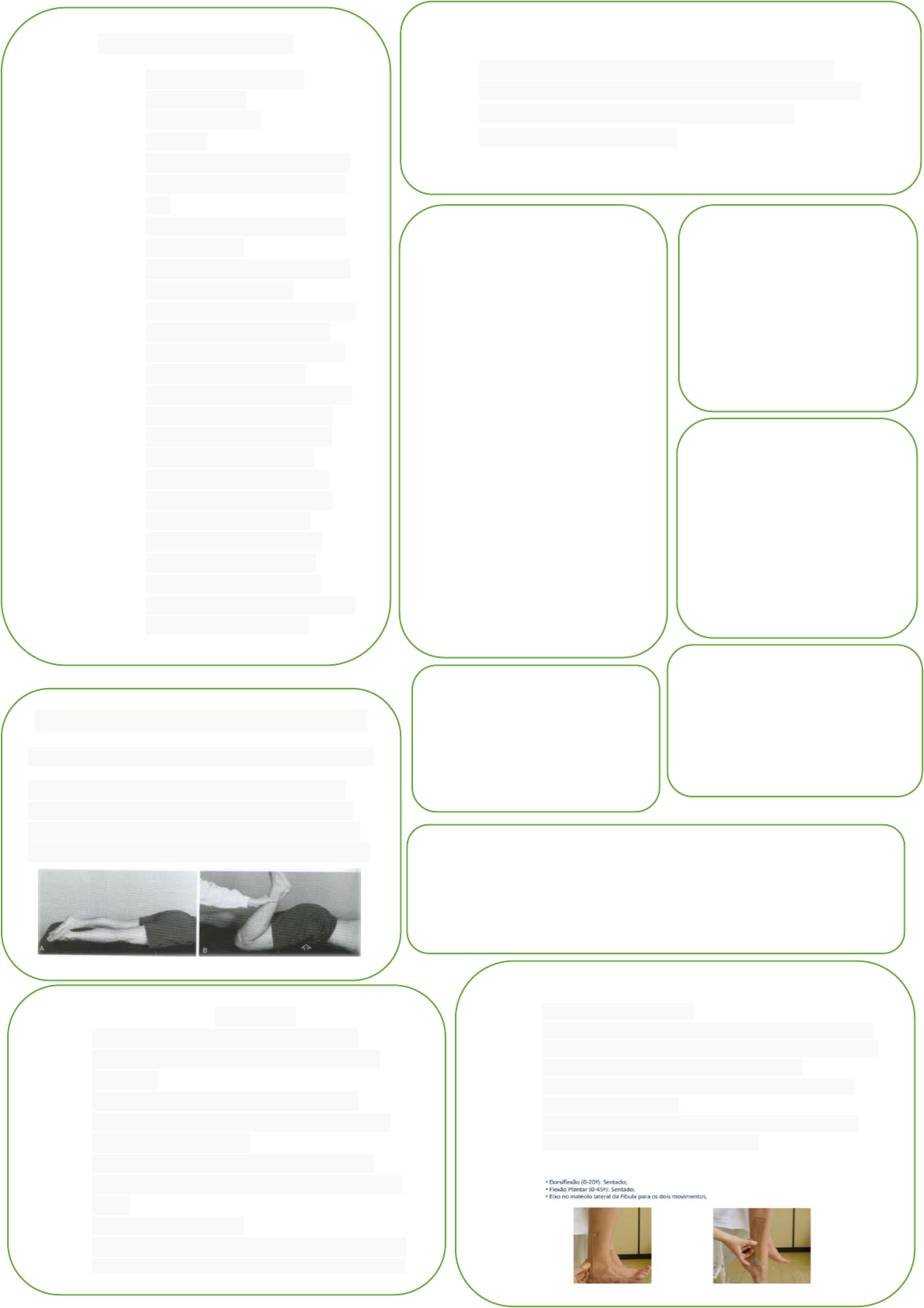 TENS CONVENCIONAL Indicado na dor aguda Tempo de duração: 25mn a 24 horas Uso clinico: LP: 100US e F:2HZ TENS Promove alivio da dor Frequência (HZ):de 1 a 150 HZ Duração/largura de pulso (UZ): de 50 a 300 FES Ganho de força Frequência: de 30 a 80HZ MMSS: 30 a 50HZ MMII: de 50 a 80HZ LP: 100 a 150US MMSS: 100 a 150US MMII: 200 a 250US Ciclo on: de 6 a 15s Rampa de subida: 1 a 3s Tempo de sustentação: de 1 a 13s Rampa de descida: de 1 a 3s Ciclo of: 1,2 ou 3 vezes o tempo de descida do ciclo on Tempo: máximo 15mn TENS ACUMPUTURAL Indicado na dor crônica Tempo de duração: máximo 45mn Uso clinico: LP:200US e F:4HZ TENS BURST Indicado na dor crônica Tempo de duração: máximo 45mn Uso clinico: LP:200US e F:2HZ ULTRASSOM TERAPÊUTICO INDICAÇÕES CLÁSSICAS: Reparo tecidual Efeito fibrinolítico Analgesia Parâmetros a serem regulados: Frequência do aparelho (Hertz- Hz): 1MHz= tecidos mais profundos (6a8cm-ORTO); 3MHz= tecidos mais superficiais (2 a 2,5cm-DERMATO); Obs: Quanto maior a frequência, mais superficial a absorção e maior a refração (diminuindo a penetração da vibração). MODOS: Contínuo: A onda US é transmitida sem interrupção, causando intensa vibração e, consequentemente, calor. Pulsado: Envelopes de pulso (10%, 20% -fase aguda e 50% subaguda/crônica). Efeito térmico nulo ou quase nulo .Frequência dos envelopes (16Hz, 48Hz -ambos reparo profundo/ósseo e 100Hz -reparo tecidual mais superficial). TFMM DO JOELHO Flexão: graus 3,4 e 5 sentado Graus 2,1 e 0 decúbito lateral Extensão: graus 5,4 e 3 decúbito ventral. Graus 2,1 e 0 sentado TFMM DO TORNOZELO E PÉ Dorsiflexão: Graus 3, 4 e 5= Sentado (Arco completo ou incompleto difere o 4 do 5); Grau 2, 1 e 0= Decúbito lateral; Flexão plantar: Graus 3, 4 e 5= Sentado ou De pé; Graus 2,1 e 0= Decúbito lateral TESTE DE ELY (MÚSCULO RETO FEMORAL): Objetivo: Teste de encurtamento muscular do quadril Decúbito ventral, o avaliador mantém uma flexão passiva total do joelho enquanto o quadril está em posição neutra. O teste é positivo se entre 60° e 90° da flexão passiva do joelho o paciente fletir o quadril. PERIMETRIA O seu objetivo é para medir e mensurar a circunferência dos membros superiores e/ou inferiores; Indicado para verificar edemas e trofismo muscular; Parâmetro evolutivo de tratamento; PERIMETRIA DOS MMSS •Pontos anatômicos de referência: Linha do cotovelo; Medidas de 3 ou 5cm para cima e para baixo. PERIMETRIA DOS MMII Pontos anatômicos de referência: Linha poplítea; Medidas de 5, 7 ou 10cm para cima e para baixo. GONIOMETRIA DOS MMII É um método para medir os ângulos articulares do corpo; É utilizado pelo fisioterapeuta para quantificar a limitação dos ângulos articulares, decidir a intervenção fisioterapêutica mais adequada e, ainda documentar a eficácia da intervenção; Utilizada para a avaliação e reavaliação de tratamento; GONIOMETRIA DO TORNOZELO E PÉ: TFMM DO QUADRIL: Flexão: Grau 3, 4 e 5 = Sentado (posição da mão na resistência); Grau 2, 1 e 0 = Decúbito lateral; Hiperextensão: Grau 3, 4 e 5 = Decúbito ventral (posição da mão na resistência); Grau 2, 1 e 0 = Decúbito lateral. Abdução: Grau 3, 4 e 5 = Decúbito lateral (posição da mão na resistência) membro não testado em tríplice flexão, encostado na maca; Grau 2, 1 e 0 = Decúbito dorsal; Adução: Grau 3, 4 e 5 = Decúbito lateral, membro não testado em tríplice flexão com pé plantado na maca (posição da mão na resistência); Grau 2, 1 e 0 = Decúbito dorsal. TESTE DETHOMAS (MÚSCULO ILIOPSOAS) Objetivo: Teste de encurtamento muscular do quadril; Manter o paciente em decúbito dorsal em uma maca com a região poplítea coincidindo com a borda desta, joelhos fletidos, pernas para fora da maca (posição inicial); TESTE DE THOMPSON: Objetivo: Verifica ruptura do tendão calcâneo; Paciente em decúbito ventral, com os pés fora da maca, o avaliador apalpa o ventre muscular da panturrilha, pressiona e observa se existe flexão plantar. TFII DO OMBRO: •Movimentos: Flexão de ombro; Extensão de ombro: o Adução de ombro; Abdução de ombro; Rotação medial de ombro; Rotação lateral de ombro; Principais músculos: Trapézio superior e elevador da escápula; Músculo trapézio médio; Músculo trapézio inferior Músculos romboides Músculo serrátil anterior Músculo peitoral menor e maior; Músculo deltoide (porção clavicular, acromial e espinal) Músculo coracobraquial; Músculo grande dorsal; Músculo redondo maior e menor Músculo supraespinhal e infraespinal; Músculo subescapular. TFII DO COTOVELO Músculos e movimentos: Braquial, bíceps braquial, braquiorradial, pronado redondo e flexor ulnar do carpo (Flexão do cotovelo); Tríceps Braquial e Ancôneo (Extensão do cotovelo); Supinador e bíceps do braço (Supinação do antebraço); Pronador quadrado, pronador redondo e flexor radial do carpo (Pronação do antebraço). TFII DE MÃOS E PUNHOS •Movimentos: Flexão de punho, mão e dedos, extensão de punho, mão e dedos, desvio ulnar, desvio radial e adução e abdução de dedos; •Músculos envolvidos: Adutor do polegar; Abdutor curto do polegar; Oponente do polegar Flexor longo e curto do polegar; Extensor longo e curto do polegar Abdutor longo do polegar; Mobilização ativa: O paciente irá realizar sozinho; O fisioterapeuta irá observar: Quando e onde, durante cada um dos movimentos, ocorre o início de dor; Se o movimento aumenta a intensidade e a qualidade da dor; A quantidade de restrição observável; O padrão de movimento; O ritmo e a qualidade do movimento; O movimento das articulações associadas Qualquer limitação e sua natureza. Mobilização passiva: O fisioterapeuta irá realizar no paciente; O fisioterapeuta irá observar: Quando e onde, durante cada um dos movimentos, ocorre o início de dor; Se o movimento aumenta a intensidade a qualidade da dor; O padrão de limitação do movimento; A sensação final do movimento; O m