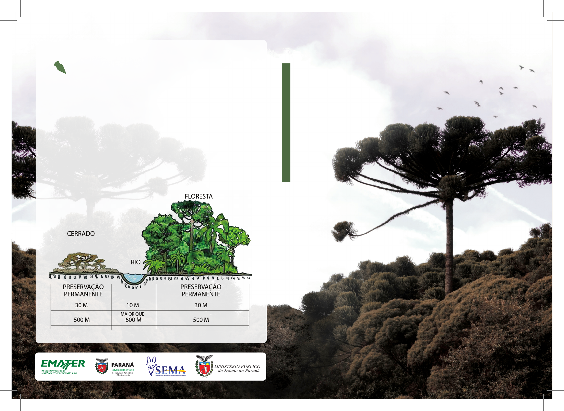 PINHEIRO ARAUCÁRIA Plantar e Preservar ÁREA DE PRESERVAÇÃO PERMANENTE – APP As Áreas de Preservação Permanente foram instituídas pelo Código Florestal e constituem-se em espaços territoriais protegidos, ambientalmente frágeis e vulneráveis, podendo ser públicas ou privadas, urbanas ou rurais. São APPs: as faixas marginais de qualquer curso d’água natural; as áreas no entorno de lagos e lagoas naturais, reservatórios arti�ciais, nascentes e olhos d’água; as encostas; as restingas; os manguezais; as bordas dos tabuleiros ou chapadas; o topo de morros, montes, montanhas e serras; as áreas em altitude superior a 1.800 metros e as veredas. A Araucaria angustifolia, conhecida como pinheiro do Paraná, é uma espécie nativa e exclusiva do Brasil. Suas matas fazem parte do bioma da Mata Atlântica e são encontradas principalmente na Região Sul e nos pontos de relevo mais elevados da Região Sudeste, pois a espécie não se adapta facilmente a lugares muito quentes, preferindo climas amenos. O pinheiro araucária pode atingir de 30 a 50 metros de altura e possuir tronco com até dois metros de diâmetro, tornando-se adulto após 20 anos. As sementes dessa árvore são conhecidas como pinhão e podem ser consumidas por humanos e animais, sendo saborosas e ricas em reservas energéticas (57% de amido) e em aminoácidos. Os pinhões �cam agrupados na pinha, que, quando amadurece, chega a pesar até 5 quilos, contendo aproximadamente 150 sementes por quilo. As araucárias são importantes na �xação do regime hídrico dos rios, bem como por criarem um habitat próprio e rico em biodiversidade. No entanto, a proliferação da espécie está bastante comprometida no Brasil. Atividades como a extração de madeira e a ocupação agropecuária, realizadas há décadas de forma indiscriminada, colocaram a araucária na lista o�cial das espécies da �ora brasileira ameaçadas de extinção. No estado do Paraná, dos 20 milhões de hectares ocupados originalmente por �orestas de araucárias, restam atualmente cerca de 2% dessa área. Uma das formas de evitar a extinção da araucária é fazer o plantio da espécie nas Áreas de Preservação Permanente (APPs) e nas Áreas de Reserva Legal, destinadas à conservação da biodiversidade, que são obrigatórias nas propriedades rurais. O Código Florestal Brasileiro permite tal prática e admite ainda a retirada e a comercialização dos pinhões, gerando renda aos agricultores familiares. O plantio pode ser feito por mudas ou sementes (pinhões), mas a semeadura direta dos pinhões é o método mais adequado. A melhor forma de plantar pinhões é colocá-los diretamente na terra, em buracos de até cinco centímetros de profundidade. Normalmente, colocam-se três pinhões por cova, na posição horizontal (deitados), deixando-se dois dedos de espaçamento entre eles. Deve haver a distância de cinco a dez metros entre os buracos, prevendo-se o tamanho da copa da árvore adulta. Um ou dois anos após o plantio, realiza-se o raleio das plantas, deixando-se em cada cova somente a árvore que mais cresceu. Caso sejam usadas mudas de pinheiro, na hora do plantio, deve ser veri�cado o sistema radicular, eliminando aquelas com raízes cachimbadas ou tortas. Esse tipo de muda causa a morte da planta antes de atingir cinco anos. Os pinhões ou as mudas de araucária não devem ser plantados em áreas alagadiças ou várzeas. O ideal é que o plantio ocorra em solos secos, localizados na parte mais alta do terreno. Para a produção de pinhões, deve existir pelo menos uma araucária “macho” para cada grupo de até 25 árvores “fêmeas”. COMO PLANTAR ARAUCÁRIAS IMPORTÂNCIA DA ARAUCÁRIA PINHEIRO ARAUCÁRIA