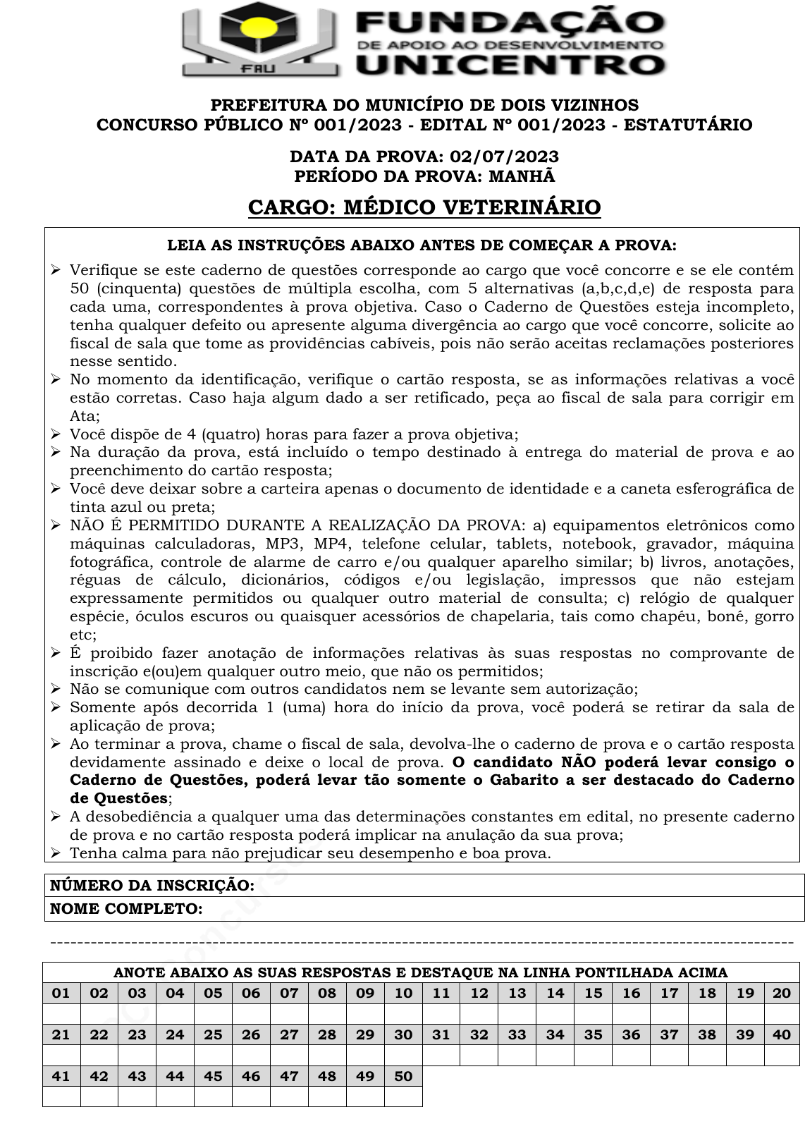 pcimarkpci MDAwMDowMDAwOjAwMDA6MDAwMDowMDAwOmZmZmY6OTU0ZTpiYjQ4:VHVlLCAwNCBGZWIgMjAyNSAxNToxNDo0NiAtMDMwMA== www.pciconcursos.com.br PREFEITURA DO MUNICÍPIO DE DOIS VIZINHOS CONCURSO PÚBLICO Nº 001/2023 - EDITAL Nº 001/2023 - ESTATUTÁRIO DATA DA PROVA: 02/07/2023 PERÍODO DA PROVA: MANHÃ CARGO: MÉDICO VETERINÁRIO -------------------------------------------------------------------------------------------------------------- LEIA AS INSTRUÇÕES ABAIXO ANTES DE COMEÇAR A PROVA: ➢ Verifique se este caderno de questões corresponde ao cargo que você concorre e se ele contém 50 (cinquenta) questões de múltipla escolha, com 5 alternativas (a,b,c,d,e) de resposta para cada uma, correspondentes à prova objetiva. Caso o Caderno de Questões esteja incompleto, tenha qualquer defeito ou apresente alguma divergência ao cargo que você concorre, solicite ao fiscal de sala que tome as providências cabíveis, pois não serão aceitas reclamações posteriores nesse sentido. ➢ No momento da identificação, verifique o cartão resposta, se as informações relativas a você estão corretas. Caso haja algum dado a ser retificado, peça ao fiscal de sala para corrigir em Ata; ➢ Você dispõe de 4 (quatro) horas para fazer a prova objetiva; ➢ Na duração da prova, está incluído o tempo destinado à entrega do material de prova e ao preenchimento do cartão resposta; ➢ Você deve deixar sobre a carteira apenas o documento de identidade e a caneta esferográfica de tinta azul ou preta; ➢ NÃO É PERMITIDO DURANTE A REALIZAÇÃO DA PROVA: a) equipamentos eletrônicos como máquinas calculadoras, MP3, MP4, telefone celular, tablets, notebook, gravador, máquina fotográfica, controle de alarme de carro e/ou qualquer aparelho similar; b) livros, anotações, réguas de cálculo, dicionários, códigos e/ou legislação, impressos que não estejam expressamente permitidos ou qualquer outro material de consulta; c) relógio de qualquer espécie, óculos escuros ou quaisquer acessórios de chapelaria, tais como chapéu, boné, gorro etc; ➢ É proibido fazer anotação de informações relativas às suas respostas no comprovante de inscrição e(ou)em qualquer outro meio, que não os permitidos; ➢ Não se comunique com outros candidatos nem se levante sem autorização; ➢ Somente após decorrida 1 (uma) hora do início da prova, você poderá se retirar da sala de aplicação de prova; ➢ Ao terminar a prova, chame o fiscal de sala, devolva-lhe o caderno de prova e o cartão resposta devidamente assinado e deixe o local de prova. O candidato NÃO poderá levar consigo o Caderno de Questões, poderá levar tão somente o Gabarito a ser destacado do Caderno de Questões; ➢ A desobediência a qualquer uma das determinações constantes em edital, no presente caderno de prova e no cartão resposta poderá implicar na anulação da sua prova; ➢ Tenha calma para não prejudicar seu desempenho e boa prova. NÚMERO DA INSCRIÇÃO: NOME COMPLETO: ANOTE ABAIXO AS SUAS RESPOSTAS E DESTAQUE NA LINHA PONTILHADA ACIMA 01 02 03 04 05 06 07 08 09 10 11 12 13 14 15 16 17 18 19 20 21 22 23 24 25 26 27 28 29 30 31 32 33 34 35 36 37 38 39 40 41 42 43 44 45 46 47 48 49 50 pcimarkpci MDAwMDowMDAwOjAwMDA6MDAwMDowMDAwOmZmZmY6OTU0ZTpiYjQ4:VHVlLCAwNCBGZWIgMjAyNSAxNToxNDo0NiAtMDMwMA== www.pciconcursos.com.br LÍNGUA PORTUGUESA Felino selvagem raro é visto em reserva da Mata Atlântica no Paraná Um felino selvagem, negro e raro é registrado em reserva protegida na Mata Atlântica por meio de câmeras, realizado em espaço conservado no Paraná, que captou em vídeo a imagem da mãe, com coloração inteiramente negra, e seu filhote com a coloração comum da espécie – o gato-do-mato-pequeno (Leopardus guttulus) – considerada em risco de extinção. A peculiaridade do registro se dá pela coloração da fêmea. Embora o melanismo – que é uma condição genética em que um indivíduo produz quantidade excessiva de melanina, resultando em uma coloração escura da pele – seja relativamente comum na natureza, o fenômeno é pouco observado entre a espécie. Estudos sugerem que a característica pode oferecer vantagens para felinos selvagens, como camuflagem e regulação da temperatura corporal. O flagrante foi feito na Reserva Natural Salto Morato, área de Mata Atlântica em Guaraqueçaba (PR) mantida pela Fundação Grupo Boticário de Proteção à Natureza, por pesquisadores do Programa Grandes Mamíferos da Serra do Mar, também apoiado pela mesma fundação em parceria com o WWF-Brasil. A espécie gato-do-mato-pequeno é um dos menores gatos selvagens das Américas e o menor felídeo (mamífero carnívoro) do Brasil. O gato-do-mato-pequeno está nas listas oficiais de espécies ameaçadas de extinção do Ministério do Meio Ambiente e da União Internacional para a Conservação da Natureza (IUCN), classificado como vulnerável. A captura das imagens foi feita no ano passado, por meio de armadilhas fotográficas, equipamentos que possuem câmera digital embutida com sensores de temperatura e movimento, permitindo o registro sem que haja contato com o animal. Como as câmeras são instaladas em mata fechada, o processo para conseguir verificar e analisar todas as imagens é demorado, por isso só foram divulgadas hoje (29). O gato-do-mato-pequeno é um dos menores gatos selvagens das Américas e o menor felídeo (mamífero carnívoro) do Brasil, com aparência similar aos gatos domésticos. Pesa entre 1,8 e 3,5 kg, e seu corpo mede de 36 a 54 cm, com cauda entre 22 e 35 cm. A cor da sua pele varia de amarelo-claro ao castanho, com manchas escuras. A espécie se alimenta principalmente de mamíferos pequenos, como roedores, além de aves, lagartos, répteis, anfíbios e insetos. O felino tem hábitos diurnos e noturnos e costuma ser solitária. O gato-do-mato-pequeno está nas listas oficiais de espécies ameaçadas de extinção do Ministério do Meio Ambiente, classificado como vulner