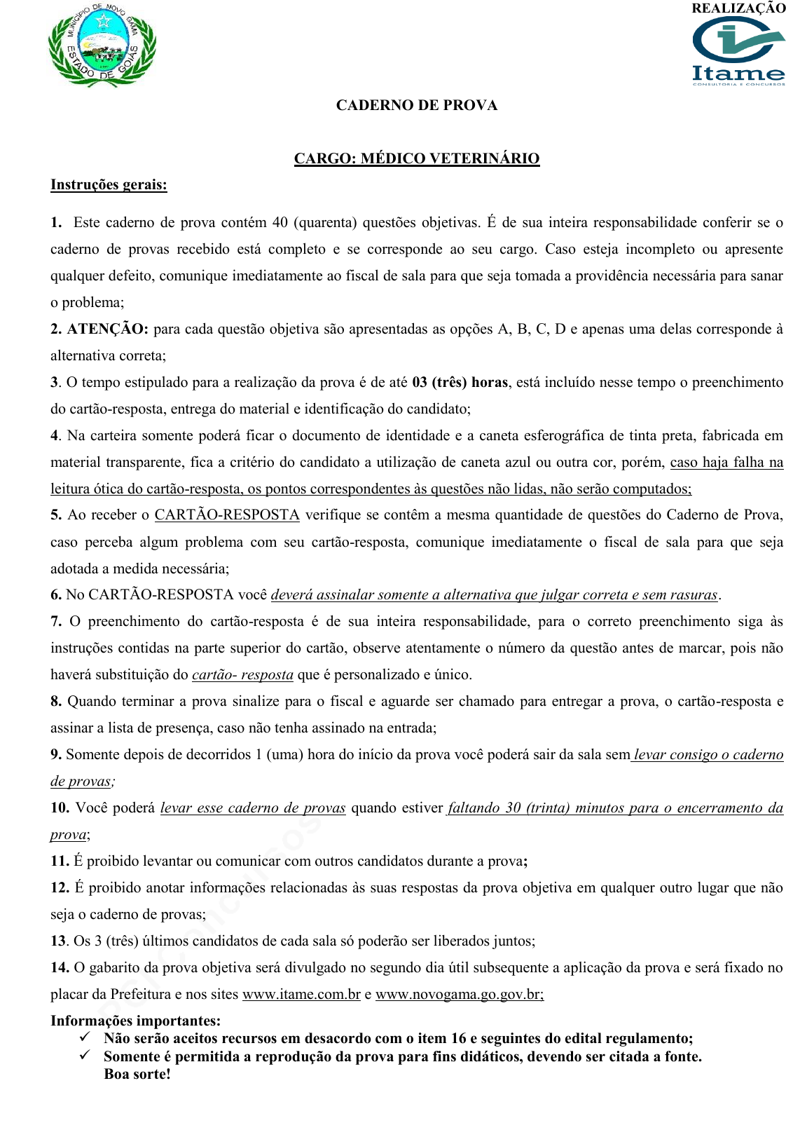 pcimarkpci MDAwMDowMDAwOjAwMDA6MDAwMDowMDAwOmZmZmY6OTU0ZTpiYjQ4:VHVlLCAwNCBGZWIgMjAyNSAxNDo1MjoxOCAtMDMwMA== www.pciconcursos.com.br REALIZAÇÃO CADERNO DE PROVA CARGO: MÉDICO VETERINÁRIO Instruções gerais: 1. Este caderno de prova contém 40 (quarenta) questões objetivas. É de sua inteira responsabilidade conferir se o caderno de provas recebido está completo e se corresponde ao seu cargo. Caso esteja incompleto ou apresente qualquer defeito, comunique imediatamente ao fiscal de sala para que seja tomada a providência necessária para sanar o problema; 2. ATENÇÃO: para cada questão objetiva são apresentadas as opções A, B, C, D e apenas uma delas corresponde à alternativa correta; 3. O tempo estipulado para a realização da prova é de até 03 (três) horas, está incluído nesse tempo o preenchimento do cartão-resposta, entrega do material e identificação do candidato; 4. Na carteira somente poderá ficar o documento de identidade e a caneta esferográfica de tinta preta, fabricada em material transparente, fica a critério do candidato a utilização de caneta azul ou outra cor, porém, caso haja falha na leitura ótica do cartão-resposta, os pontos correspondentes às questões não lidas, não serão computados; 5. Ao receber o CARTÃO-RESPOSTA verifique se contêm a mesma quantidade de questões do Caderno de Prova, caso perceba algum problema com seu cartão-resposta, comunique imediatamente o fiscal de sala para que seja adotada a medida necessária; 6. No CARTÃO-RESPOSTA você deverá assinalar somente a alternativa que julgar correta e sem rasuras. 7. O preenchimento do cartão-resposta é de sua inteira responsabilidade, para o correto preenchimento siga às instruções contidas na parte superior do cartão, observe atentamente o número da questão antes de marcar, pois não haverá substituição do cartão- resposta que é personalizado e único. 8. Quando terminar a prova sinalize para o fiscal e aguarde ser chamado para entregar a prova, o cartão-resposta e assinar a lista de presença, caso não tenha assinado na entrada; 9. Somente depois de decorridos 1 (uma) hora do início da prova você poderá sair da sala sem levar consigo o caderno de provas; 10. Você poderá levar esse caderno de provas quando estiver faltando 30 (trinta) minutos para o encerramento da prova; 11. É proibido levantar ou comunicar com outros candidatos durante a prova; 12. É proibido anotar informações relacionadas às suas respostas da prova objetiva em qualquer outro lugar que não seja o caderno de provas; 13. Os 3 (três) últimos candidatos de cada sala só poderão ser liberados juntos; 14. O gabarito da prova objetiva será divulgado no segundo dia útil subsequente a aplicação da prova e será fixado no placar da Prefeitura e nos sites www.itame.com.br e www.novogama.go.gov.br; Informações importantes: Não serão aceitos recursos em desacordo com o item 16 e seguintes do edital regulamento; Somente é permitida a reprodução da prova para fins didáticos, devendo ser citada a fonte. Boa sorte! pcimarkpci MDAwMDowMDAwOjAwMDA6MDAwMDowMDAwOmZmZmY6OTU0ZTpiYjQ4:VHVlLCAwNCBGZWIgMjAyNSAxNDo1MjoxOCAtMDMwMA== www.pciconcursos.com.brMunicípio de Novo Gama-GO / Médico Veterinário 1 1. Assinale a alternativa que completa corretamente as lacunas do texto, considerando a necessidade (ou não) de uso do acento grave (crase): Tudo que envolve _____ humana exige maior atenção dos especialistas. Talvez por isso não seja possível estudar a mente sem estar atento _____aspectos para além da capacidade cognitiva. ________, _____ entre sentimentos e pensamentos podem não parecer tão conectadas assim, mas vale _____ conferir mais profundamente. (A) a sensibilidade – a outros – À primeira vista – às relações – a pena. (B) a sensibilidade – à outros – A primeira vista – às relações – a pena. (C) a sensibilidade – a outros – À primeira vista – as relações – à pena. (D) a sensibilidade – a outros – À primeira vista – as relações – a pena. 2. Garante-se a coesão e a coerência textuais preenchendo-se as lacunas do texto, correta e respectivamente, com: Todo o tempo ouvimos falar____ o quanto o racismo foi e é pernicioso, o _____ se faz presente no cotidiano dos brasileiros. A escola pública, por exemplo, é um espaço ____ se encontram pessoas que sofrem com a ação nefasta ____ tipo de preconceito a todo momento. São muitos os relatos feitos pelos estudantes, vítimas constantes dessa crueldade naturalizada ___ cultura colonial. (A) a respeito – quanto – o qual – desse – pela. (B) sobre – quanto – onde – desse – pela. (C) desde – tanto – o qual – deste – com. (D) a cerca de – tanto – onde – desse – por causa. Texto para as questões 3, 4, 5 e 6. Em maio de 2023, o cirurgião-geral dos Estados Unidos divulgou um relatório sobre uma epidemia que cresceu silenciosamente no país durante décadas. Vivek Murthy declarou que os americanos se sentem solitários, muito mais do que o habitual, e isso representa uma ameaça ao bem-estar físico e emocional, além de ser um enorme problema de saúde pública. "O impacto na mortalidade de estar socialmente desconectado é semelhante ao de fumar 15 cigarros por dia", comparou o médico, que tem como função ser o principal porta-voz dos problemas de saúde do país e também dirigir um corpo de médicos do Exército norte- americano. Vários estudos apoiam as conclusões de Murthy, embora os resultados ainda sofram variações. [...] Disponível em: https://www.bbc.com/portuguese/articles/cl7x1w17q1vo. Acesso em: 05 out. 2023. 3. É correto afirmar que o trecho: "O impacto na mortalidade de estar socialmente desconectado é semelhante ao de fumar 15 cigarros por dia", apresenta o discurso: (A) direto, pois reproduz com exatidão a fala de uma pessoa. (B) indireto, porque a fala de uma pessoa é reproduzida por um interlocutor. (C) indireto livre, pois