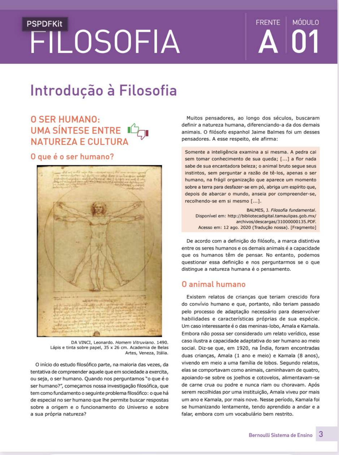 PSPDFKit FRENTE MÓDULO FILOSOFIA A 01 Introdução à Filosofia 0 SER HUMANO: Muitos pensadores, ao longo dos séculos, buscaram definir a natureza humana, diferenciando-a da dos demais UMA SÍNTESE ENTRE animais. o filósofo espanhol Jaime Balmes foi um desses NATUREZA E CULTURA pensadores. A esse respeito, ele afirma: Somente a inteligência examina a si mesma. A pedra cai 0 que é o ser humano? sem tomar conhecimento de sua queda; [...] a flor nada sabe de sua encantadora beleza; o animal bruto segue seus instintos, sem perguntar a razão de tê-los, apenas o ser humano, na frágil organização que aparece um momento sobre a terra para desfazer-se em pó, abriga um que, depois de abarcar o mundo, anseia por compreender-se, recolhendo-se em si mesmo [...]. BALMES, J. Filosofia fundamental. Disponível em: Acesso em: 12 ago. 2020 (Tradução nossa). [Fragmento] De acordo com a definição do filósofo, a marca distintiva entre os seres humanos e os demais animais é a capacidade que os humanos têm de pensar. No entanto, podemos questionar essa definição e nos perguntarmos se o que distingue a natureza humana é o pensamento. 0 animal humano Existem relatos de crianças que teriam crescido fora do convívio humano e que, portanto, não teriam passado pelo processo de adaptação necessário para desenvolver habilidades e características próprias de sua espécie. Um caso interessante é o das meninas-lobo, Amala e Kamala. Embora não possa ser considerado um relato verídico, esse DA VINCI, Leonardo. Homem 1490. caso ilustra a capacidade adaptativa do ser humano ao meio Lápis e tinta sobre papel, 35 26 cm. Academia de Belas social. Diz-se que, em 1920, na Índia, foram encontradas Artes, Veneza, duas crianças, Amala (1 ano e meio) e Kamala (8 anos), o início do estudo filosófico parte, na maioria das vezes, da vivendo em meio a uma família de lobos. Segundo relatos, tentativa de aquele que em sociedade a exercita, elas se comportavam como animais, caminhavam de quatro, ou seja, o ser humano. Quando nos perguntamos "o que é o apoiando-se sobre os joelhos e cotovelos, alimentavam-se ser humano?", começamos nossa investigação filosófica, que de carne crua ou podre e nunca riam ou choravam. Após tem como fundamento o seguinte problema filosófico: o que há serem recolhidas por uma instituição, Amala viveu por mais de especial no ser humano que lhe permite buscar respostas um ano e Kamala, por mais nove. Nesse período, Kamala foi sobre a origem e o funcionamento do Universo e sobre se humanizando lentamente, tendo aprendido a andar e a a sua própria natureza? falar, embora com um vocabulário bem restrito. Bernoulli Sistema de Ensino 3Frente A Módulo 01 Esse relato instiga a discussão sobre o que distingue o o ser humano é o único animal que não possui nenhuma ser humano dos outros animais. Levando esse caso em característica física especial que o capacite a lidar com os consideração, é possível afirmar que ser humano não nasce desafios das forças da natureza, sendo um dos animais com características culturais e sociais, tipicamente humanas, mais e um dos únicos desprovidos de aparatos mas as adquire devido ao processo de socialização decorrente naturais que garantam sua sobrevivência. No entanto, de sua integração em uma cultura. De acordo com o relato, devido à sua capacidade de pensar, ser humano consegue essas crianças, por terem sido privadas do contato humano criar mecanismos que lhe permitem superar as suas desde o seu nascimento, não realizavam ações como chorar, limitações sorrir e falar, e seu processo de humanização ocorreu apenas quando elas foram levadas para o convívio social, o que lhes Na história evolucionária, relativamente curta, documentada permitiu desenvolver algumas características, afastando-se, pelos restos fósseis, o homem não aperfeiçoou seu assim, do mundo desumanizado no qual estavam inseridas. equipamento hereditário por meio de modificações corporais em seu esqueleto. Não obstante, pôde ajustar-se a um número maior de ambientes do que qualquer outra criatura, multiplicar-se infinitamente mais depressa do que qualquer parente próximo entre os superiores, e derrotar o urso polar, a lebre, o gavião, o tigre, em seus recursos especiais. Pelo controle do fogo e pela habilidade de fazer roupas e casas, o homem pode viver, e vive e viceja, desde o Ártico até o Equador. Nos trens e carros que constrói, pode superar a mais rápida lebre ou avestruz. Nos aviões, pode subir mais alto que a águia, e, com os ver mais longe que o gavião. Com armas de fogo, pode derrubar animais que nem o tigre ousa atacar. Mas fogo, roupas, casas, trens, aviões, telescópios e revólveres Rômulo e Remo, segundo a mitologia romana, foram os fundadores não são, devemos repetir, parte do corpo do homem. Pode de Roma e teriam sido amamentados por uma loba. colocá-los de lado à sua vontade. Eles não são herdados no sentido biológico, mas o conhecimento necessário para sua Liberdade e determinismo produção e uso é parte do nosso legado social, resultado de uma tradição acumulada por muitas gerações e transmitida, De maneira geral, os animais vivem em harmonia com não pelo sangue, mas por meio da fala e da escrita. sua natureza, agindo de acordo com seus instintos, o que CHILDE, V. Gordon. A evolução cultural do homem. torna possível prever seu comportamento em diferentes Rio de Janeiro: Jorge Zahar, 1966. p. 40-41. situações. Por esse motivo, dizemos que os animais são seres determinados, uma vez que herdam de sua espécie a Enquanto os outros animais agem prioritariamente por programação biológica que dita as regras de comportamento, instinto, vivendo em um mundo fechado e sem liberdade, não sendo possível que um animal, por vontade ou raciocínio, adaptando-se à natureza e cumprindo as determinações "decida" não fazer algo ou possa agir de maneira diferente de sua herança biológica, o ser hu