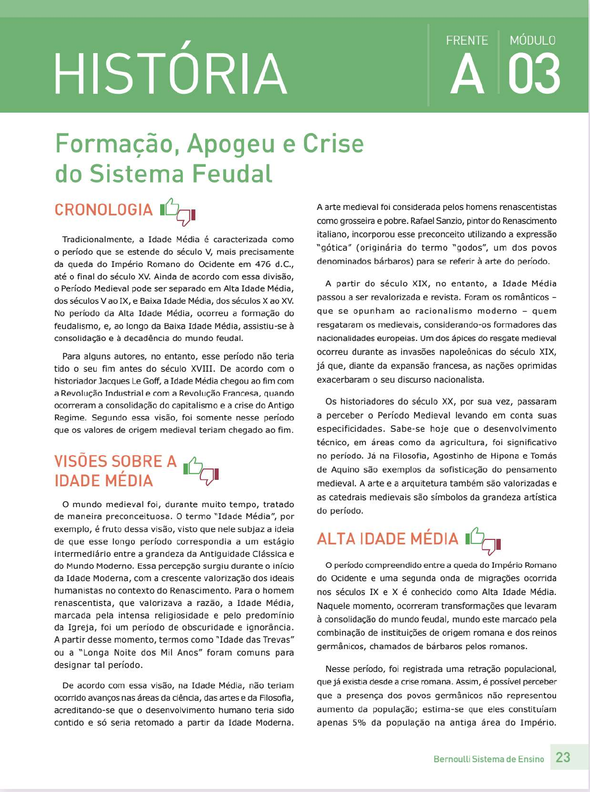 FRENTE MÓDULO HISTÓRIA A 03 Formação, Apogeu e Crise do Sistema Feudal CRONOLOGIA A arte medieval foi considerada pelos homens renascentistas como grosseira e pobre. Rafael Sanzio, pintor do Renascimento italiano, incorporou esse preconceito utilizando a expressão Tradicionalmente, a Idade Média é caracterizada como o período que se estende do século V, mais precisamente "gótica" (originária do termo "godos", um dos povos da queda do Império Romano do Ocidente em 476 d.C., denominados bárbaros) para se referir à arte do período. até o final do século XV. Ainda de acordo com essa divisão, A partir do século XIX, no entanto, a Idade Média o Período Medieval pode ser separado em Alta Idade Média, dos séculos V ao IX, e Baixa Idade Média, dos séculos X ao XV. passou a ser revalorizada e revista. Foram os românticos No período da Alta Idade Média, ocorreu a formação do que se opunham ao racionalismo moderno quem feudalismo, e, ao longo da Baixa Idade Média, assistiu-se à resgataram os medievais, considerando-os formadores das consolidação e à decadência do mundo feudal. nacionalidades europeias. Um dos ápices do resgate medieval Para alguns autores, no entanto, esse período não teria ocorreu durante as invasões napoleônicas do século XIX, tido o seu fim antes do século XVIII. De acordo com o já que, diante da expansão francesa, as nações oprimidas historiador Jacques Le Goff, a Idade Média chegou ao fim com exacerbaram o seu discurso nacionalista. a Revolução Industrial e com a Revolução Francesa, quando ocorreram a consolidação do capitalismo e a crise do Antigo Os historiadores do século XX, por sua vez, passaram Regime. Segundo essa visão, foi somente nesse período a perceber o Período Medieval levando em conta suas que os valores de origem medieval teriam chegado ao fim. especificidades. Sabe-se hoje que o desenvolvimento técnico, em áreas como da agricultura, foi significativo SOBRE A no período. Já na Filosofia, Agostinho de Hipona e Tomás de Aquino são exemplos da sofisticação do pensamento IDADE MÉDIA medieval. A arte e a arquitetura também são valorizadas e as catedrais medievais são símbolos da grandeza artística o mundo medieval foi, durante muito tempo, tratado do período. de maneira preconceituosa. o termo "Idade Média", por exemplo, é fruto dessa visão, visto que nele subjaz a ideia de que esse longo período correspondia a um estágio ALTAIDADE MÉDIA intermediário entre a grandeza da Antiguidade Clássica e do Mundo Moderno. Essa percepção surgiu durante início o período compreendido entre a queda do Império Romano da Idade Moderna, com a crescente valorização dos ideais do Ocidente e uma segunda onda de migrações ocorrida humanistas no contexto do Renascimento. Para o homem nos séculos IX e X é conhecido como Alta Idade Média. renascentista, que valorizava a razão, a Idade Média, Naquele momento, ocorreram transformações que levaram marcada pela intensa religiosidade e pelo predomínio à consolidação do mundo feudal, mundo este marcado pela da Igreja, foi um período de obscuridade e ignorância. combinação de instituições de origem romana e dos reinos A partir desse momento, termos como "Idade das Trevas" germânicos, chamados de bárbaros pelos romanos. ou a "Longa Noite dos Mil Anos" foram comuns para designar tal período. Nesse período, foi registrada uma retração populacional, De acordo com essa visão, na Idade Média, não teriam que já existia desde a crise romana. Assim, é possível perceben ocorrido avanços nas áreas da ciência, das artes e da Filosofia, que a presença dos povos germânicos não representou acreditando-se que o desenvolvimento humano teria sido aumento da população; estima-se que eles constituíam contido e só seria retomado a partir da Idade Moderna. apenas 5% da população na antiga área do Império. Bernoulli Sistema de Ensino 23Frente A Módulo 03 Concomitantemente a esse processo, o êxodo urbano se Após a morte de Clóvis, as disputas entre os merovíngios manteve, o que não significa que a vida urbana tenha levaram ao enfraquecimento da dinastia e à ascensão sido completamente abandonada. É importante ressaltar, dos carolíngios. Essa dinastia se iniciou com Carlos Martel ainda, que, paradoxalmente, a ruralização europeia (686-741), que conteve a expansão em direção à não acarretou uma prosperidade produtiva, já que a Europa Central ao derrotá-los na Batalha de Poitiers em 732. Alta Idade Média foi marcada pela expansão da fome e o auge desta dinastia, no entanto, deu-se com Carlos Magno das epidemias. (742-814) que, durante o período em que esteve no poder, contando com apoio da Igreja e com um reinado de grande Os povos germânicos formaram uma série de reinos na vigor pessoal, conseguiu manter extensos domínios unificados Europa Ocidental. o antigo Império havia se fragmentado, e conquistar novas áreas. Assim, enquanto nos demais reinos dando origem às chamadas monarquias germânicas, como predominavam a fragmentação e a instabilidade política, demonstrado no mapa a seguir: Império Carolíngio desfrutava de relativa unidade. o mapa a seguir demonstra a extensão do Império. Os reinos bárbaros no século VI Império Carolíngio N Jutas A Celtas N Frisões Bretões Saxões A Mar do OCEANO Eslavos Norte Bretões Paris Hunos Lombardos Gépidas Saxônia Ponto Euxino Aachen Roma Armênios Australásia Baviera Nêustria Atenas OCEANO Carintia Cartago Mouros Berberes Borgonha Mar Lombardia Aquitânia Alexandria 0 601 km Roma Reinos anglo-saxônicos Reino dos ostrogodos Demais povos Zona Reino dos visigodos Reino dos vândalos germânicos espanhola Territórios herdados Reino dos francos Império Romano do Oriente por Carlos Magno, 771 Territórios conquistados Reino dos suevos Reino dos por Carlos Magno 319 km Mar Mediterrâneo A expansão do Império Carolíngio acarretou fortalecimento 0 reino dos francos