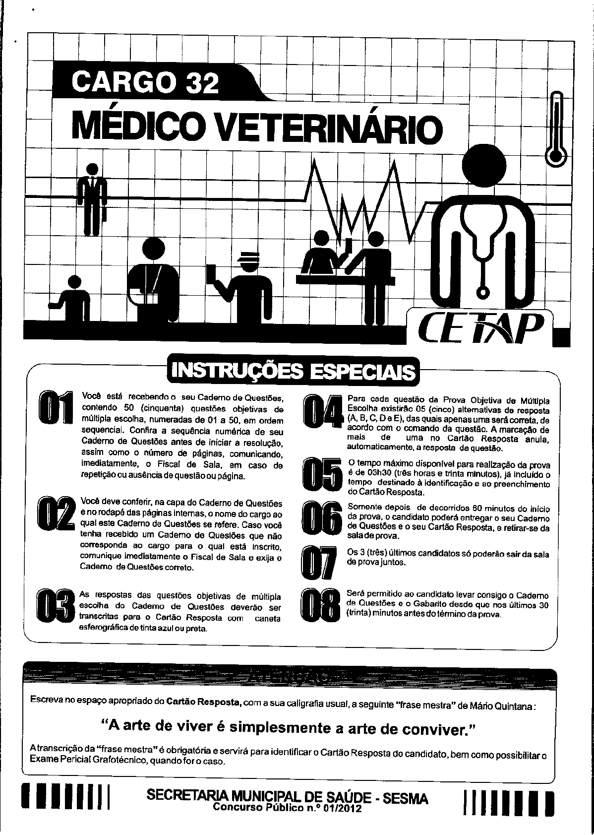 CARGO 32 MÉDICO VETERINÁRIO M CETAP INSTRUÇÕES ESPECIAIS 01 Você está recebendo o seu Caderno de Questões, 04 Para cada questão da Prova Objetiva de Múltipla contendo 50 (cinquenta) questões objetivas de Escolha existirão 05 (cinco) alternativas de resposta múltipla escolha, numeradas de 01 a 50, em ordem (A, B, D e E), das quais apenas uma será correta, de sequencial. Confira a sequência numérica de seu acordo com o comando da questão. A marcação de Caderno de Questões antes de iniciar a resolução, mais de uma no Cartão Resposta anula, automaticamente, a resposta da questão. assim como o número de páginas, comunicando, imediatamente, o Fiscal de Sala, em caso de repetição ou ausência de questão ou página. 05 o tempo máximo disponível para realização da prova é de 03h30 (três horas e trinta minutos), já incluído o tempo destinado à identificação e ao preenchimento do Cartão Resposta. 02 Você deve conferir, na capa do Caderno de Questões qual este Caderno de Questões se refere. Caso você 06 Somente depois de decorridos 60 minutos do início e no rodapé das páginas internas, o nome do cargo ao da prova, o candidato poderá entregar o seu Caderno de Questões e o seu Cartão Resposta, e retirar-se da tenha recebido um Caderno de Questões que não sala de prova. corresponda ao cargo para o qual está inscrito, comunique imediatamente o Fiscal de Sala e exija o Os 3 (três) últimos candidatos só poderão sair da sala de prova juntos. Caderno de Questões correto. 03 As respostas das questões objetivas de múltipla 08 Será permitido ao candidato levar consigo o escolha do Cademo de Questões deverão ser de Questões e o Gabarito desde que nos últimos 30 transcritas para o Cartão Resposta com caneta (trinta) minutos antes do término da prova. esferográfica de tinta azul ou preta. Escreva no espaço apropriado do Cartão Resposta, com a sua caligrafia usual, a seguinte "frase mestra" de Mário Quintana "A arte de viver é simplesmente a arte de conviver." A transcrição da "frase mestra" é obrigatória e servirá para identificar o Cartão Resposta do candidato, bem como possibilitar o Exame Pericial Grafotécnico, quando for o SECRETARIA MUNICIPAL DE SAÚDE - SESMA Concurso Público 01/2012www.cetapnet.com.br às manobras por mais e mais poder, e tudo o que gera violência, ignorância, miséria, agressividade, stress e o que disse aquele senador: Após a leitura do texto, responda o que se pede no comando Assim, higienizando minhas eu me sinto muito das questões. melhor. Estaria curada se quisesse me alienar de todo, mas isso não posso: sou uma habitante deste planeta e deste país, e o dla de não saber quero que tudo de bom ainda possa florescer por estas bandas, Andei uns dias com uma tristeza e um desânimo sem antes de se passarem aqueles meus profetizados 100 anos. razão que eu pudesse detectar, mas que me sobrevoavam como ave agourenta. Eu a mandava embora, ela depressa voltava. Fiz Fonte: LUFT, Lya. Revista VEJA, 25.04.2012. meus cálculos: filhos, netos e marido bem, saúde boa, trabalho bastante, ainda dando para pagar as contas. Mas eu me sentia doente. Questão 01 "Exames, consultas, tudo ótimo, você vai fácil aos 100", tranquilizou o médico amigo. Mas eu me sentia doente e nunca título do texto de Lya Luft, "O de não saber", quer dizer que: fui de hipocondrias. "Repouse um pouco. Pegue leve", ele disse. A) foi o dia em que ela fechou os olhos para todo e qualquer Em lugar de saltar da cama antes das 7, preparar o acontecimento da família e da café, tomá-lo na sala enquanto assistíamos ao noticioso, fiz o B) foi o momento em que a cronista parou um pouco e resolveu que, brincando, chamei de "vida de celebridade": ficava até mais tentar mudar hábitos do cotidiano. tarde na cama, às vezes o marido até trazia a simpática C) foi o dia em que ela resolveu não querer saber qual era o seu bandejinha. Procurei controlar minha natural ansiedade, nada de problema de saúde. me preocupar com tudo e com todos. Mais contemplativa, do D) foi o dia em que a escritora deixou de saber sobre alguns jeito que na verdade eu gosto. E aos poucos melhorei. Um día acordei, e tinham-se ido acontecimentos importantíssimos do nosso país e passou a só os sintomas e a tristeza. algum tempo para entender o que querer dormir. se passava: nos meus dias de preguiça deixei de ler os jornais e E) foi o momento em que ela, de acordo com ordens médicas, assistir aos noticiosos logo de manhã. Que santo remédio para afundou-se no trabalho para não saber de nada. meus males. Pois o que se ou vê não deveria ser o primeiro alimento da alma, como não feijoada ao sair da cama, ao menos imagino eu. Questão 02 Então retomei meu ritmo antigo bem de mansinho. Abro jornais e vejo noticiosos perto do meio-dia (assim também perco A alternativa que melhor representa o fragmento: "Assim, um pouco a fome e os quilos necessários). Pois o que vemos, higienizando minhas manhãs, eu me sinto muito melhor." é: lemos, ouvimos é mais de 90% deprimente, se não assustador. A) "Andei uns dias com uma tristeza e um desânimo sem razão [...]". Lembrei-me de um senador da República, Jefferson Péres, B) "Mas eu me sentia doente e nunca fui de hipocondrias." dizendo que deixaria a sua cadeira no Senado "com profundo C) "Em lugar de saltar da cama antes das 7 [...] fiz o que, desalento" pelo que ocorria neste país. Um dos raros pilares da brincando, de de grandeza e da ética, ele morreu em 2008, do coração, se não me D) "O rio de lama se transforma num mar engano em sua casa em seu estado natal. Não deve ser grave E) "[...] atribuir essa morte, em parte, ao peso daquele desalento erro atribuir essa morte, em parte, ao peso daquele desalento que devia ser enorme, vasto e profundo que devia ser enorme, vasto e profundo, para o levar àquele passo. Eu não posso abdicar de meu país, e de minha condição Questão 03 de quem aqui nasceu e escolhe t