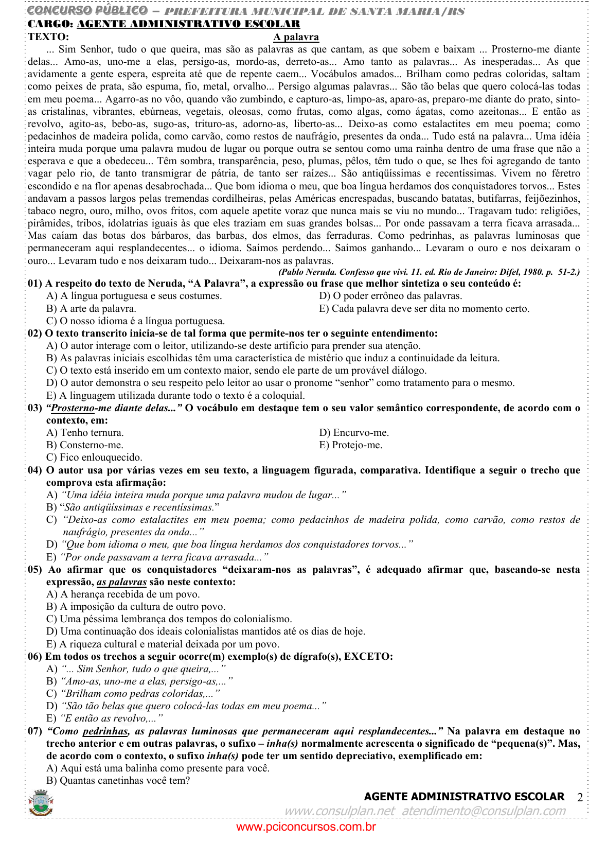 pcimarkpci MjgwNDowMjE0OjkwNjU6ZmNhMzozZDRmOjA1Mzg6MzhjMjo5YTQy:V2VkLCAwNSBGZWIgMjAyNSAwOToxMDozOSAtMDMwMA== www.pciconcursos.com.br CCCOOONNNCCCUUURRRSSSOOO PPPÚÚÚBBBLLLIIICCCOOO PREFEITURA MUNICIPAL DE SANTA MARIA/RS AGENTE ADMINISTRATIVO ESCOLAR www.consulplan.net atendimento@consulplan.com 2 CARGO: AGENTE ADMINISTRATIVO ESCOLAR TEXTO: A palavra ... Sim Senhor, tudo o que queira, mas são as palavras as que cantam, as que sobem e baixam ... Prosterno-me diante delas... Amo-as, uno-me a elas, persigo-as, mordo-as, derreto-as... Amo tanto as palavras... As inesperadas... As que avidamente a gente espera, espreita até que de repente caem... Vocábulos amados... Brilham como pedras coloridas, saltam como peixes de prata, são espuma, fio, metal, orvalho... Persigo algumas palavras... São tão belas que quero colocá-las todas em meu poema... Agarro-as no vôo, quando vão zumbindo, e capturo-as, limpo-as, aparo-as, preparo-me diante do prato, sinto- as cristalinas, vibrantes, ebúrneas, vegetais, oleosas, como frutas, como algas, como ágatas, como azeitonas... E então as revolvo, agito-as, bebo-as, sugo-as, trituro-as, adorno-as, liberto-as... Deixo-as como estalactites em meu poema; como pedacinhos de madeira polida, como carvão, como restos de naufrágio, presentes da onda... Tudo está na palavra... Uma idéia inteira muda porque uma palavra mudou de lugar ou porque outra se sentou como uma rainha dentro de uma frase que não a esperava e que a obedeceu... Têm sombra, transparência, peso, plumas, pêlos, têm tudo o que, se lhes foi agregando de tanto vagar pelo rio, de tanto transmigrar de pátria, de tanto ser raízes... São antiqüíssimas e recentíssimas. Vivem no féretro escondido e na flor apenas desabrochada... Que bom idioma o meu, que boa língua herdamos dos conquistadores torvos... Estes andavam a passos largos pelas tremendas cordilheiras, pelas Américas encrespadas, buscando batatas, butifarras, feijõezinhos, tabaco negro, ouro, milho, ovos fritos, com aquele apetite voraz que nunca mais se viu no mundo... Tragavam tudo: religiões, pirâmides, tribos, idolatrias iguais às que eles traziam em suas grandes bolsas... Por onde passavam a terra ficava arrasada... Mas caíam das botas dos bárbaros, das barbas, dos elmos, das ferraduras. Como pedrinhas, as palavras luminosas que permaneceram aqui resplandecentes... o idioma. Saímos perdendo... Saímos ganhando... Levaram o ouro e nos deixaram o ouro... Levaram tudo e nos deixaram tudo... Deixaram-nos as palavras. (Pablo Neruda. Confesso que vivi. 11. ed. Rio de Janeiro: Difel, 1980. p. 51-2.) 01) A respeito do texto de Neruda, “A Palavra”, a expressão ou frase que melhor sintetiza o seu conteúdo é: A) A língua portuguesa e seus costumes. D) O poder errôneo das palavras. B) A arte da palavra. E) Cada palavra deve ser dita no momento certo. C) O nosso idioma é a língua portuguesa. 02) O texto transcrito inicia-se de tal forma que permite-nos ter o seguinte entendimento: A) O autor interage com o leitor, utilizando-se deste artifício para prender sua atenção. B) As palavras iniciais escolhidas têm uma característica de mistério que induz a continuidade da leitura. C) O texto está inserido em um contexto maior, sendo ele parte de um provável diálogo. D) O autor demonstra o seu respeito pelo leitor ao usar o pronome “senhor” como tratamento para o mesmo. E) A linguagem utilizada durante todo o texto é a coloquial. 03) “Prosterno-me diante delas...” O vocábulo em destaque tem o seu valor semântico correspondente, de acordo com o contexto, em: A) Tenho ternura. D) Encurvo-me. B) Consterno-me. E) Protejo-me. C) Fico enlouquecido. 04) O autor usa por várias vezes em seu texto, a linguagem figurada, comparativa. Identifique a seguir o trecho que comprova esta afirmação: A) “Uma idéia inteira muda porque uma palavra mudou de lugar...” B) “São antiqüíssimas e recentíssimas.” C) “Deixo-as como estalactites em meu poema; como pedacinhos de madeira polida, como carvão, como restos de naufrágio, presentes da onda...” D) “Que bom idioma o meu, que boa língua herdamos dos conquistadores torvos...” E) “Por onde passavam a terra ficava arrasada...” 05) Ao afirmar que os conquistadores “deixaram-nos as palavras”, é adequado afirmar que, baseando-se nesta expressão, as palavras são neste contexto: A) A herança recebida de um povo. B) A imposição da cultura de outro povo. C) Uma péssima lembrança dos tempos do colonialismo. D) Uma continuação dos ideais colonialistas mantidos até os dias de hoje. E) A riqueza cultural e material deixada por um povo. 06) Em todos os trechos a seguir ocorre(m) exemplo(s) de dígrafo(s), EXCETO: A) “... Sim Senhor, tudo o que queira,...” B) “Amo-as, uno-me a elas, persigo-as,...” C) “Brilham como pedras coloridas,...” D) “São tão belas que quero colocá-las todas em meu poema...” E) “E então as revolvo,...” 07) “Como pedrinhas, as palavras luminosas que permaneceram aqui resplandecentes...” Na palavra em destaque no trecho anterior e em outras palavras, o sufixo – inha(s) normalmente acrescenta o significado de “pequena(s)”. Mas, de acordo com o contexto, o sufixo inha(s) pode ter um sentido depreciativo, exemplificado em: A) Aqui está uma balinha como presente para você. B) Quantas canetinhas você tem? www.pciconcursos.com.br pcimarkpci MjgwNDowMjE0OjkwNjU6ZmNhMzozZDRmOjA1Mzg6MzhjMjo5YTQy:V2VkLCAwNSBGZWIgMjAyNSAwOToxMDozOSAtMDMwMA== www.pciconcursos.com.br CCCOOONNNCCCUUURRRSSSOOO PPPÚÚÚBBBLLLIIICCCOOO PREFEITURA MUNICIPAL DE SANTA MARIA/RS AGENTE ADMINISTRATIVO ESCOLAR www.consulplan.net atendimento@consulplan.com 3 C) Uma corridinha para aquecer os músculos só faz bem. D) Esta comidinha tem um cheiro muito bom. E) Com que gentinha você foi se meter, hein?! 08) Observe o trecho a seguir: “Amo-as, uno-me a elas, persigo-as, mordo-as, derreto-as... Amo tanto as palavras...” I. Amo-a