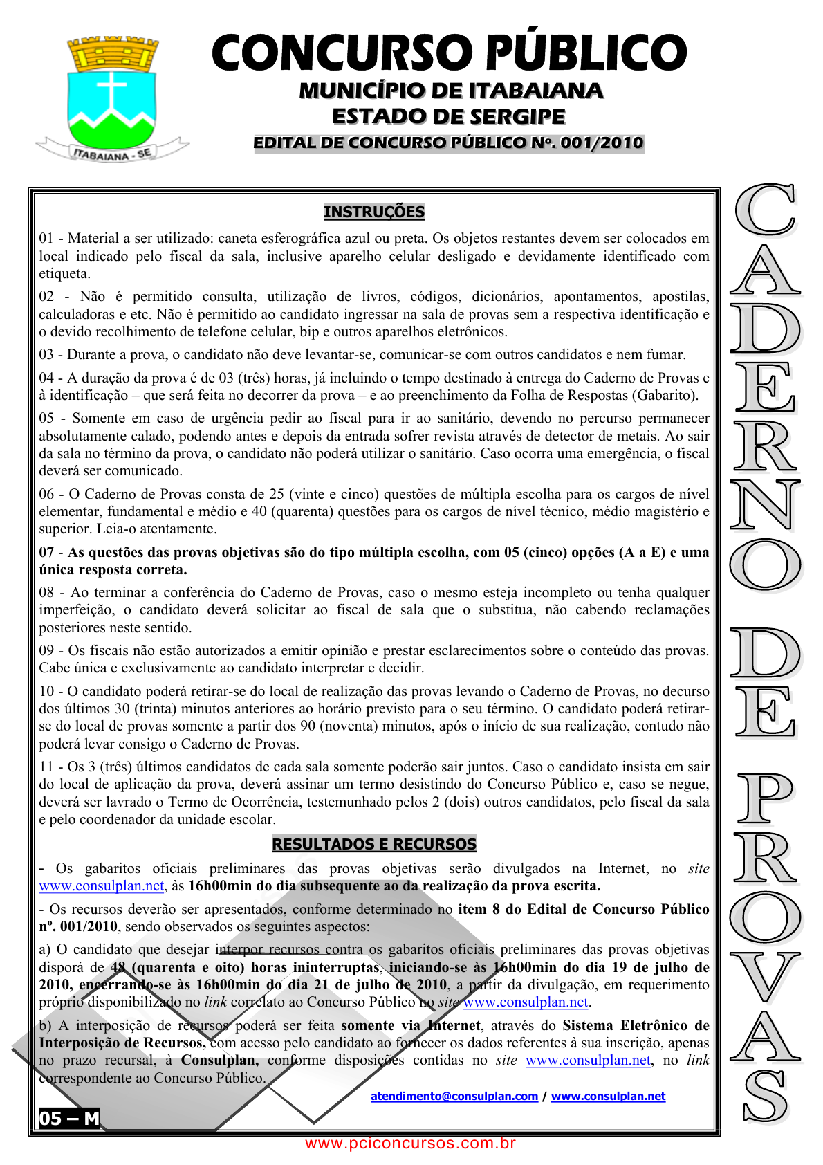 pcimarkpci MjgwNDowMjE0OjkwNjU6ZmNhMzozZDRmOjA1Mzg6MzhjMjo5YTQy:V2VkLCAwNSBGZWIgMjAyNSAwOToxNDozNyAtMDMwMA== www.pciconcursos.com.br MM INSTRUÇÕES 01 - Material a ser utilizado: caneta esferográfica azul ou preta. Os objetos restantes devem ser colocados em local indicado pelo fiscal da sala, inclusive aparelho celular desligado e devidamente identificado com etiqueta. 02 - Não é permitido consulta, utilização de livros, códigos, dicionários, apontamentos, apostilas, calculadoras e etc. Não é permitido ao candidato ingressar na sala de provas sem a respectiva identificação e o devido recolhimento de telefone celular, bip e outros aparelhos eletrônicos. 03 - Durante a prova, o candidato não deve levantar-se, comunicar-se com outros candidatos e nem fumar. 04 - A duração da prova é de 03 (três) horas, já incluindo o tempo destinado à entrega do Caderno de Provas e à identificação – que será feita no decorrer da prova – e ao preenchimento da Folha de Respostas (Gabarito). 05 - Somente em caso de urgência pedir ao fiscal para ir ao sanitário, devendo no percurso permanecer absolutamente calado, podendo antes e depois da entrada sofrer revista através de detector de metais. Ao sair da sala no término da prova, o candidato não poderá utilizar o sanitário. Caso ocorra uma emergência, o fiscal deverá ser comunicado. 06 - O Caderno de Provas consta de 25 (vinte e cinco) questões de múltipla escolha para os cargos de nível elementar, fundamental e médio e 40 (quarenta) questões para os cargos de nível técnico, médio magistério e superior. Leia-o atentamente. 07 - As questões das provas objetivas são do tipo múltipla escolha, com 05 (cinco) opções (A a E) e uma única resposta correta. 08 - Ao terminar a conferência do Caderno de Provas, caso o mesmo esteja incompleto ou tenha qualquer imperfeição, o candidato deverá solicitar ao fiscal de sala que o substitua, não cabendo reclamações posteriores neste sentido. 09 - Os fiscais não estão autorizados a emitir opinião e prestar esclarecimentos sobre o conteúdo das provas. Cabe única e exclusivamente ao candidato interpretar e decidir. 10 - O candidato poderá retirar-se do local de realização das provas levando o Caderno de Provas, no decurso dos últimos 30 (trinta) minutos anteriores ao horário previsto para o seu término. O candidato poderá retirar- se do local de provas somente a partir dos 90 (noventa) minutos, após o início de sua realização, contudo não poderá levar consigo o Caderno de Provas. 11 - Os 3 (três) últimos candidatos de cada sala somente poderão sair juntos. Caso o candidato insista em sair do local de aplicação da prova, deverá assinar um termo desistindo do Concurso Público e, caso se negue, deverá ser lavrado o Termo de Ocorrência, testemunhado pelos 2 (dois) outros candidatos, pelo fiscal da sala e pelo coordenador da unidade escolar. RESULTADOS E RECURSOS - Os gabaritos oficiais preliminares das provas objetivas serão divulgados na Internet, no site www.consulplan.net, às 16h00min do dia subsequente ao da realização da prova escrita. - Os recursos deverão ser apresentados, conforme determinado no item 8 do Edital de Concurso Público nº. 001/2010, sendo observados os seguintes aspectos: a) O candidato que desejar interpor recursos contra os gabaritos oficiais preliminares das provas objetivas disporá de 48 (quarenta e oito) horas ininterruptas, iniciando-se às 16h00min do dia 19 de julho de 2010, encerrando-se às 16h00min do dia 21 de julho de 2010, a partir da divulgação, em requerimento próprio disponibilizado no link correlato ao Concurso Público no site www.consulplan.net. b) A interposição de recursos poderá ser feita somente via Internet, através do Sistema Eletrônico de Interposição de Recursos, com acesso pelo candidato ao fornecer os dados referentes à sua inscrição, apenas no prazo recursal, à Consulplan, conforme disposições contidas no site www.consulplan.net, no link correspondente ao Concurso Público. 05 – M atendimento@consulplan.com / www.consulplan.net MUUUNNNIIICCCÍÍÍPPPIIIOOO DDDEEE IIITTTAAABBBAAAIIIAAANNNAAA EEESSSTTTAAADDDOOO DDDEEE SSSEEERRRGGGIIIPPPEEE EEEDDDIIITTTAAALLL DDDEEE CCCOOONNNCCCUUURRRSSSOOO PPPÚÚÚBBBLLLIIICCCOOO NNNººº... 000000111///222000111000 www.pciconcursos.com.br pcimarkpci MjgwNDowMjE0OjkwNjU6ZmNhMzozZDRmOjA1Mzg6MzhjMjo5YTQy:V2VkLCAwNSBGZWIgMjAyNSAwOToxNDozNyAtMDMwMA== www.pciconcursos.com.br CCCOOONNNCCCUUURRRSSSOOO PPPÚÚÚBBBLLLIIICCCOOO ––– MMMUUUNNNIIICCCÍÍÍPPPIIIOOO DDDEEE IIITTTAAABBBAAAIIIAAANNNAAA///SSSEEE AAGGEENNTTEE DDEE AANNIIMMAAÇÇÃÃOO CCUULLTTUURRAALL www.consulplan.net atendimento@consulplan.com - 2 - CCAARRGGOO:: AAGGEENNTTEE DDEE AANNIIMMAAÇÇÃÃOO CCUULLTTUURRAALL TEXTO I: Saiu da garagem, pagou A Holanda vai cobrar tarifa por quilômetro rodado de todos os carros do país. A intenção é diminuir os enormes congestionamentos de trânsito. Holanda, um dos países com maior densidade populacional da Europa, é também um dos que mais sofrem com congestionamentos de trânsito. Nos horários de pico, em Amsterdã e arredores, as lentidões chegam a se estender por 1000 quilômetros. Na tentativa de diminuir essa tortura diária infligida aos cidadãos, o ministério dos transportes holandês anunciou que, a partir de 2012, passará a cobrar uma taxa por quilômetro rodado de todos os carros que circulam no país. A tarifa básica será de 3 centavos de euro por quilômetro, com previsão de reajuste gradual até chegar a 6,7 centavos em 2017. Os valores serão maiores nas vias mais movimentadas e nos horários com volume de trânsito maior. Carros híbridos e muito econômicos terão descontos. Como compensação pela nova taxa, os impostos sobre veículos serão reduzidos. Até a cobrança entrar em vigor, todos os motoristas holandeses terão de equipar seus carros com aparelhos de GPS, que enviarão as informações sobre sua mo