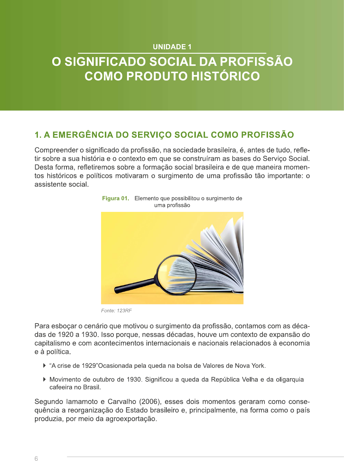 UNIDADE 1 O SIGNIFICADO SOCIAL DA PROFISSÃO COMO PRODUTO HISTÓRICO EMERGÊNCIA DO SERVIÇO SOCIAL COMO PROFISSÃO Compreender o significado da profissão, na sociedade brasileira, é, antes de tudo, refle- tir sobre a sua história e o contexto em que se construíram as bases do Serviço Social. Desta forma, refletiremos sobre a formação social brasileira e de que maneira momen- tos históricos e políticos motivaram o surgimento de uma profissão tão importante: o assistente social. Figura 01. Elemento que possibilitou o surgimento de uma profissão Fonte: 123RF Para esboçar o cenário que motivou o surgimento da profissão, contamos com as déca- das de 1920 a 1930. Isso porque, nessas décadas, houve um contexto de expansão do capitalismo e com acontecimentos internacionais e nacionais relacionados à economia e à política. "A crise de 1929"Ocasionada pela queda na bolsa de Valores de Nova York. Movimento de outubro de 1930. Significou a queda da República Velha e da oligarquia cafeeira no Segundo lamamoto e Carvalho (2006), esses dois momentos geraram como conse- quência a reorganização do Estado brasileiro e, principalmente, na forma como o país produzia, por meio da agroexportação. 6Essa reorganização da economia brasileira tinha ligações diretas com as transforma- ções na forma de produzir e reproduzir no capitalismo. Transformações que dizem res- peito à forma como o capitalismo desenvolvia-se globalmente. Figura 02. Transformação do capitalismo 1 Fonte: 123RF Assim, nas primeiras décadas do século XX, o capitalismo atingia um estágio até então nunca vivenciado, chegava a sua fase monopólica. O capitalismo monopolista constituiu- -se no estágio mais alto do capitalismo em escala planetária. A fase anterior à monopo- lística é o capitalismo concorrencial, que chega a seu ápice entre os anos 1860 a 1880. Capitalismo concorrencial. Período do capitalismo, no século XIX, cujas bases capitalistas amparavam-se na concorrência (BEHRING; BOSCHETTI, 2007). Capitalismo monopolista. Período no final do século XIX, até os anos 1930, caracterizado pelo desenvolvimento industrial, monopolização dos bancos, mudança nos padrões de pro- dução e consumo (BEHRING; BOSCHETTI, 2007). Com a formação de grandes conglome- rados industriais e bancários que acumulavam grandes quantidades de capital, o capitalis- mo atinge o seu auge, chegando à fase do que alguns autores chamam de Imperialismo. Figura 03. Fase imperialista do capitalismo Nessa etapa de desenvolvimento do capitalis- mo imperialista ou monopólico, a exploração do trabalho e das pessoas também chega a condições alarmantes, pois, para produzir o capital, é necessário a força de trabalho hu- mana. Isso porque, a partir do trabalho vivo, a natureza é transformada em mercadorias úteis. Nessa dinâmica, o homem vende a sua força de trabalho ao capitalista, que repassa para o trabalhador apenas uma parte do valor gerado a partir da força de trabalho (ALMEI- Fonte: 123RF DA; ALENCAR, 2011). Dessa maneira, ao vender a mercadoria, o capitalista obtém a mais valia, significando o excedente do lucro obtido ou a sobra resultante da explora- ção da força de trabalho. Nesse processo, gera acumulação de capital para o capitalista e exploração e desigualdade para o trabalhador. (ALMEIDA; ALENCAR, 2011) Fundamentos sócio-históricos do serviço social 7O significado social da profissão como produto histórico Diante desse contexto, em escala global, o aumento da produção do capitalismo em sua fase imperialista, consequentemente, aumenta também a produção da pobreza e da desi- gualdade na medida em que gera acumulação de riqueza para uns e pobreza para outros. 1 Nesse contexto, retomando o período entre as décadas de 1920 e 1930, diante do cenário de mudanças e o aumento da exploração do operariado, verificamos que a resposta dos trabalhadores à exploração foi iniciar movimentos de luta por melhores condições de vida e trabalho. Figura 04. Desigualdade Segundo lamamoto e Carvalho (2006), a questão social é entendida como manifestação cotidiana da vida social, expressa na contradição funda- mental entre capital e trabalho. Ainda assim, para os autores, a questão social também é rebeldia da classe explorada que reivindica pelo seu re- conhecimento como classe por parte do Estado e da burguesia. No período de expansão do capitalismo, no ce- Fonte: 123RF nário brasileiro, junto a esse processo, há junta- mente manifestação da questão social. Com o crescimento dos centros urbanos, bem como dos proletários e de seus movimentos de luta, crescem as manifestações da questão social. É nesse momento, em resposta à questão social e suas expressões, que surge o Serviço No entanto, o surgimento da profissão tem estreitas relações com a ação social da Igreja, nesse primeiro momento. lamamoto e Carvalho (2006) afirmam que, no período da década de 1920, a profissão em seu estágio inicial surge como departamento espe- cializado da ação social da Igreja, ligado ao movimento católico laico. Veremos mais a frente que essa relação inicial com a Igreja está ligada ao contexto de expansão e desenvolvimento do capitalismo. Não podemos perder de vista o panorama histórico, político e econômico em que se situa a emergência da profissão. Um dos movimentos importantes ocorridos na década de 1920, chegando a seu auge nesse período, é a primeira fase da reação católica. Esse processo é marcado, dentre outras questões, pela mobilização católica em resposta ao afastamento das relações entre a Igreja e o Estado. Afastamento que ocorre após a aprovação da Constituição Republicana de 1981, a qual: Retirava a obrigatoriedade do ensino religioso em escolas; Proibia a participação da Igreja no congresso; Proibia a abertura de comunidades religiosas, dentre outras ações. Observamos como consequência desses fatos a diminuição da parti