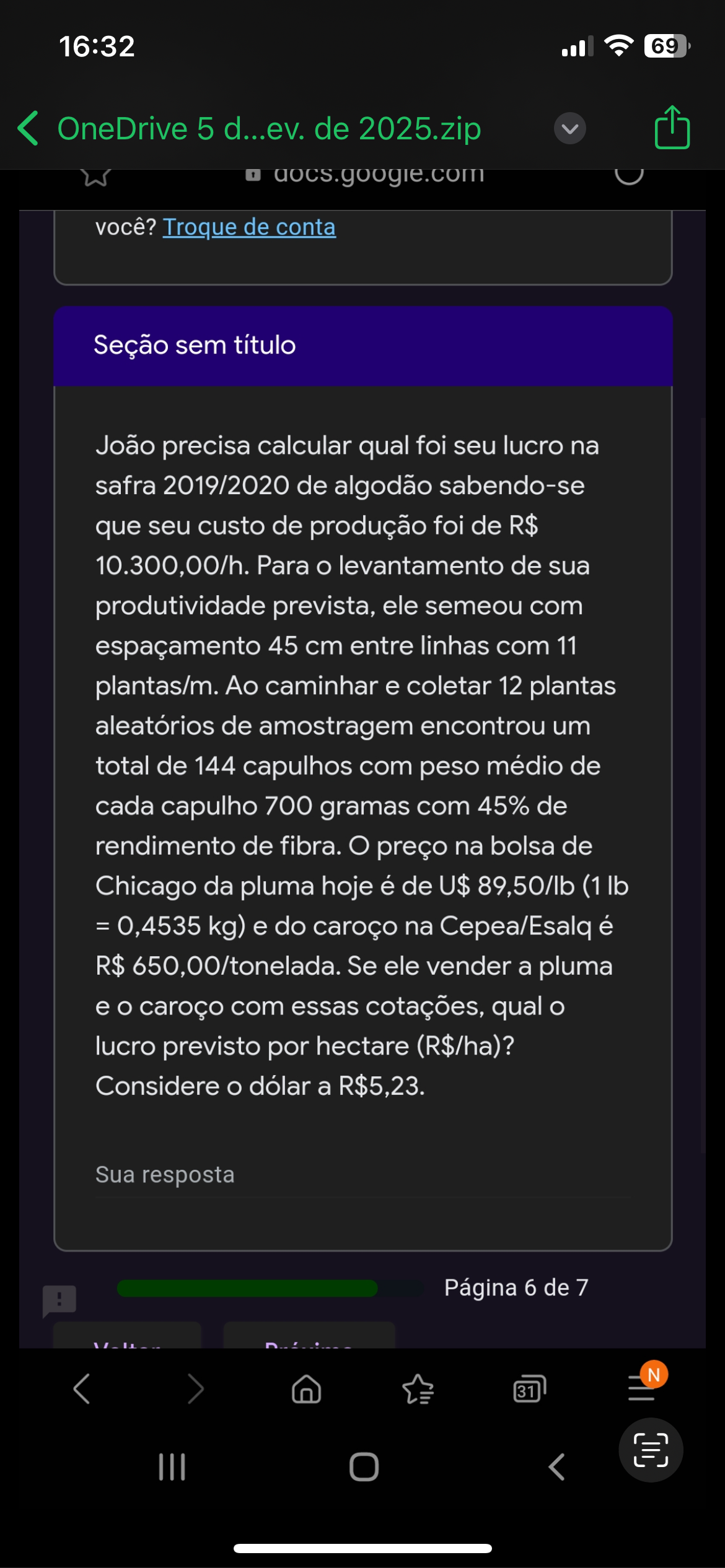 16:32 69 OneDrive 5 d...ev. de 2025.zip você? Troque de conta Seção sem título João precisa calcular qual foi seu lucro na safra 2019/2020 de algodão sabendo-se que seu custo de produção foi de R$ 10.300,00/h. Para levantamento de sua produtividade prevista, ele semeou com espaçamento 45 cm entre linhas com 11 plantas/m. Ao caminhar e coletar 12 plantas aleatórios de amostragem encontrou um total de 144 capulhos com peso médio de cada capulho 700 gramas com 45% de rendimento de fibra. O preço na bolsa de Chicago da pluma hoje é de U$ 89,50/lb (1 lb = 0,4535 kg) e do caroço na Cepea/Esalq é R$ 650,00/tonelada Se ele vender a pluma e caroço com essas cotações, qual lucro previsto por hectare (R$/ha)? Considere dólar a R$5,23. Sua resposta Página 6 de 7 N 31 III