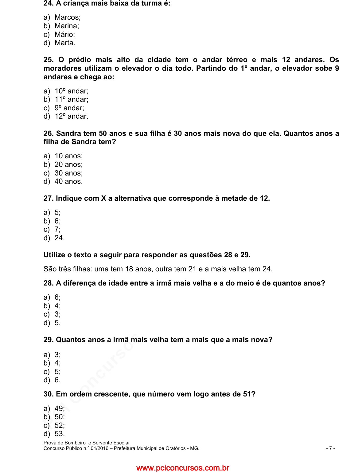 pcimarkpci MjgwNDowMTRjOjViYWU6ODBiMjo0OTE1OmZhMjQ6Y2ZiMjoxZjc2:V2VkLCAwNSBGZWIgMjAyNSAyMjowNToxMiAtMDMwMA== www.pciconcursos.com.br Prova de Bombeiro e Servente Escolar Concurso Público n.º 01/2016 – Prefeitura Municipal de Oratórios - MG. - 7 - 24. A criança mais baixa da turma é: a) Marcos; b) Marina; c) Mário; d) Marta. 25. O prédio mais alto da cidade tem o andar térreo e mais 12 andares. Os moradores utilizam o elevador o dia todo. Partindo do 1º andar, o elevador sobe 9 andares e chega ao: a) 10º andar; b) 11º andar; c) 9º andar; d) 12º andar. 26. Sandra tem 50 anos e sua filha é 30 anos mais nova do que ela. Quantos anos a filha de Sandra tem? a) 10 anos; b) 20 anos; c) 30 anos; d) 40 anos. 27. Indique com X a alternativa que corresponde à metade de 12. a) 5; b) 6; c) 7; d) 24. Utilize o texto a seguir para responder as questões 28 e 29. São três filhas: uma tem 18 anos, outra tem 21 e a mais velha tem 24. 28. A diferença de idade entre a irmã mais velha e a do meio é de quantos anos? a) 6; b) 4; c) 3; d) 5. 29. Quantos anos a irmã mais velha tem a mais que a mais nova? a) 3; b) 4; c) 5; d) 6. 30. Em ordem crescente, que número vem logo antes de 51? a) 49; b) 50; c) 52; d) 53. www.pciconcursos.com.br pcimarkpci MjgwNDowMTRjOjViYWU6ODBiMjo0OTE1OmZhMjQ6Y2ZiMjoxZjc2:V2VkLCAwNSBGZWIgMjAyNSAyMjowNToxMiAtMDMwMA== www.pciconcursos.com.br Prova de Bombeiro e Servente Escolar Concurso Público n.º 01/2016 – Prefeitura Municipal de Oratórios - MG. - 8 - 31. Em um estádio de futebol cabem 550 pessoas. Entraram apenas 380 pessoas. Quantas pessoas ainda faltam para lotar o estádio? a) 160; b) 130; c) 170; d) 107. 32. Um sorveteiro fez 63 picolés de morango, 29 de flocos e 18 de chocolate. Na manhã de domingo ele vendeu 46 picolés. Quantos picolés não foram vendidos? a) 46; b) 64; c) 54; d) 74. 33. Foi realizada uma entrevista para verificar que profissões as pessoas desejam seguir futuramente. Observe o gráfico a seguir que representa o resultado dessa pesquisa: Nessa pesquisa, qual foi a profissão mais escolhida? a) Médico; b) Professor; c) Dentista; d) Advogado. 34. Tiago nasceu em 2004. Quantos anos ele terá em 2020? a) 13 anos; b) 14 anos; c) 15 anos; d) 16 anos. www.pciconcursos.com.br