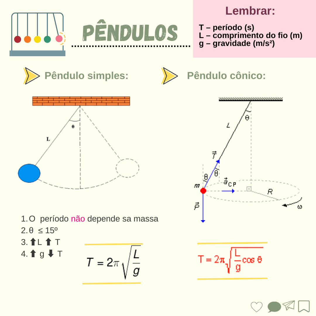 Lembrar: PENDULOS T - período (s) L - comprimento do fio (m) g - gravidade Pêndulo simples: Pêndulo cônico: L L 8 8 m R 1.0 período não depende sa massa 2.0 15° 3. L T 4. g T L L T = T = - COS g g