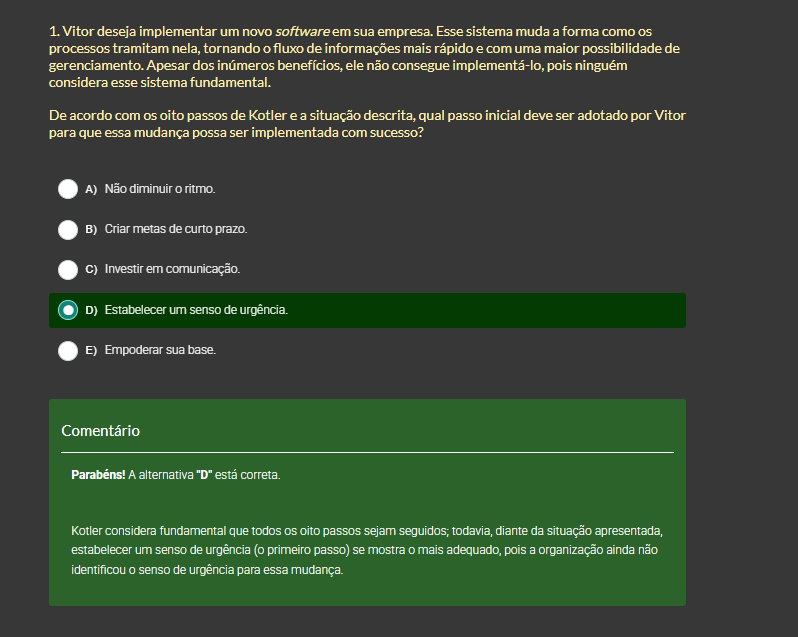 1. Vitor deseja implementar um novo software em sua empresa. Esse sistema muda a forma como os processos tramitam nela, tornando O fluxo de informações mais rápido e com uma maior possibilidade de gerenciamento. Apesar dos inúmeros benefícios, ele não consegue implementá-lo, pois ninguém considera esse sistema fundamental. De acordo com oito passos de Kotler e a situação descrita, qual passo inicial deve ser adotado por Vitor para que essa mudança possa ser implementada com sucesso? A) Não diminuir ritmo. B) Criar metas de curto prazo. C) Investir em comunicação. D) Estabelecer um senso de urgência. E) Empoderar sua base. Comentário Parabéns! A alternativa "D" está correta. Kotler considera fundamental que todos os oito passos sejam seguidos; todavia, diante da situação apresentada, estabelecer um senso de urgência (o primeiro passo) se mostra mais pois a organização ainda não identificou senso de urgência para essa mudança.