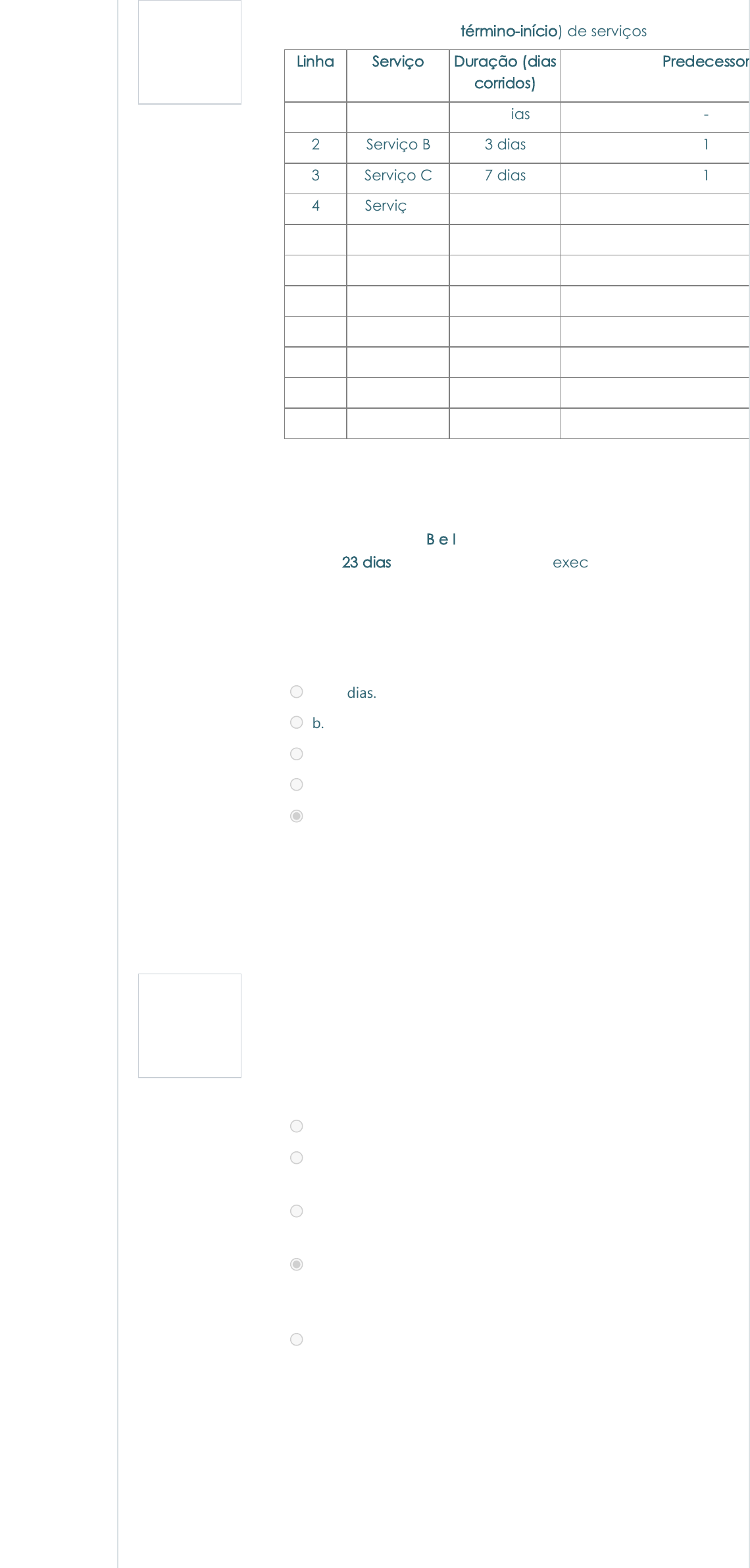 Questão 5 Incorreto Atingiu 0,00 de 1,00 Questão 6 Correto Atingiu 1,00 de 1,00 Considere a sequência (término-início) de serviços abaixo: Linha Serviço Duração (dias corridos) Predecessor 1 Serviço A 15 dias - 2 Serviço B 3 dias 1 3 Serviço C 7 dias 1 4 Serviço D 10 dias 3 5 Serviço E 9 dias 4 6 Serviço F 4 dias 4 7 Serviço G 7 dias 5;6 8 Serviço H 6 dias 7;9 9 Serviço I 5 dias 7 10 Serviço J 4 dias 9 11 Serviço L 4 dias 9TI+10dias Responda à seguinte pergunta: · Se os serviços B e I atrasarem seus términos, cada um, em 23 dias, qual será o prazo de execução da obra? Escolha uma opção: a. 88 dias. b. 90 dias. c. 96 dias. d. 77 dias. e. Nenhuma das respostas acima. Sua resposta está incorreta. A resposta correta é: 90 dias. O que é Planejamento de CURTO PRAZO? Escolha a resposta correta abaixo. Escolha uma opção: a. É a sequência das tarefas críticas de uma obra. b. É a relação das tarefas, de uma obra, que deverão ser executadas nos próximos 6 meses. c. É a relação de todas as tarefas, de uma obra, que deverão ser executadas do início ao final. d. É a relação das tarefas, de uma obra, que deverão ser executadas em cada dia e de forma a cumprirem o estabelecido no planejamento de longo prazo. e. Nenhuma das respostas anteriores. Sua resposta está correta. A resposta correta é: É a relação das tarefas, de uma obra, que deverão ser executadas em cada dia e de forma a cumprirem o estabelecido no planejamento de longo prazo. PORTAL DO ALUNO PÁGINA INICIAL CALENDÁRIO https://portaldoaluno.ipog.edu.br/ https://ead.ipog.edu.br/moodle https://ead.ipog.edu.br/moodle/calendar/view.php?view=month