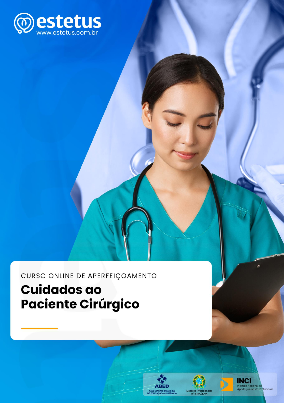 Cuidados ao paciente cirúrgico 1 www.estetus.com.br CUIDADOS AO PACIENTE CIRÚRGICO Cuidados ao paciente cirúrgico 2 www.estetus.com.br SUMÁRIO CUIDADOS NO PÓS-CIRÚRGICO E COMPLICAÇÕES ................................................................. 3 PERCEPÇÃO DO PACIENTE E O CUIDADO NA ENFERMARIA DE CLÍNICA CIRÚRGICA ................ 5 CUIDADOS DE ENFERMAGEM AO PACIENTE NO PÓS-OPERATÓRIO ........................................ 7 ASPECTOS SOCIAIS E AMBIENTAIS ........................................................................................ 16 ASPECTOS BIOLÓGICOS ........................................................................................................ 16 ASPECTOS PSICOLÓGICOS .................................................................................................... 16 COMPLICAÇÕES PÓS–OPERATÓRIAS .................................................................................... 16 CHOQUE CARDIOGÊNICO ..................................................................................................... 21 CHOQUE VASCULOGÊNICO .................................................................................................. 21 CHOQUE HIPOVOLÊMICO ..................................................................................................... 21 CLASSIFICAÇÃO DAS FERIDAS ............................................................................................... 25 COMPLICAÇÕES DA FERIDA CIRÚRGICA ................................................................................ 31 REFERÊNCIA ......................................................................................................................... 37 Cuidados ao paciente cirúrgico 3 www.estetus.com.br CUIDADOS NO PÓS-CIRÚRGICO E COMPLICAÇÕES Segundo GAMBOA (1997), cuidar não é um ato único ou a soma de procedimentos técnicos, é o resultado de um processo no qual delicada e estreitamente se conjugam sentimentos, valores, atitudes e princípios científicos que perpassam pela cultura, estética e arte. Conforme (MENDELSSONH; BARBOSA, 1992), a realização de uma cirurgia envolve uma série de distúrbios fisiopatológicos que implicam em prejuízos reais e perigos como: risco de vida, perda de órgãos e de partes ou funções do corpo, ameaça de invalidez, despesas médico-hospitalares, prejuízos econômicos pela inatividade e decisões importantes, além de conviver com sofrimento, dor e medo da morte. Somam-se a esses fatos o trauma cirúrgico e a insegurança ou ansiedade em face da expectativa quanto à capacidade técnica da equipe cirúrgica e a qualidade da assistência hospitalar. Portanto, a enfermagem tem a função de contribuir para o conforto e segurança do paciente cirúrgico, preparando-o psicologicamente e fisicamente para as fases do trans e pós- operatório. O cuidar do paciente no pós-operatório envolve um arcabouço técnico e científico para o devido atendimento das necessidades do indivíduo e reconhecimento das possíveis complicações. A enfermagem atua no pós-operatório imediato e mediato/tardio como grande interlocutor do cuidado humano, procurando garantir a autonomia e independência aos seus clientes. Define-se como: Pós-operatório • depois de cirurgia Pós-operatório imediato • Período de recobro e primeiras 24h ( dependendo do tamanho da cirurgia) . Cuidados ao paciente cirúrgico 4 www.estetus.com.br Pós-operatório tardio • A partir do momento em que o doente faz as 24h (mais ou menos, depende da cirurgia) de cirurgia. Após o processo cirúrgico o paciente é encaminhado à SRPA (SALA DE RECUPERAÇÃO PÓS-ANESTÉSICA), onde permanece monitorado por um período de 6 (seis) horas para que possa ser liberado para a Unidade de Internamento ou Unidade de Terapia Intensiva. Nesta perspectiva, o período pós-operatório tem início logo após o término da cirurgia e vai até a alta do paciente podendo se estender até a fase de atendimento ambulatorial. Alguns autores dividem este período em três fases: imediato (primeiras 24h da cirurgia), mediato (após as 24horas até a alta hospitalar) e tardio (inicia-se após a alta e dura enquanto o paciente necessitar de atenção especial. Como foi colocado anteriormente, a assistência de enfermagem deve atuar de forma sistematizada, sendo um processo interativo que promove e/ou recupera a integridade e a plenitude bio-psico-sócio-espiritual do paciente. Esta envolve sentimentos, emoções, comprometimento, ética e comunicação efetiva que promova a troca de experiências entre o enfermeiro e o cliente. Para GRITTEM (2006), a assistência de enfermagem deve ser integral e individualizada, estando aliada a um marco conceitual em todas as fases, com envolvimento dos familiares, possibilitando ainda, a identificação dos diagnósticos e a implementação de um plano de cuidados durante o procedimento cirúrgico em continuidade à assistência iniciada no pré- operatório. É de fundamental importância a sistematização como forma de integração da equipe multidisciplinar com o paciente e a família, com diminuição de suas ansiedades; assim, este passará a se integrar de forma participativa em todo processo. Neste sentido, o enfermeiro faz o diagnóstico de enfermagem para posteriormente, traçar um plano assistencial. Podemos citar como exemplos de diagnósticos reais ou potenciais: - Integridade tissular prejudicada; - Risco para infecção; - Percepção sensorial perturbada; - Risco para aspiração; - Risco para função respiratória alterada; Mobile User Cuidados ao paciente cirúrgico 5 www.estetus.com.br - Hipotermia; - Risco para temperatura corporal desequilibrada; - Nutrição desequilibrada: mais do que as necessidades corporais; - Dor aguda. A partir do momento em que se sutura a incisão cirúrgica e se realiza o curativo, já é a fase do pós-operatório. É comum o paciente apresentar hipotermia no centro cirúrgico e nas prime