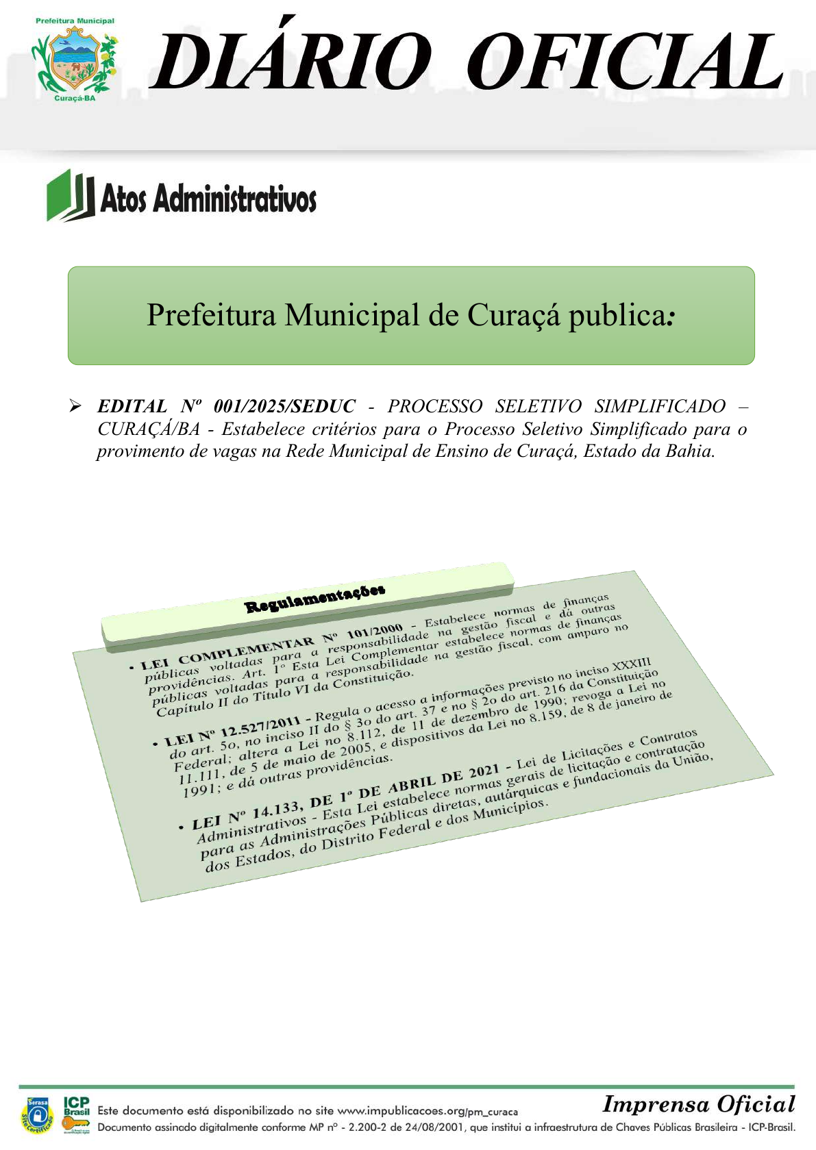 EDITAL Nº 001/2025/SEDUC - PROCESSO SELETIVO SIMPLIFICADO – CURAÇÁ/BA - Estabelece critérios para o Processo Seletivo Simplificado para o provimento de vagas na Rede Municipal de Ensino de Curaçá, Estado da Bahia. Prefeitura Municipal de Curaçá publica: Prefeitura Municipal de Curaça - Bahia ANO XIII - Edição Nº 2394 BAHIA - 14 de Janeiro de 2025 - Terça-feira Página 1 P ág in a1 SECRETARIA MUNICIPAL DE EDUCAÇÃO - SEDUC EDITAL Nº 001/2025/SEDUC PROCESSO SELETIVO SIMPLIFICADO – CURAÇÁ/BA Estabelece critérios para o Processo Seletivo Simplificado para o provimento de vagas na Rede Municipal de Ensino de Curaçá, Estado da Bahia. O MUNICÍPIO DE CURAÇÁ/BA, Estado da Bahia, pessoa jurídica de direito público interno, com sede na Praça Bom Jesus da Boa Morte, nº 311, Centro, Curaçá, Estado da Bahia, inscrito no CNPJ/MF sob o nº 13.915.640/0001-73, neste ato representado pelo Prefeito, Sr. Robson Murilo Bomfim da Silva, torna pública a ABERTURA DE INSCRIÇÕES para preenchimento das vagas existentes no quadro de servidores da Rede Pública Municipal de Ensino de Curaçá, Estado da Bahia, para atender necessidade temporária de excepcional interesse público, observadas as disposições constitucionais, e, em particular às normas contidas neste Edital, para contratação dos cargos de referidos no Anexo I deste Edital, atendendo uma demanda emergencial da Secretaria Municipal de Educação do Município de Curaçá, Estado da Bahia, observadas as disposições constitucionais, bem como as normas contidas neste Edital. 1. DAS DISPOSIÇÕES PRELIMINARES 1.1. A presente contratação, por prazo determinado, possui amparo na Lei Municipal nº 546/2010, que dispõem sobre a contratação por tempo determinado para atender à necessidade temporária de excepcional interesse público, em conformidade com a resolução TCM n°1420, de 17 de dezembro de 2020. 1.2. A seleção de que trata o presente Edital tem por objetivo o provimento, por prazo determinado, das funções públicas indicadas para Professor, profissional de nível superior; Auxiliar de Ensino, profissional de nível médio com habilitação em magistério; e Auxiliar de Creche, com requisitos, número de vagas, carga horária, atribuições e remuneração descritas nos ANEXOS I e II deste Edital. 1.3. O presente Processo Seletivo Simplificado será executado pela Comissão de Avaliação do Processo Seletivo, instituída e designada pelo titular da Secretaria Municipal de Educação, sendo responsável pela elaboração dos instrumentos necessários para inscrição, aplicação de provas, avaliação de títulos e experiência profissional, recebimento dos recursos, análise e divulgação dos resultados, além de todos os comunicados que se fizerem necessários. 1.4. A remuneração e carga horária das funções estão descritas no ANEXO I. 1.5. Os contratados não serão abrangidos pelos critérios de progressão e promoção estabelecidos no Plano de Cargos, Carreiras e Remuneração. 1.6. Trata-se de contratação temporária, com duração de até 12 (doze) meses, podendo ser prorrogada por um tempo total de até 24 (vinte e quatro) meses, para atender à necessidade excepcional de manutenção dos serviços essenciais da Secretaria Municipal de Educação, nos Prefeitura Municipal de Curaça - Bahia Terça-feira, 14 de Janeiro de 2025 - Pag.2 - Ano XIII - Nº 2394 Página 2 termos do presente Edital. A seleção dos candidatos será feita mediante prova objetiva e avaliação de títulos. 1.7. Cumpre salientar que a leitura integral e acurada deste edital, antes da realização da inscrição, é de responsabilidade do interessado em participar do certame, descabendo, posteriormente, alegações de desconhecimento. 1.8. Os anexos deste edital fazem parte do respectivo regramento, devendo ser analisados conjuntamente ao respectivo termo editalício. 1.9. As datas previstas para a execução do certame constam no Cronograma de Execução (Anexo VII). Quaisquer disposições deste edital poderão sofrer alterações, inclusive no que diz respeito às datas previstas no referido anexo, de forma que é de responsabilidade do candidato acompanhar a publicidade oficial do certame durante toda a sua execução, sob a pena de ser eliminado por descumprimento das disposições editalícias referentes ao prosseguimento. 1.10. O desconhecimento do conteúdo deste edital e das demais publicações oficiais, não poderá ser utilizado para justificar eventuais prejuízos por parte do candidato. 1.11. Ao se inscrever, o candidato manifesta concordância com a coleta dos dados necessários para a sua correta identificação e com a divulgação de informações, tais como nome, pontuação, dentre outras, as quais são essenciais para a publicidade do certame em tela. Essas informações poderão, eventualmente, ser encontradas na internet, por meio de mecanismos de busca, descabendo solicitações de exclusão, em face ao princípio da publicidade que rege os atos do respectivo certame. 1.12. As declarações e informações prestadas no processo de inscrição e/ou etapas posteriores, bem como os documentos apresentados são de responsabilidade do candidato e/ou de seu procurador legalmente constituído, e só terão validade para este certame, sendo utilizados pela Comissão de Organização e pelo ente signatário deste edital apenas para tal finalidade. 1.13. A constatação, pela autoridade competente, de irregularidade ou falsidade praticada pelo candidato, poderá ensejar sua eliminação do certame e, se já houver ingressado, sua demissão, podendo este, ainda, vir a responder por crime contra a fé pública nos termos da lei vigente, asseguradas sempre as garantias estabelecidas pelo Art. 5º, LV, da Constituição Federal de 1988. 1.14. Todos os horários definidos neste edital e demais publicações oficiais referentes ao andamento deste certame têm como referência o horário de Brasília (D
