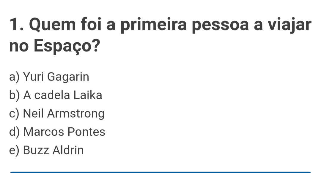 1. Quem foi a primeira pessoa a viajar no Espaço? a) Yuri Gagarin b) A cadela Laika c) Neil Armstrong d) Marcos Pontes e) Buzz Aldrin