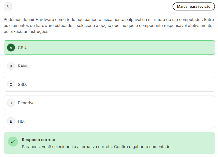 5 Marcar para revisão Podemos definir Hardware como todo equipamento fisicamente palpável da estrutura de um computador. Entre os elementos de hardware estudados, selecione a opção que indique componente responsável efetivamente por executar instruções. A CPU. B RAM. C SSD. D Pendrive. E HD. Resposta correta você selecionou a alternativa correta. Confira o gabarito comentado!