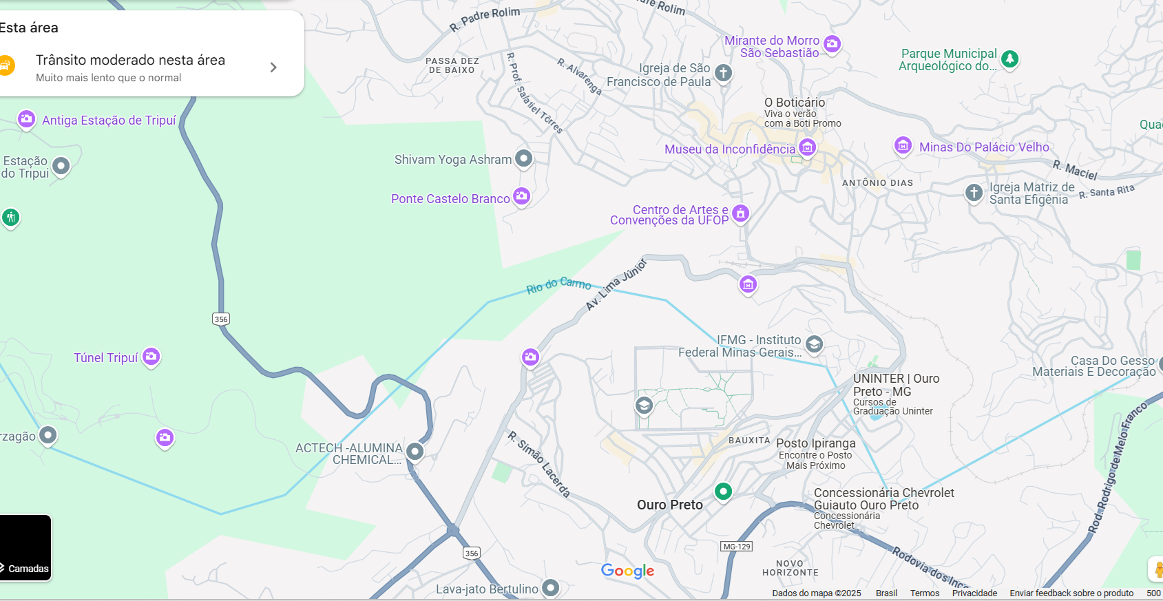 Padre Rolim Rolim Esta área Mirante do Morro R São Sebastião Trânsito moderado nesta área Parque Municipal PASSA DEZ DE BAIXO Muito mais lento que normal R Igreja de São Arqueológico do Francisco de Paula o Boticário Viva verão Antiga Estação de Tripuí com a Boti Promo Qua Museu da Inconfidência M Minas Do Palácio Velho Estação Shivam Yoga Ashram do Tripui R Maciel DIAS Igreja Matriz de Santa Rita Ponte Castelo Branco Santa Efigênia Centro de Artes e Convenções da UEOP Rio do M 356 Instituto Federal Minas Gerais. Túnel Casa Do Gesso Materiais E Decoração UNINTER Preto MG de Uninter zagão R BAUXITA ACTECH-ALUMINA Posto Ipiranga Encontre o Posto Mais Próximo Concessionária Chevrolet Ouro Preto Guiauto Preto Concessionária Chevrolet MG-129 356 NOVO Camadas Google HORIZONTE Lava-jato Dados do mapa @2025 Brasil Termos Privacidade Enviar feedback sobre produto 500
