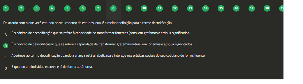 1 2 3 4 5 6 7 8 9 10 11 12 13 14 15 16 17 18 19 De acordo com que você estudou no seu caderno de estudos, qual é a melhor definição para termo decodificação A É sinônimo de decodificação que se refere à capacidade de transformar fonemas (sons) em grafemas e atribuir significados É sinônimo de descodificação que se refere à capacidade de transformar grafemas (letras) em fonemas e atribuir significados. C Aderimos ao termo decodificação quando a criança está alfabetizada e interage nas práticas sociais do seu cotidiano de forma fluente. D É quando um indivíduo escreve e lê de forma