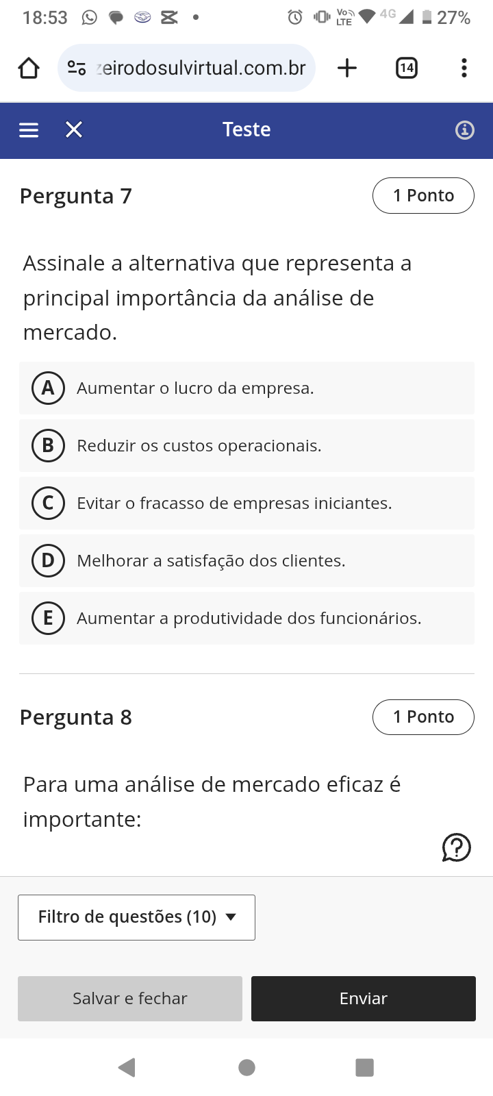 18:53 Vo 4G LTE 27% zeirodosulvirtual.com.br + 14 : X Teste i Pergunta 7 1 Ponto Assinale a alternativa que representa a principal importância da análise de mercado. A Aumentar o lucro da empresa. B Reduzir os custos operacionais. C Evitar o fracasso de empresas iniciantes. D Melhorar a satisfação dos clientes. E Aumentar a produtividade dos funcionários. Pergunta 8 1 Ponto Para uma análise de mercado eficaz é importante: ? Filtro de questões (10) Salvar e fechar Enviar