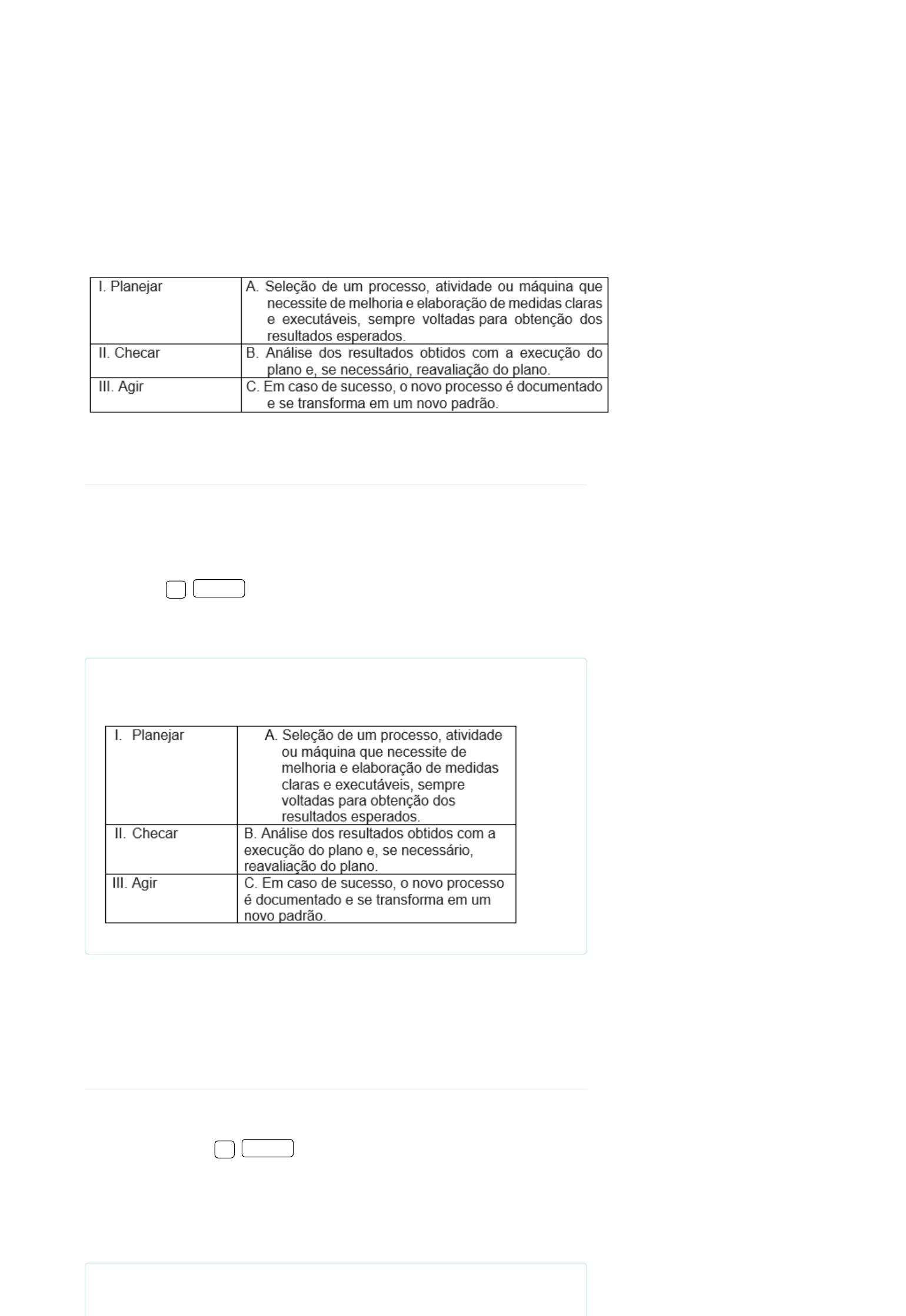 Gestão da qualidade total Professor(a): Talita Helena Landiva (Especialização) 1) 2) Prepare-se! Chegou a hora de você testar o conhecimento adquirido nesta disciplina. A Avaliação Virtual (AV) é composta por questões objetivas e corresponde a 100% da média final. Você tem até cinco tentativas para “Enviar” as questões, que são automaticamente corrigidas. Você pode responder as questões consultando o material de estudos, mas lembre- se de cumprir o prazo estabelecido. Boa prova! O ciclo PDCA auxilia as organizações na resolução dos problemas e implementar soluções de maneira rigorosa e metódica. Contudo é preciso seguir esses alguns passos para garantir os resultados. Assinale a alternativa que traz a associação correta entre as duas colunas contendo os passos do ciclo PDCA: Alternativas: II-A; I-B; III-C. I-A ; III-B; II-C. I-A; II-B; III-C. CORRETO II-A; III-B; I-C. III-A; II-B; I-C. Código da questão: 68390 A definição “produtos que não atendem aos padrões de qualidade e são passíveis de retrabalho” se refere a qual das perdas de processo? Alternativas: Unidades defeituosas. CORRETO Reclamações. Desperdício. Sobras. Refugo. Resolução comentada: São etapas do Ciclo PDCA. Resolução comentada: Unidades defeituosas são produtos que não atendem aos padrões de qualidade e Cosmos · Cosmos https://kroton.platosedu.io/lms/m/aluno/disciplina/index/3505937/12545737 1 of 6 10/02/2025, 16:20 3) Código da questão: 68400 Shigeo Shingo, devido a suas contribuições na melhoria da qualidade e dos processos por meio de procedimentos vindos da engenharia, ficou conhecido como: Alternativas: Gênio da engenharia. CORRETO Gênio da qualidade. Gênio da produção. Pai da engenharia. Pai da produção. Código da questão: 68386 são passíveis de retrabalho. Resolução comentada: Shigeo Shingo ficou conhecido como Gênio da engenharia, por utilizar processos de engenharia em sinergia com os processos de qualidade. Cosmos · Cosmos https://kroton.platosedu.io/lms/m/aluno/disciplina/index/3505937/12545737 2 of 6 10/02/2025, 16:20 4) 5) Para o consumidor, quando em um produto ou serviço não são encontrados defeitos e existe a presença de atributos que sejam agregadores de valor, este produto passa a ter a condição de produto com qualidade, o que causa a satisfação do cliente final. Analise as afirmativas a seguir e assinale-as com V (verdadeiro) ou F (falso): ( ) O atributo instalação tem como característica principal o grau de facilidade disponível para conduzir as instalações disponíveis e necessárias no produto ou serviço. ( ) O atributo instalação tem como característica principal os fatores associados aos serviços de atendimento ao cliente. ( ) O atributo de confiabilidade tem como característica principal a probabilidade de que o produto consiga realizar suas funções sem apresentar falhas durante o tempo de uso. ( ) O atributo de durabilidade tem como característica principal a probabilidade de que o produto consiga realizar suas funções sem apresentar falhas durante o tempo de uso. ( ) O atributo de durabilidade tem como característica principal a vida útil do produto em relação aos aspectos de especificações e econômico. Assinale a alternativa que contenha a sequência correta de V e F: Alternativas: V – F – V – F – V. CORRETO V – F – V – V – V. F – F – F – V – F. V – V – F – V – F. F – V – F – V – F. Código da questão: 68375 Para alguns estudiosos como Crosby, Juran, Deming e Feigenbaum, o termo _________ vem sendo _________ a/para _________ os clientes de diversas maneiras, sempre _________ a relação das _________ do _________ com o _________ e agregação de valor que ele traz ao _________ final. A qualidade é o grau ou maneira com que o produto atende a satisfação e necessidades do usuário. Assinale a alternativa que completa adequadamente as lacunas: Alternativas: Qualidade; apropriado; satisfazer; visando; novidades; produto; ajuste; produtor. Qualidade; associado; satisfazer; ignorando; novidades; produto; ajuste; produtor. Qualidade; associado; satisfazer; visando; características; produto; benefício; consumidor. CORRETO Qualidade; associado; ignorar; visando; características; custo; benefício; consumidor. Qualidade; apropriado; satisfazer; visando; características; produto; benefício; produtor. Resolução comentada: A primeira, a terceira e a última afirmativas são verdadeiras. Veja a forma correta das afirmativas falsas: Segunda – O atributo Assistência técnica tem como característica principal os fatores associados aos serviços de atendimento ao cliente. Quarta – O atributo de Confiabilidade tem como característica principal a probabilidade de que o produto consiga realizar suas funções sem apresentar falhas durante o tempo de uso. Cosmos · Cosmos https://kroton.platosedu.io/lms/m/aluno/disciplina/index/3505937/12545737 3 of 6 10/02/2025, 16:20 6) 7) Código da questão: 68374 O custo da qualidade tem diversas definições e pode ser descrito de diversas forma. Analise as afirmativas a seguir e assinale-as com V (verdadeiro) ou F (falso): ( ) Os custos gerados pela não qualidade são aqueles que não deveriam existir se o produto fosse feito sem falhas da primeira vez. ( ) O custo da qualidade influencia as equipes na busca da melhoria da qualidade, enquanto os demais níveis podem utilizar a participação ou conhecimento destes programas somente com o intuito de causar boa impressão. ( ) Existem duas classificações para o custo da qualidade. Os custos da qualidade aceitáveis, aqueles que são planejados pela empresa para serem gastos, e os custos da qualidade não aceitáveis, aqueles que a empresa deseja eliminar ou evitar a ocorrência. ( ) Existem duas classificações para o custo da qualidade. Os custos da qualidade aceitáveis, aqueles que não são planejados pela empresa para serem gastos, e os custos da qualidade nã