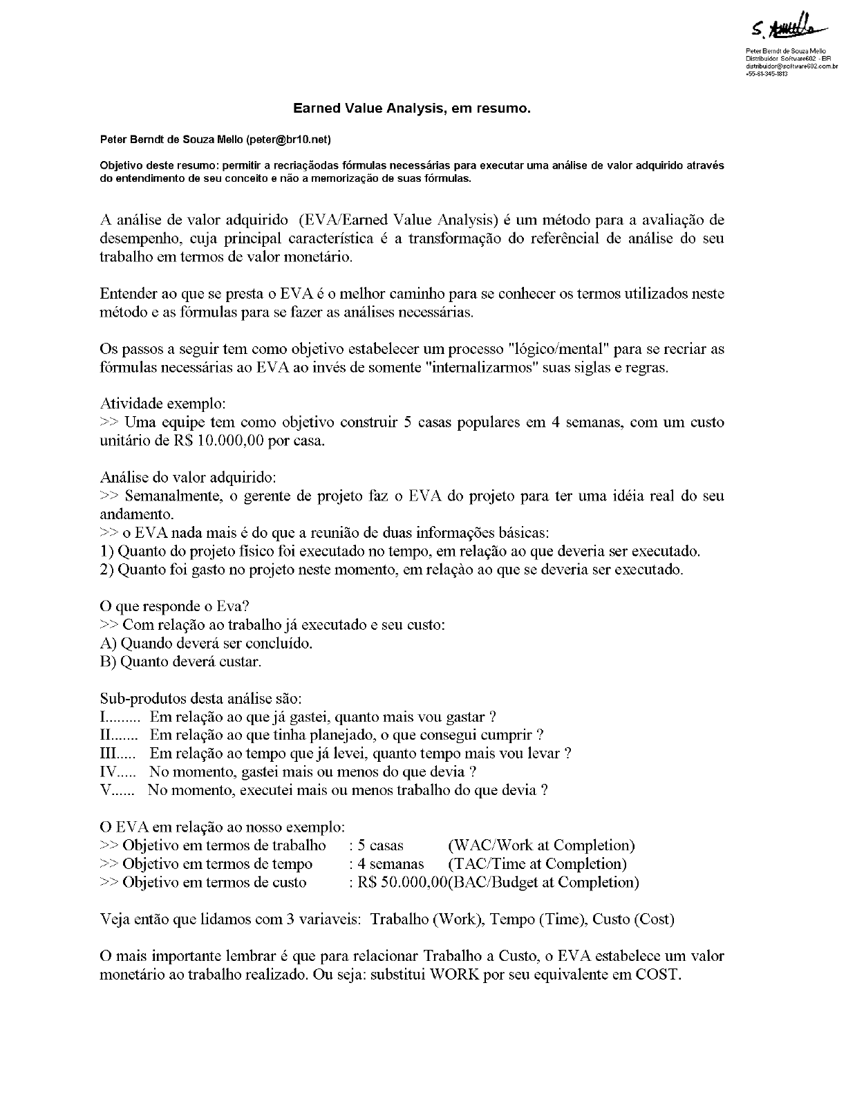 Peter Berndt de Souza Mello Distribuidor Software602 BR distribuidor@software602.com.br +55-61-345-1813 Earned Value Analysis, em resumo. Peter Berndt de Souza Mello (peter@br10.net) Objetivo deste resumo: permitir a recriaçãodas fórmulas necessárias para executar uma análise de valor adquirido através do entendimento de seu conceito e não a memorização de suas fórmulas. A análise de valor adquirido (EVA/Earned Value Analysis) é um método para a avaliação de desempenho, cuja principal característica é a transformação do referêncial de análise do seu trabalho em termos de valor monetário. Entender ao que se presta o EVA é o melhor caminho para se conhecer os termos utilizados neste método e as fórmulas para se fazer as análises necessárias. Os passos a seguir tem como objetivo estabelecer um processo "lógico/mental" para se recriar as fórmulas necessárias ao EVA ao invés de somente "internalizarmos" suas siglas e regras. Atividade exemplo: >> Uma equipe tem como objetivo construir 5 casas populares em 4 semanas, com um custo unitário de R$ 10.000,00 por casa. Análise do valor adquirido: >> Semanalmente, o gerente de projeto faz o EVA do projeto para ter uma idéia real do seu andamento. >> o EVA nada mais é do que a reunião de duas informações básicas: 1) Quanto do projeto físico foi executado no tempo, em relação ao que deveria ser executado. 2) Quanto foi gasto no projeto neste momento, em relação ao que se deveria ser executado. O que responde o Eva? >> Com relação ao trabalho já executado e seu custo: A) Quando deverá ser concluído. B) Quanto deverá custar. Sub-produtos desta análise são: I Em relação ao que já gastei, quanto mais gastar ? II Em relação ao que tinha planejado, o que consegui cumprir ? III Em relação ao tempo que já levei, quanto tempo mais levar ? IV. No momento, gastei mais ou menos do que devia ? V No momento, executei mais ou menos trabalho do que devia ? O EVA em relação ao nosso exemplo: >> Objetivo em termos de trabalho : 5 casas (WAC/Work at Completion) >> Objetivo em termos de tempo : 4 semanas (TAC/Time at Completion) >> Objetivo em termos de custo : 50.000,00(BAC/Budget at Completion) Veja então que lidamos com 3 variaveis: Trabalho (Work), Tempo (Time), Custo (Cost) O mais importante lembrar é que para relacionar Trabalho a Custo, o EVA estabelece um valor monetário ao trabalho realizado. Ou seja: substitui WORK por seu equivalente em COST.Como fazemos isso? Se criamos uma linha de trabalho em relação ao tempo e colocamos seu equivalente em custo para o mesmo período, temos o valor do trabalho. 5 casas = R$ 50.000 = 4 semanas. Nivelamento Ideal (planejado) BUDGET AT COMPLETION Para o planejado, o valor é de R$ 50.000,00 para 5 casas em 4 semanas. Se: Tempo maior ou menor; Custo maior ou menor; Trabalho maior ou menor; WORK COST TIME necessitamos descobrir a relação destas 3 variáveis de ordem de grandeza diferentes, através de uma visão em termos de Em nosso exemplo, digamos que na segunda semana o Gerente de Projeto verifique que: Casa 1: 100% concluída. Casa 2: 75% concluída >> Falta acabamento. Casa 3: 50% concluída >> Falta telhado, janelas e acabamento. Casa 4: 15% concluída >> Feito apenas a fundação. Casa 5: 0% concluída. A primeira tarefa é transformar este trabalho em seu valor monetário proporcional. Na segunda semana (50% do tempo), deveríamos estar com um valor adquirido para o trabalho executado (EV/Earned Value) de 50% do custo, ou seja: R$ 25.000,00 >> Soma dos trabalhos realizados das casas: 100+75+50+15+0 em um total de 500 : 48% >> Seu proporcional nivelado em custo seria 48% de = R$ 24.000,00 = R$ 24.000 WORK COST WORK COST 48% do trabalho total em relação ao custo total representa 48% do custo como valor adquirido (Earned Olhando a planilha de gastos e com a conversão do trabalho realizado em valor adquirido, o gerente agora tem DOIS referenciais econômicos: A) Custo Atual (AC/Actual Cost) = Total de gastos até o momento. B) Valor Adquirido (Earned Value) Valor monetário encontrado para o trabalho. Em nosso exemplo, digamos que o custo atual entre salários, equipamentos, etc. até a segunda semana foi de R$ 26.000,00Análisando os números que já temos, vamos ver como podemos relacioná-los entre si: A) O custo total da minha obra previsto é de R$ 50.000,00 B) O custo total da minha obra no momento é de R$ 26.000,00 C) O valor adquirido da minha obra até o momento é de R$ 24.000,00. Sabemos que há uma diferença entre o custo e o valor adquirido, mas ainda não podemos responder se estamos bem ou mal em relação ao tempo, pois assim como fizemos uma relação entre CUSTO e TRABALHO, temos que fazer uma relação entre CUSTO e TEMPO. Conceito-Chave: TUDO em EVA é referenciado em VALOR Conversão equivalente ao trabalho/custo então precisa ser feita em relação a tempo/custo: = R$ 25.000 TIME COST TIME COST 50% do tempo total em relação ao custo total representa 50% do custo como valor planejado (Planed Value) Só agora podemos realmente fazer uma análise dos valores obtidos, pois estão todos com base ao mesmo referencial ($$). EARNED VALUE : R$ 24.000 PLANED VALUE R$ 25.000 ACTUAL COST Examinando todos sob a mesma ótica, podemos então estabelecer as regras necessárias para respondermos as perguntas desejadas. 10.000 20.000 30.000 40.000 50.000 Actual Cost (AC) Planned Value (PV) Earned Value (PV) Com esta representação, creio que fica fácil visualizar que: 1) Minha variação no calendário (Schedule Variance) é o Earned Value - Planned Value SV=EV PV Negativo = Atraso. 2) Minha variação no custo (Cost Variance) é o Earned Value - Actual Cost CV=EV AC ==> Negativo = Custo maior.A partir daí, precisamos calcular os índices de desvio para podermos projetar a proporção destas informações "niveladas em $$" para o futuro. "Se para dois passos que preciso dar eu só consigo dar um passo, o meu índice de successo é o que eu c
