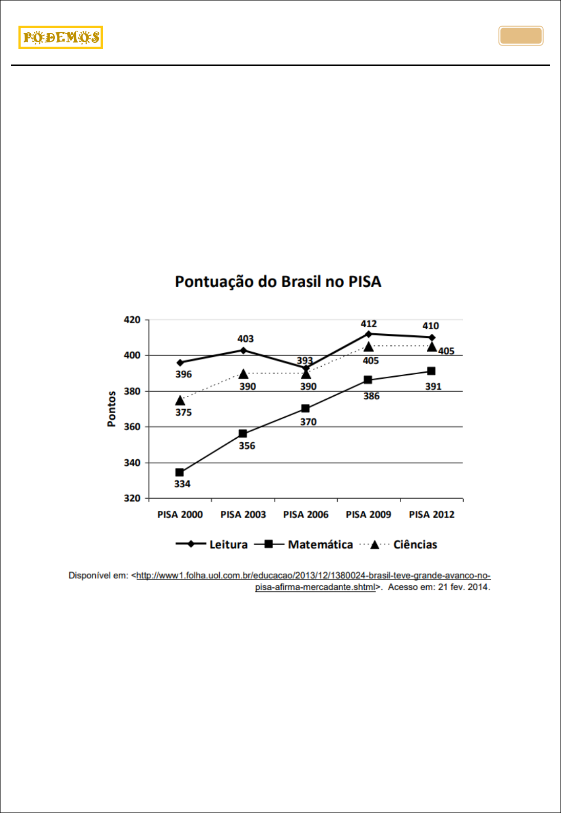 UFJF: PISM, Vestibulares e Concursos Prof. Otávio Luciano Camargo Sales de Magalhães . 478 CONCURSO TAE – 2014 – ENSINO SUPERIOR GV – Edital 12 As questões abaixo são relacionadas à prova de Raciocínio Lógico Quantitativo 1)(Concurso Público da UFJF - MG - Técnico-Administrativo em Educação TAE Governador Valadares – Edital 12 / Ensino Superior – 2014 - Banca COPESE/FGV) O Programme for International Student Assessment (PISA) – Programa Internacional de Avaliação de Estudantes – é uma iniciativa internacional de avaliação comparada, aplicada a estudantes na faixa dos 15 anos, idade em que se pressupõe o término da escolaridade básica obrigatória na maioria dos países. O programa é desenvolvido, coordenado e realizado pela Organização para Cooperação e Desenvolvimento Econômico (OCDE) a cada três anos, com a participação de vários países. A primeira edição dessa avaliação ocorreu no ano 2000, e a nota média de cada país, em uma dada edição do exame, é calculada fazendo-se a média aritmética entre as notas que o país alcançou nas provas de Leitura, Matemática e Ciências. No gráfico abaixo, estão representadas as notas obtidas pelo Brasil nas cinco edições já realizadas, nas três áreas avaliadas. Considerando as três áreas avaliadas e as cinco edições do exame, o maior crescimento percentual observado na pontuação do Brasil, em uma edição do PISA, em relação à edição anterior, foi, aproximadamente, igual a: a) 4,8% e ocorreu na prova de Leitura, na edição de 2009. b) 6,6% e ocorreu na prova de Matemática, na edição de 2003. c) 8,0% e ocorreu na prova de Ciências, na edição de 2012. d) 17,0% e ocorreu na prova de Matemática, na edição de 2012. e) 22,0% e ocorreu na prova de Matemática, na edição de 2003.
