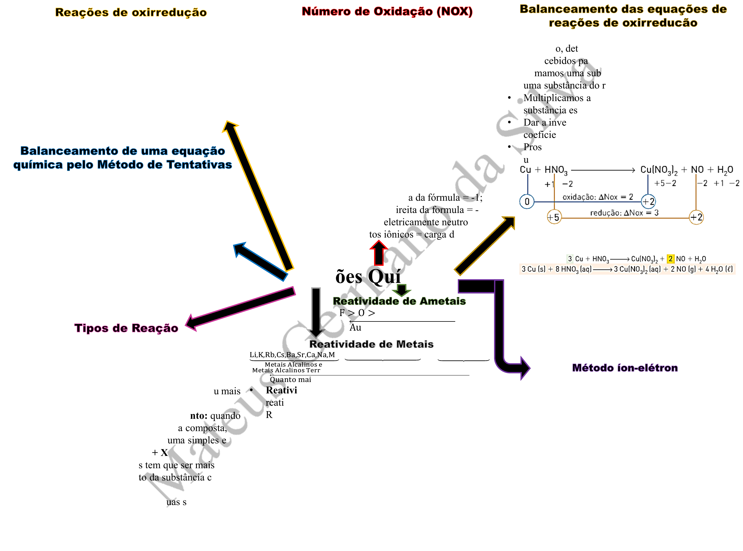 Reações Químicas • Reações de síntese ou adição: quando dois ou mais reagentes se combinam para originar um único produto: A + B → C • Reações de análise ou decomposição: quando um único reagente se decompõe, originando dois ou mais produtos: A → B + C • Reações de simples troca ou deslocamento: quando uma substância simples reage com uma composta, originando duas novas substâncias, uma simples e outra composta: A + XY → AY + X ➢ Obs: a substância simples tem que ser mais reativas do que o elemento da substância composta que será deslocado • Reações de dupla-troca: quando duas substâncias compostas reagem entre si, trocando seus componentes e dando origem a duas novas substâncias compostas. AB + XY → AY + XB F > O > Cl > Br > I > S > C Aumento da reatividade Li,K,Rb,Cs,Ba,Sr,Ca,Na,Mg Metais Alcalinos e Metais Alcalinos Terrosos >Al,Mn,Zn,Fe,Co,Ni,Pb, Outros Metais >H>Cu,Ag,Pd,Pt,Au Metais nobres Quanto maior a reatividade,menor é a nobreza dometal • Reatividade do ouro → é um dos metais menos reativos que existe e não reage com ácidos isolados. Reage somente com uma mistura formada por três partes (volumes) de HCl e uma parte de HNO3, conhecida como água – régia. • Reatividade dos metais com a água → metais alcalinos ou alguns alcalino terrosos (Ca, Sr e Ba) + H2O → H2 + hidróxido correspondente • Reatividade dos metais com bases → A maioria dos metais reage com ácidos, mas alguns têm a capacidade de reagir tanto com ácidos quanto com bases: Al, Zn, Pb e Sn. Ao reagirem com bases fortes, eles produzem sais não muito comuns e liberam gás hidrogênio. • Atribui-se o coeficiente 1 à substância com maior número de átomos. • A partir dessa substância, determina-se os coeficientes das outras substâncias. • Como os coeficientes devem ser números inteiros, se algum coeficiente obtido for fracionário, devemos multiplicar todos os coeficientes por um número apropriado para eliminar as frações • Nº de mols de um elemento dos reagentes tem que ser igual desse mesmo elemento no produto • A ordem de balanceamento é: Metal, Ametal, Carbono, Hidrogênio e Oxigênio • Reações químicas que ocorrem com transferência de elétrons são denominadas reações de oxirredução, ou somente redox (ou oxired). • Oxidação → processo de perda de elétrons • Redução → processo de ganho de elétrons • Agente redutor → substância que sofre oxidação e provoca redução. • Agente oxidante → substância que sofre redução e provoca oxidação. • O Nox deve ser determinado para cada espécie, isoladamente. Regras para a determinação do Nox • Substância simples → Nox = 0 • Íon monoatômico → Nox = sua própria carga. • Nox fixo • Nox do hidrogênio (H) = +1 • Nox do O, na maioria dos seus compostos = -2 ➢ Nos peróxidos = - 1. • Nox de metais alcalinos = + 1 • Nox de metais alcalino terrosos = + 2 • Nox da Prata (Ag) = +1 • Nox do Zinco (Zn) = +2 • Nox do Alumínio = +3 • Nox de Halogênios à direita da fórmula = -1; • Nox de Calcogênios à direita da formula = - 2 • Σnox em compostos eletricamente neutros = 0 • Σnox em compostos iônicos = carga do íon. • Nº de elétrons perdidos = Nº de elétrons recebidos. • Para isso, determinar o número de elétrons perdidos ou recebidos para cada espécie química (∆Nox). • Tomamos uma substância do ramal de oxidação e uma substância do ramal de redução • Multiplicamos a variação do Nox do elemento, na substância escolhida, pela sua atomicidade • Dar a inversão dos resultados para determinar os coeficientes. • Prosseguir com os demais elementos químicos usando o método das tentativas. ➢ Cu = ∆Nox = 2 → 2 será o coeficiente do NO; ➢ NO = ∆Nox = 3 → 3 será o coeficiente do Cu • Reações com mais de uma oxidação e/ou redução: o total de elétrons perdidos daquele que tiver a mais será igual à soma dos ∆Nox • Reações de auto-oxirredução ou desproporcionamento = o mesmo elemento se oxida e se reduz: os ∆Nox devem ser relacionados aos coeficientes dos produtos • Esse método deve ser utilizado quando a reação de oxirredução não está completa. • Passo 1. Determine os Nox e as espécies que se oxidaram ou reduziram • Passo 2. Escreva as semirreações de oxidação e redução: • Passo 3. Balanceie as semirreações acertando o número de átomos e o número de elétrons • Passo 4. Para balancear o oxigênio, acrescente H2O no lado da semirreação que apresenta menos oxigênio • Passo 5. Para balancear o hidrogênio acrescente H+ no lado da semirreação que apresenta menos hidrogênio